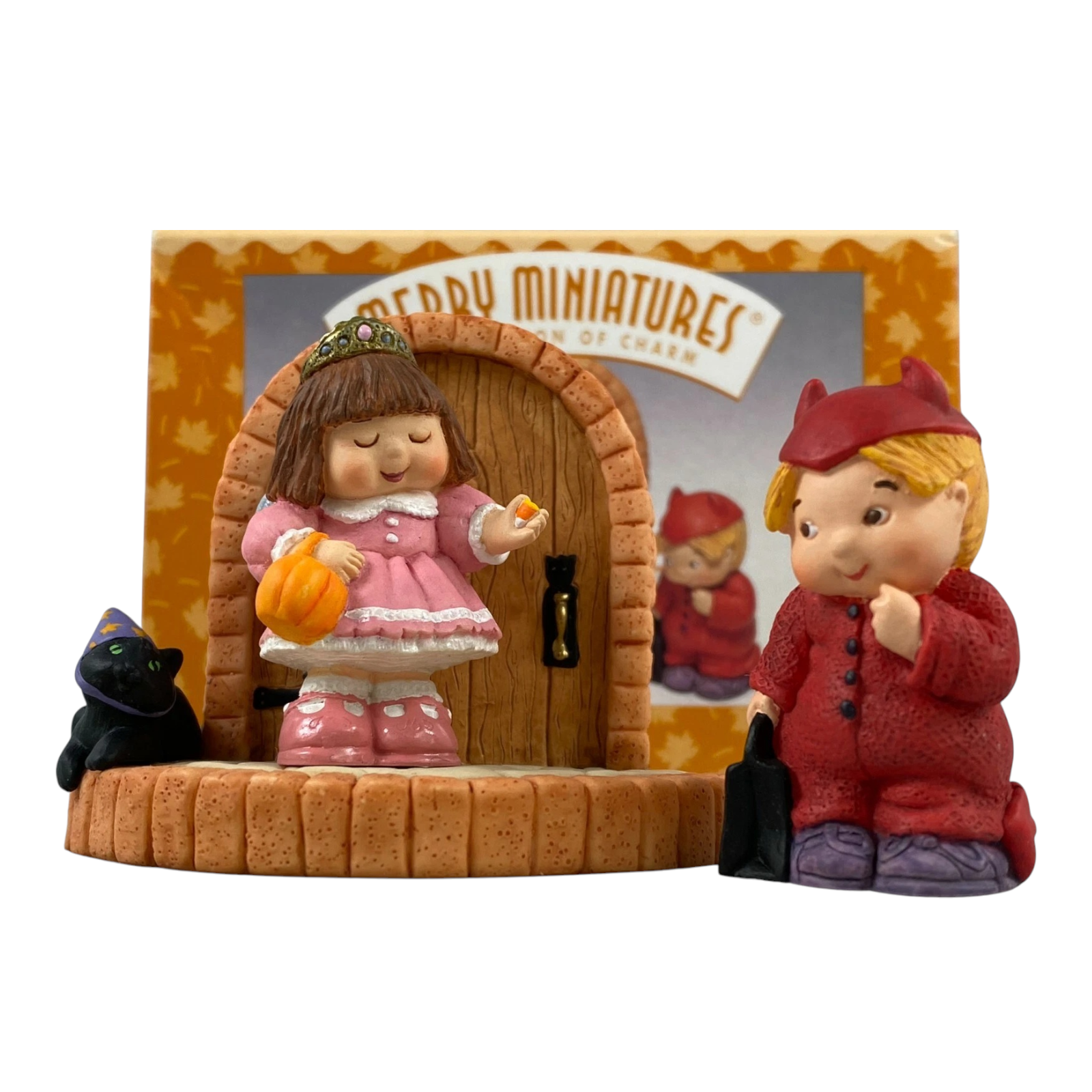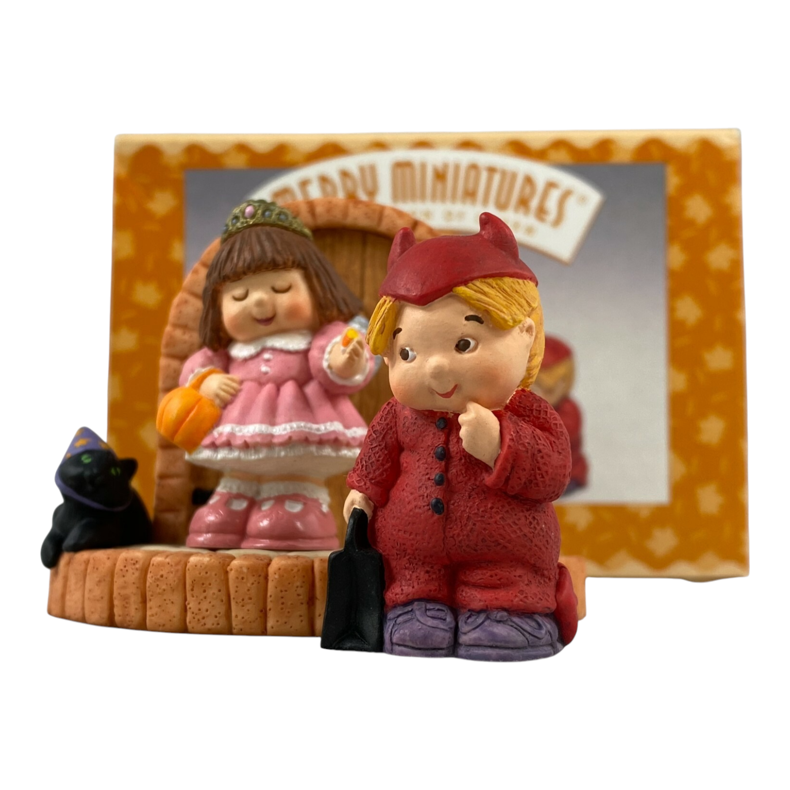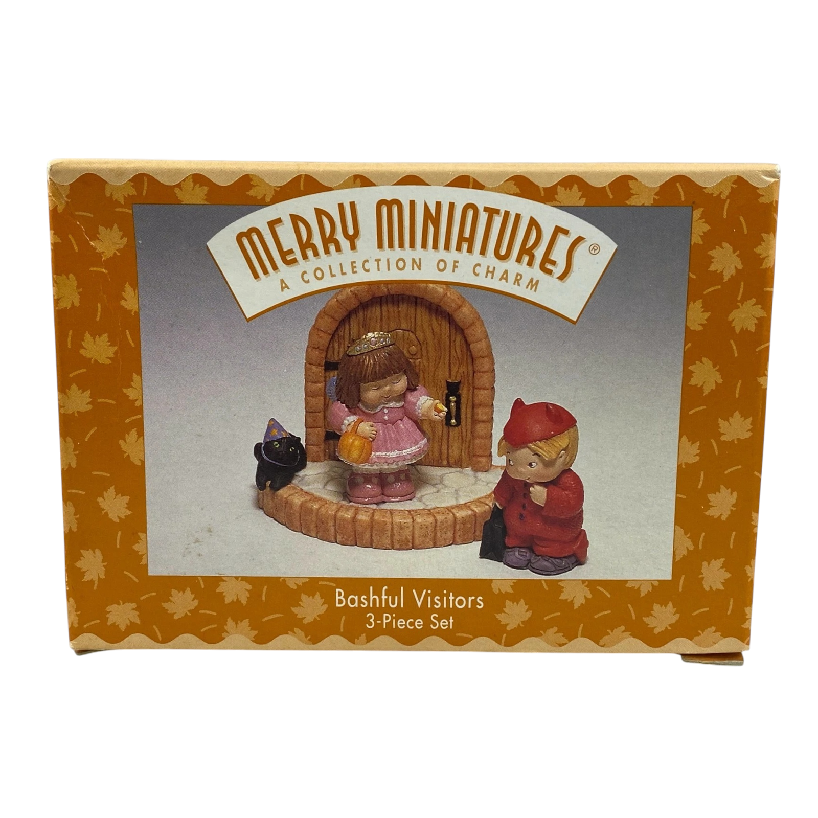 This miniature three-piece set from the “Merry Miniatures” line captures a whimsical Halloween trick-or-treat moment: two bashful little children in costumes (a girl and a boy) accompanied by a “visiting” themed piece (commonly a haunted door or porch accessory) in miniature scale. Ideal for collectors of Halloween décor, miniature figurines, or Hallmark’s seasonal lines, this set blends charm and nostalgia in a compact format. The pieces are sized to display on a shelf or within a seasonal vignette. According to a listing, the set is described as “3-Piece Set” in the 1997 Hallmark listing.