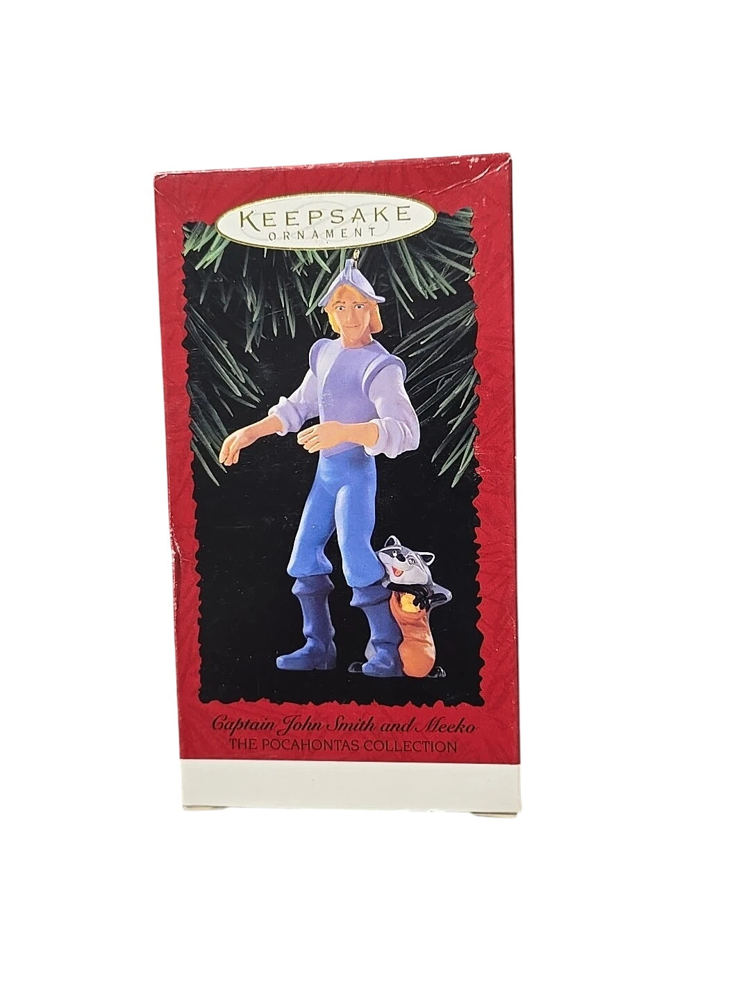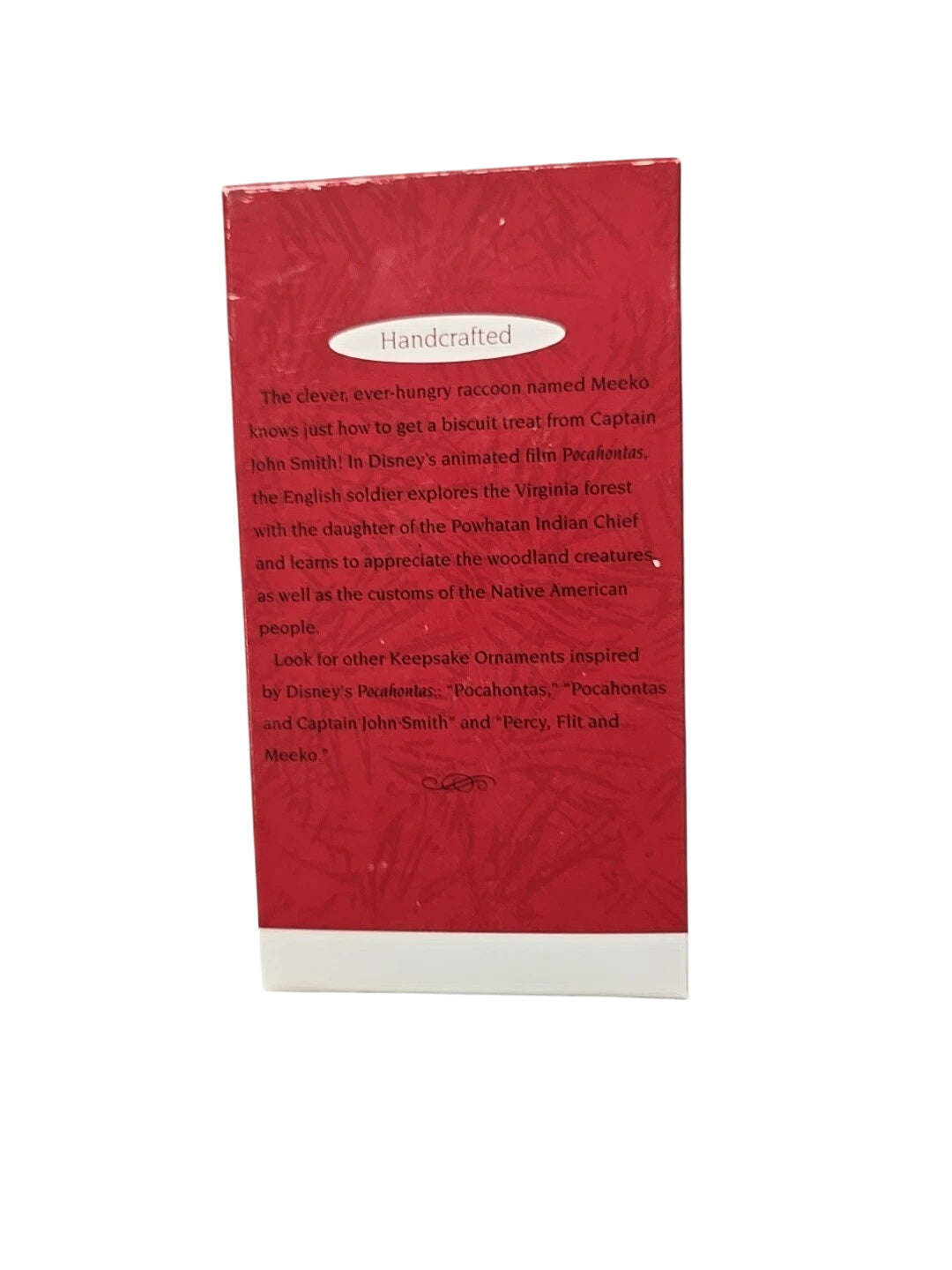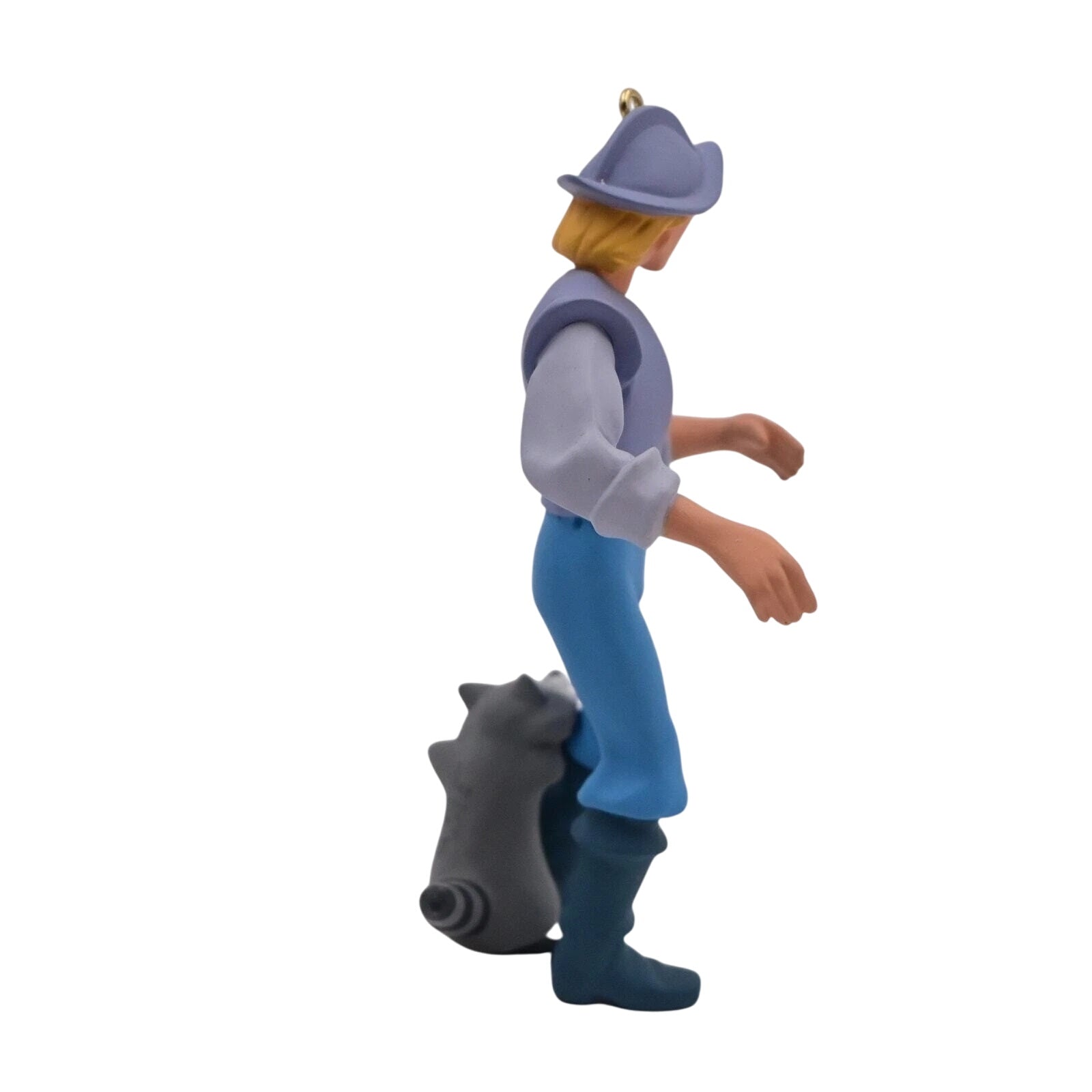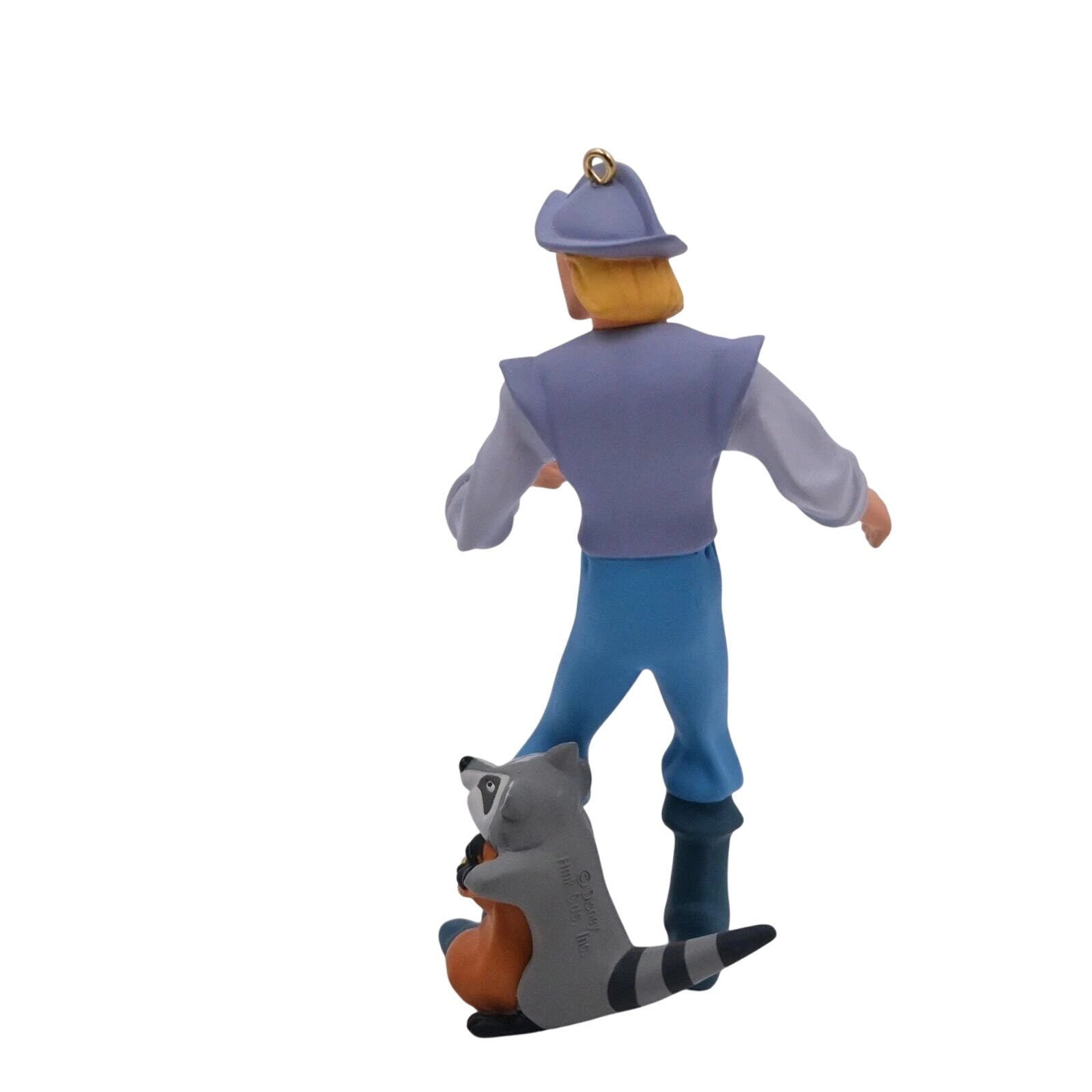 In this delightful ornament from 1995, Captain John Smith stands in full colonial attire accompanied by the mischievous raccoon Meeko from Disney’s Pocahontas, as Meeko eyes a treat in Smith’s hand. Designed to capture their playful friendship, the ornament is finely painted with vivid detail and measures about 4-3/8″ high.