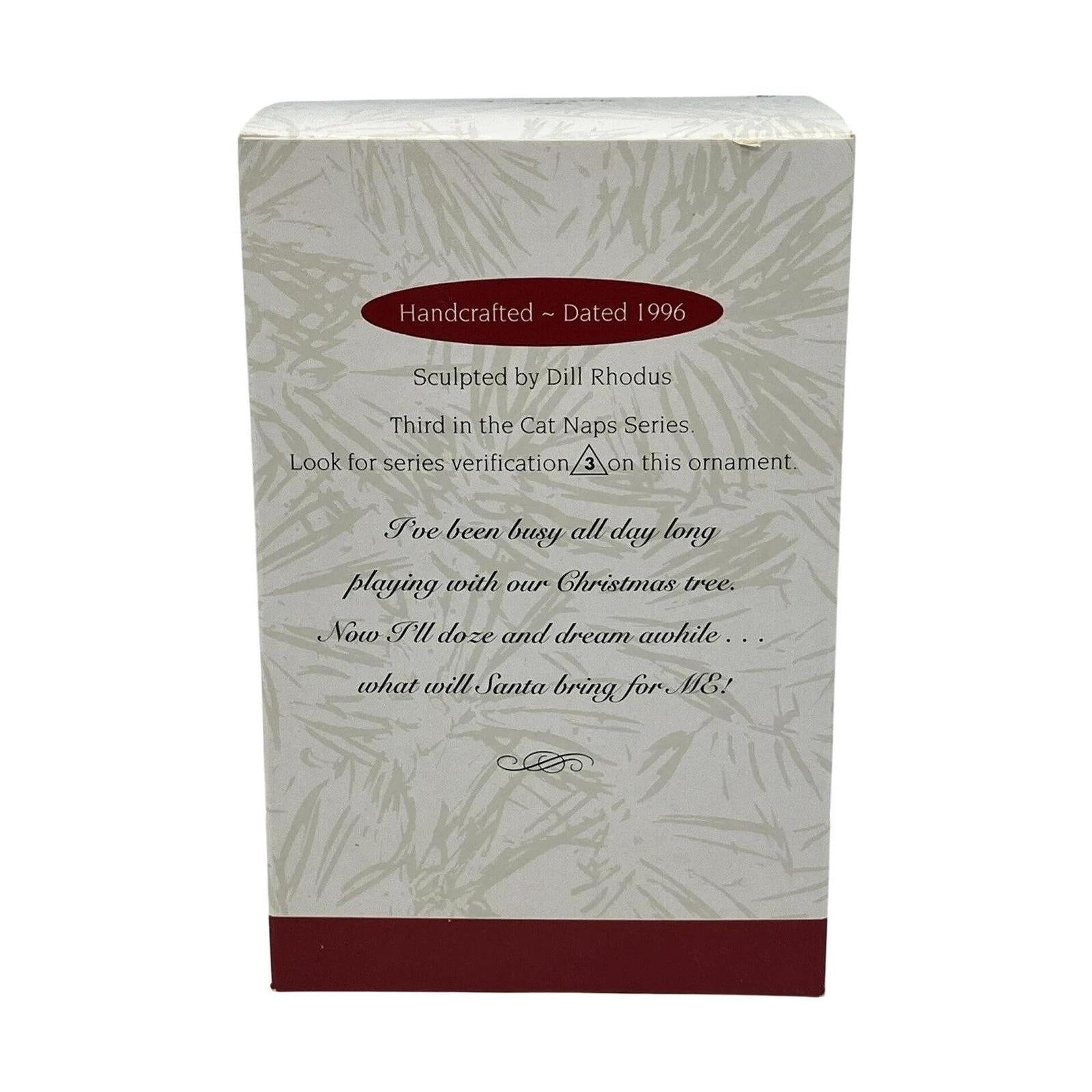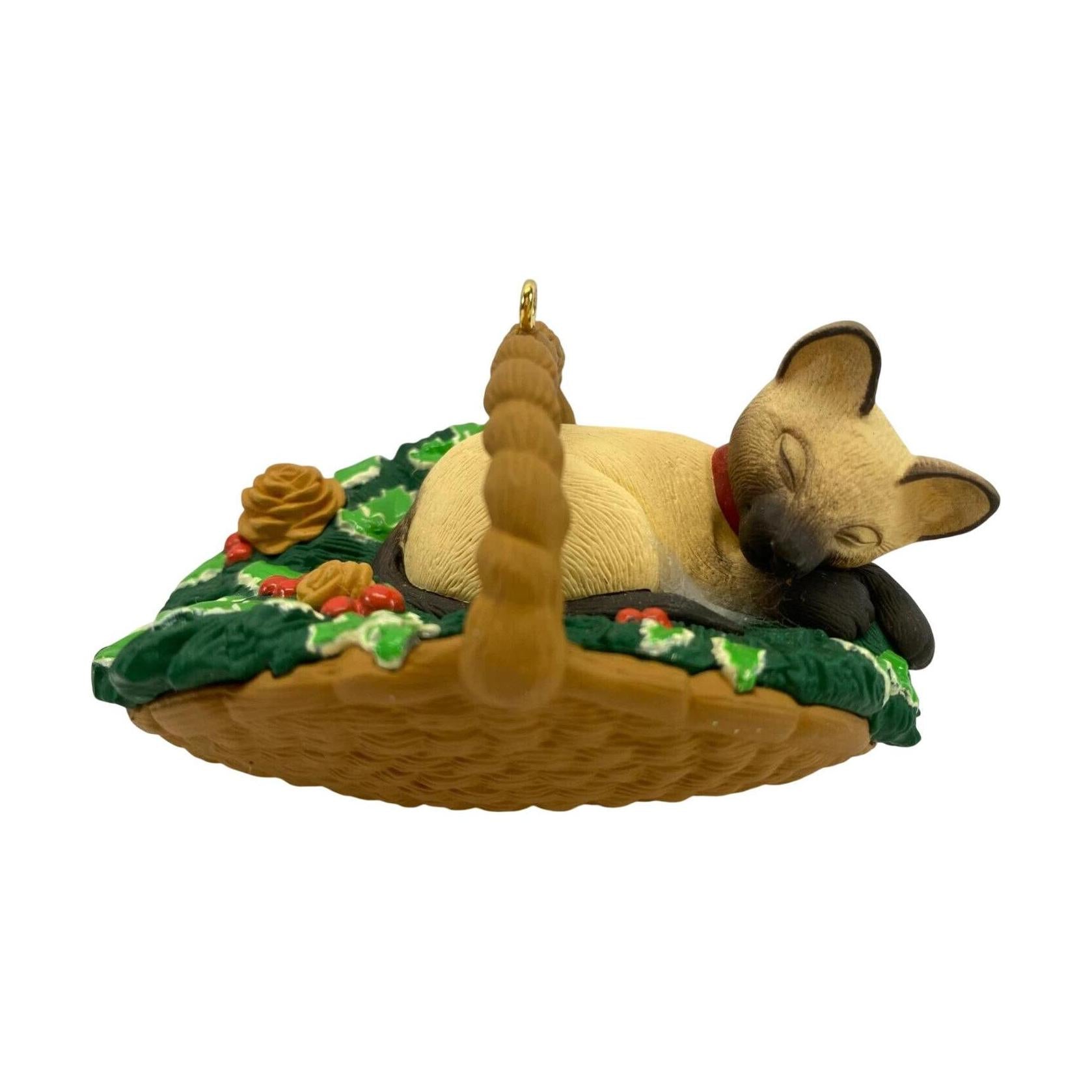 Snag some nostalgic feline charm with this adorable Cat in a Basket Keepsake ornament from Hallmark’s Cat Naps Collector’s Series. Released in 1996 as the series’ third entry, it features a peaceful Siamese kitten asleep atop a green quilt in a wicker basket—blissfully curled among festive holiday accents. Crafted by artist Dill Rhodus, this petite treasure is new-in-box and needs no power—just hang and enjoy the warmth of a sleepy season.