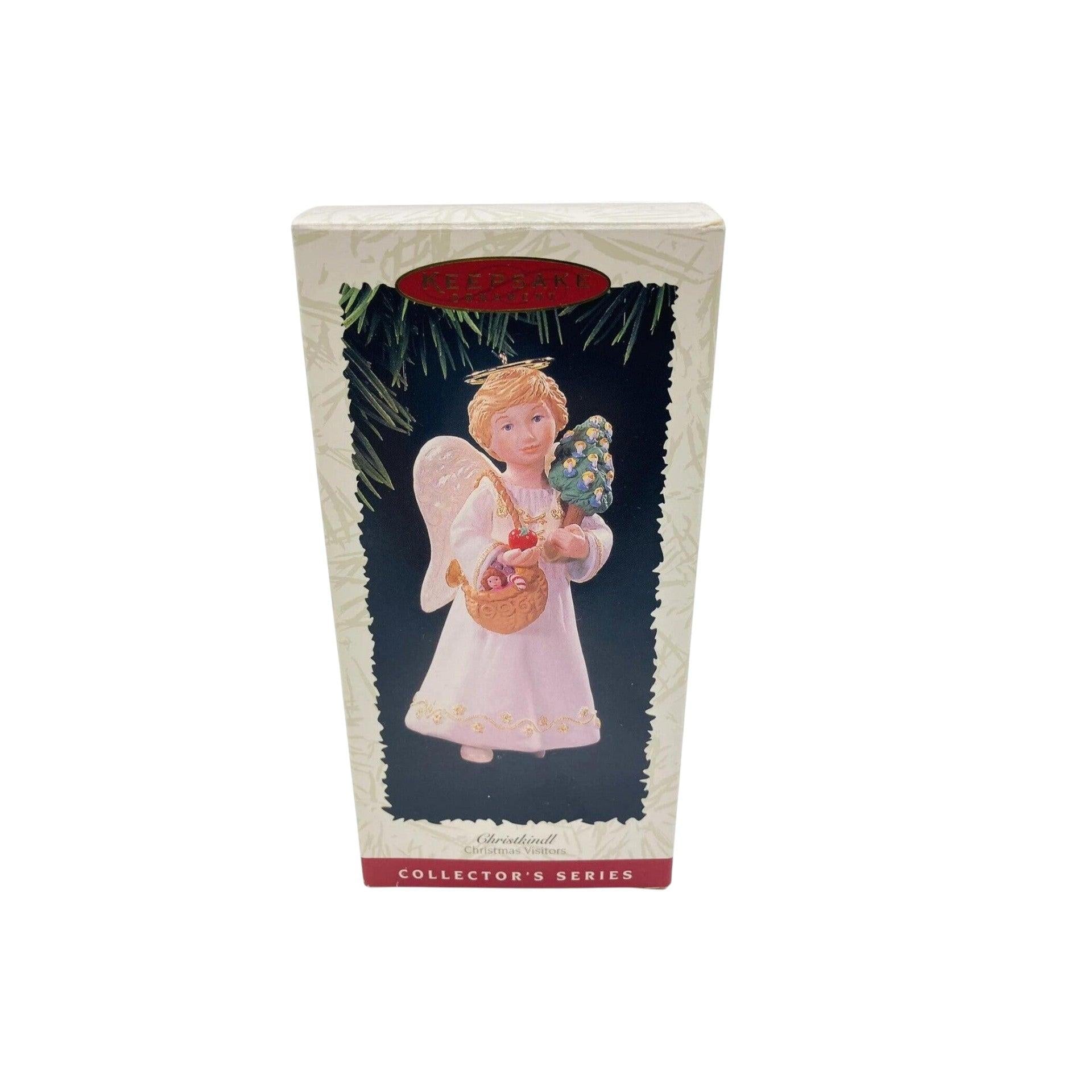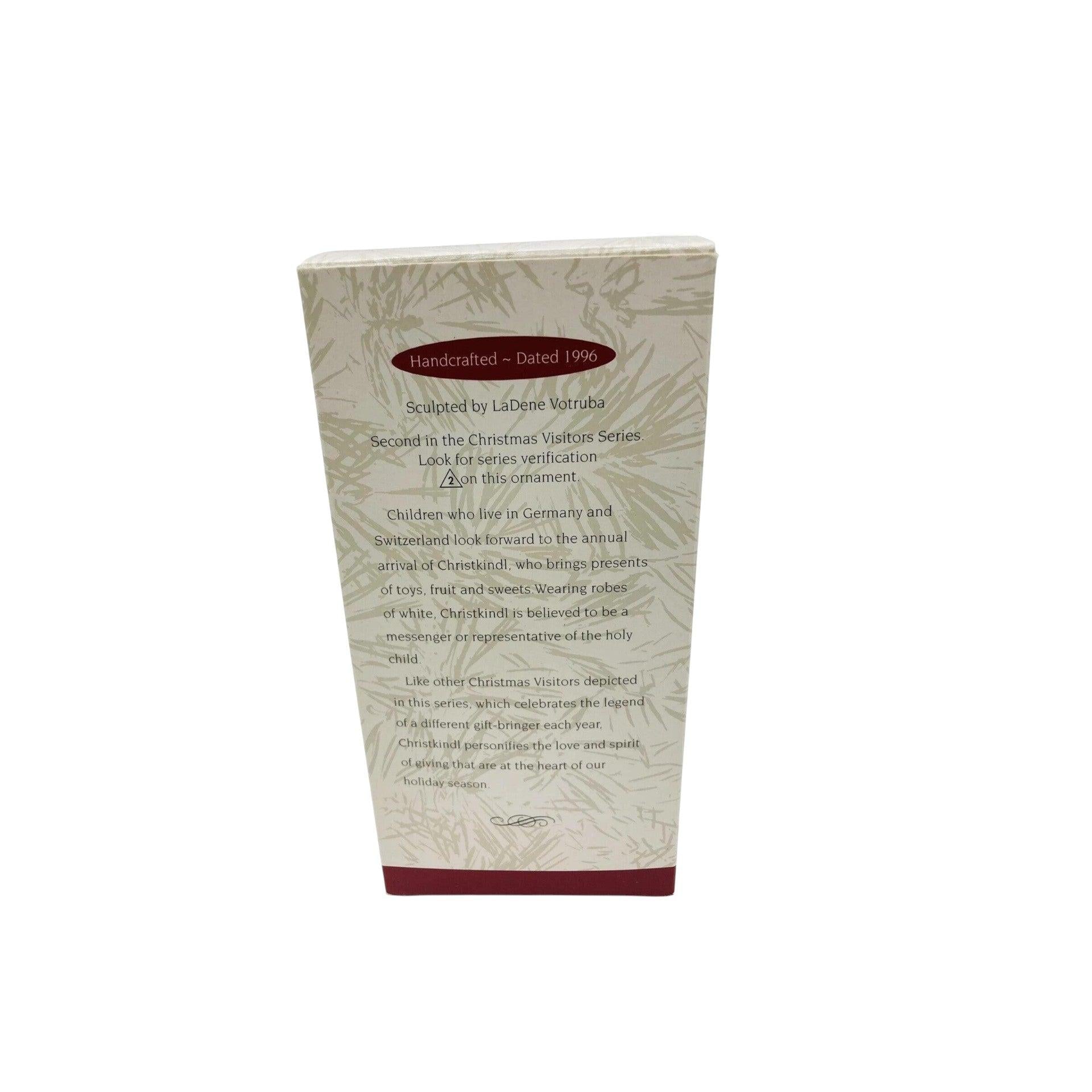 Celebrate the timeless joy of giving with Christkindl, the second ornament in Hallmark’s Christmas Visitors series, released in 1996. This angelic figure—sculpted by award-winning artist LaDene Votruba—depicts a serene Christkindl holding a slender evergreen tree and a basket brimming with holiday treats. Crafted from mixed materials and hand-painted with delicate detail, this keepsake arrives mint-in-box and requires no power—just hang and let the spirit of holiday tradition shine through.
