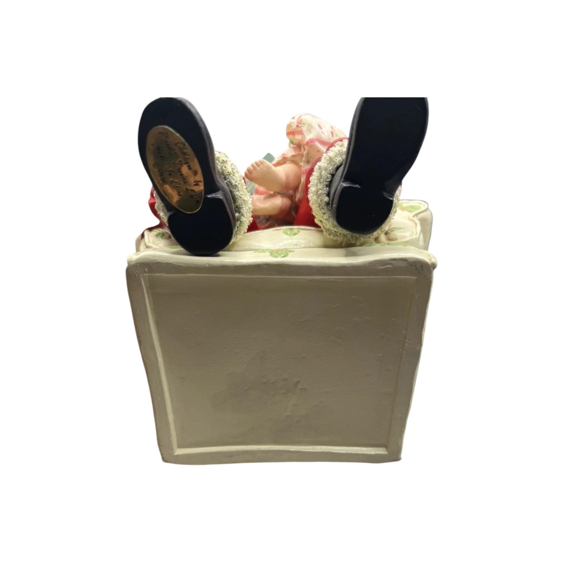 This vintage collectible figurine depicts a heartwarming holiday moment where Santa Claus is seated, reading a Christmas story to a child who listens with rapt attention — capturing the nostalgic joy of storytelling during the season. The figure is crafted in the iconic Clothtique style, with fabric clothing layered over sculpted and hand-painted features that give it a distinctive, lifelike charm. The package typically includes the figure itself, and many sold examples come with the original box and possible protective packaging when available from sellers. This piece does not require any power, lights, or batteries — it’s a purely decorative collectible ideal for display on mantels, shelves, or holiday vignette scenes.
