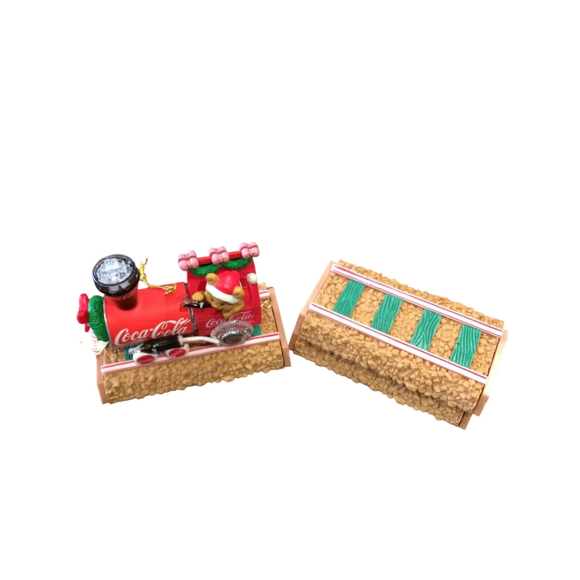 All aboard for holiday refreshment with the 1996 Enesco “Coca-Cola Choo Choo” ornament! This festive collectible features a cheerful Santa Claus at the helm of a bright red Coca-Cola train engine, complete with vintage logos, toy details, and a classic bottle of Coke in hand. Hand-painted with vibrant holiday colors, this piece beautifully combines Coca-Cola nostalgia with Enesco’s renowned craftsmanship. Perfect for train lovers, Coke memorabilia collectors, and holiday enthusiasts alike, this ornament captures the fun and spirit of a truly classic Christmas.