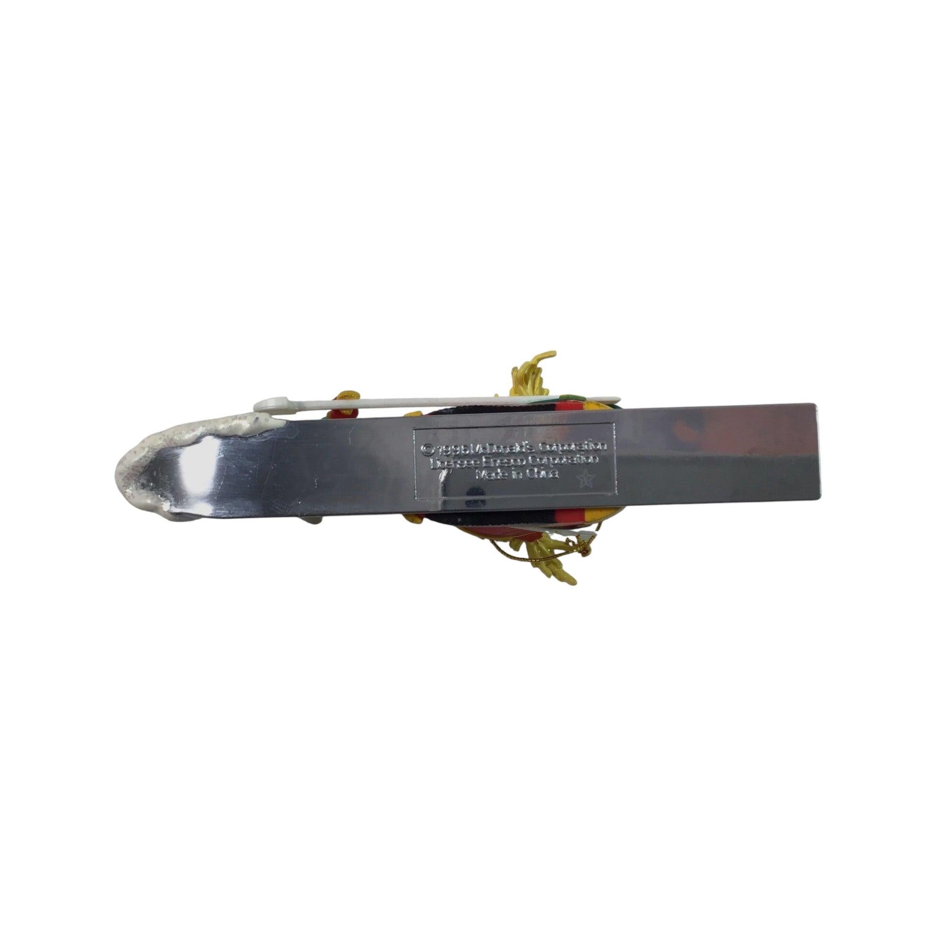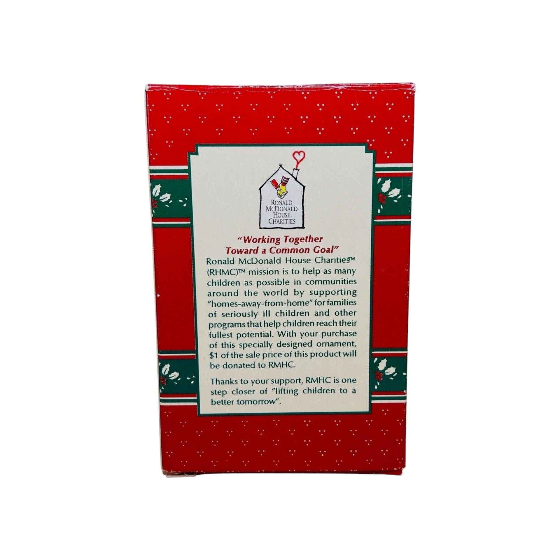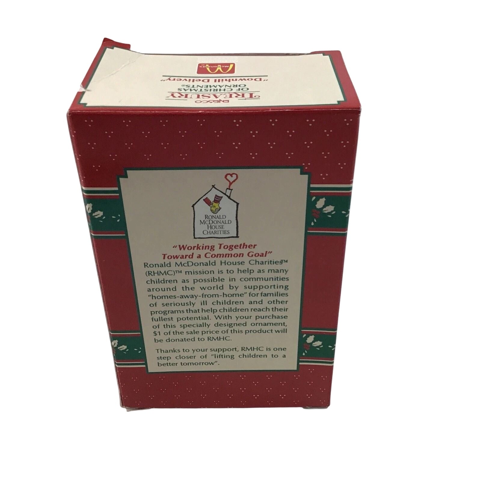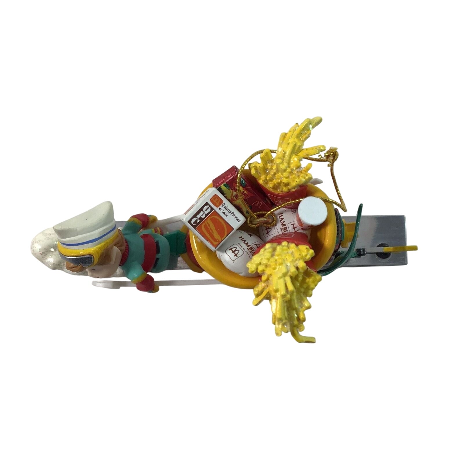 This playful 1996 Enesco ornament features a stylised ski boot packed full of McDonald’s favourite items—fries, hamburgers and apple pies—with a tiny elf skier riding along, symbolising a festive “downhill delivery” of fast-food cheer. Crafted in durable moulded plastic/mixed media with vibrant holiday colours, it blends brand-licence nostalgia and seasonal décor charm. Ideal for collectors of McDonald’s memorabilia, quirky holiday themes or vintage ornament fans, this piece brings unique personality and playful holiday storytelling to any tree or display.