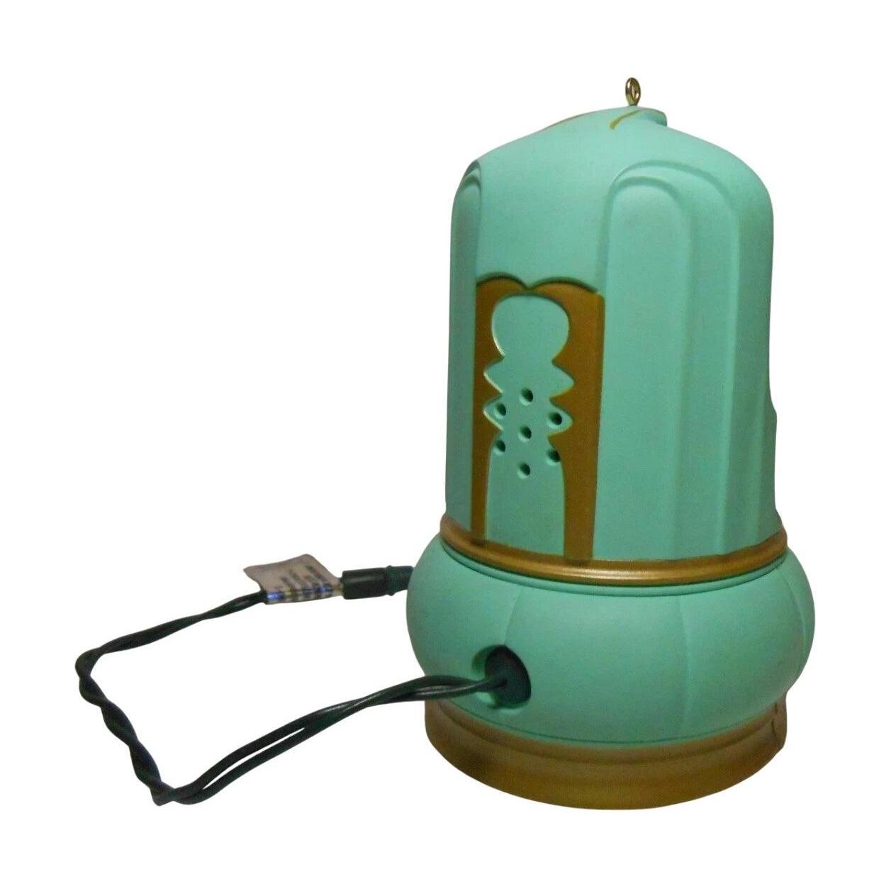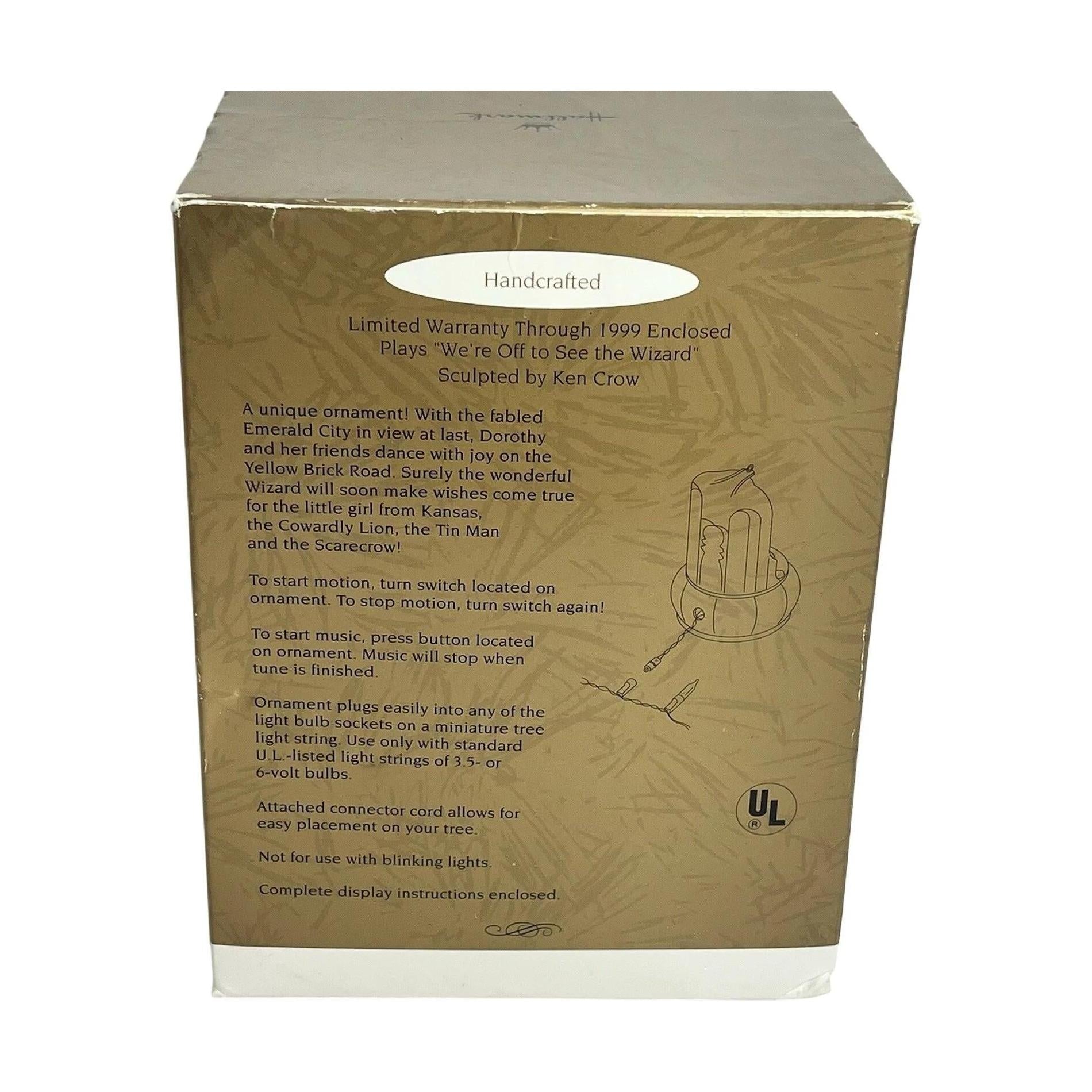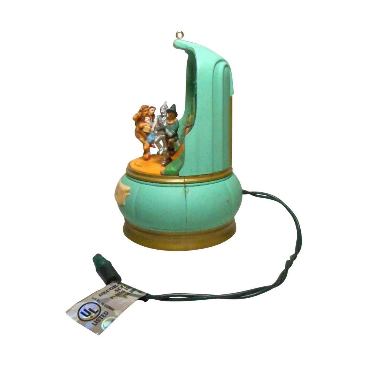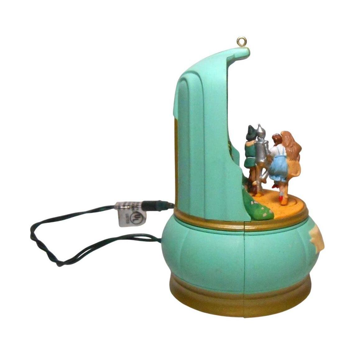 Step into the grandeur of Oz with the 1996 Emerald City ornament from The Wizard of Oz. This Magic ornament showcases Dorothy and her friends dancing along the Yellow Brick Road as the skyline of the Emerald City lights up under motion. With a switch at the base to control movement, and a dedicated button to play music from the film, this piece brings sound, light, and motion together.