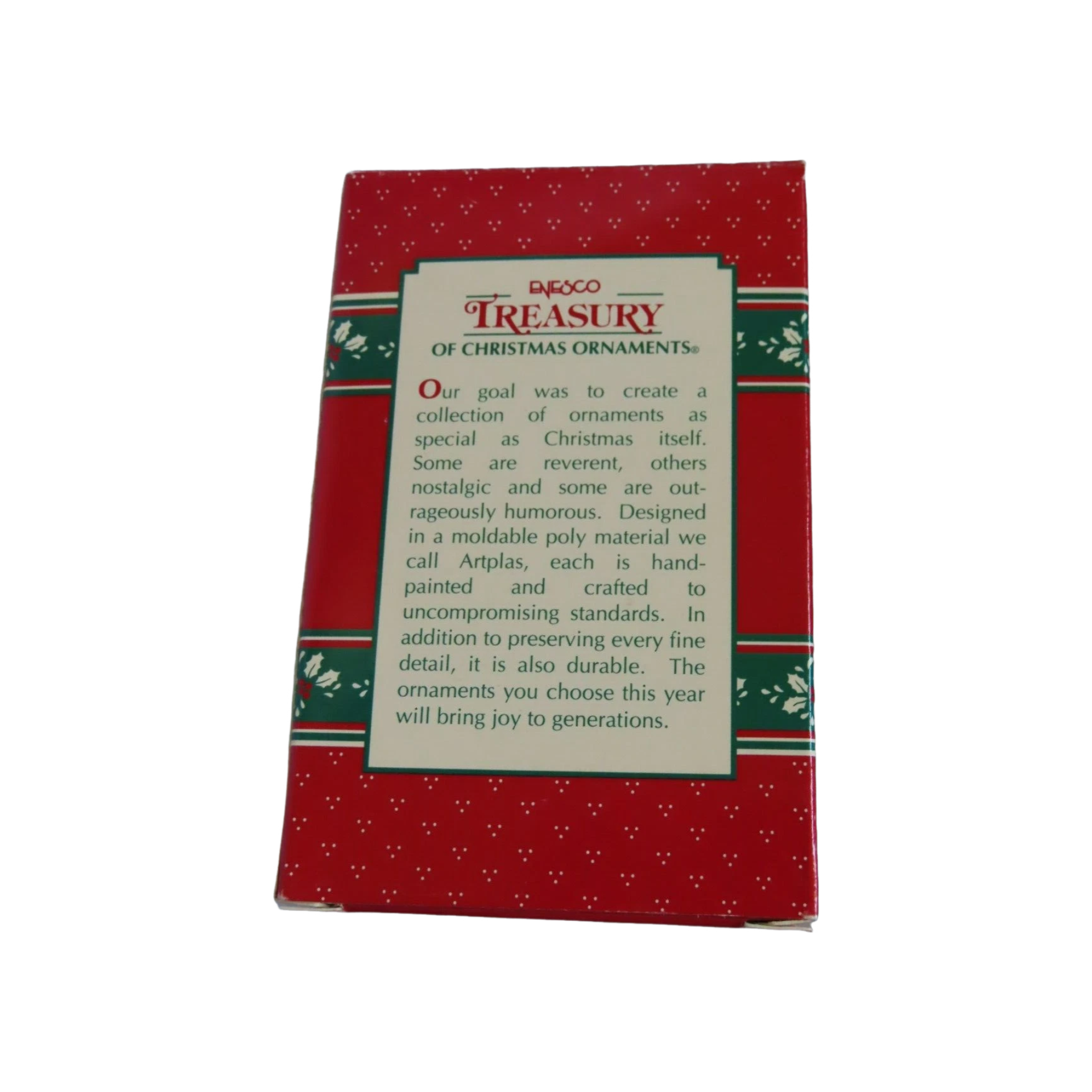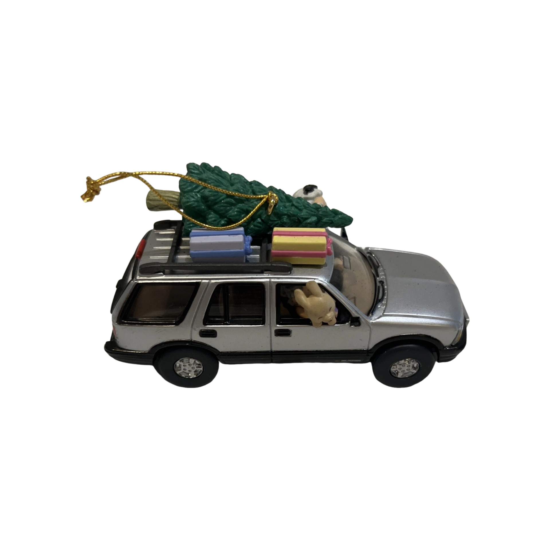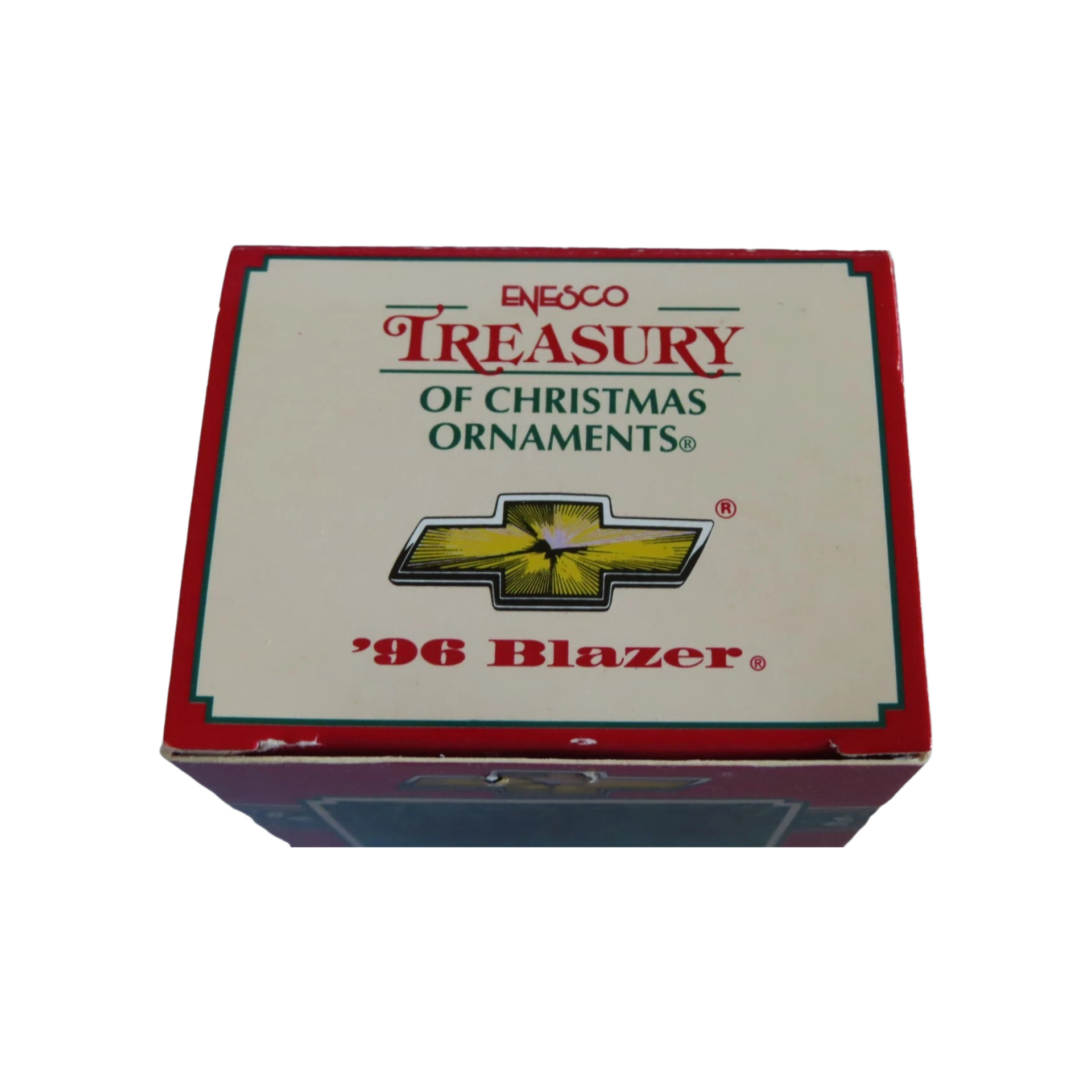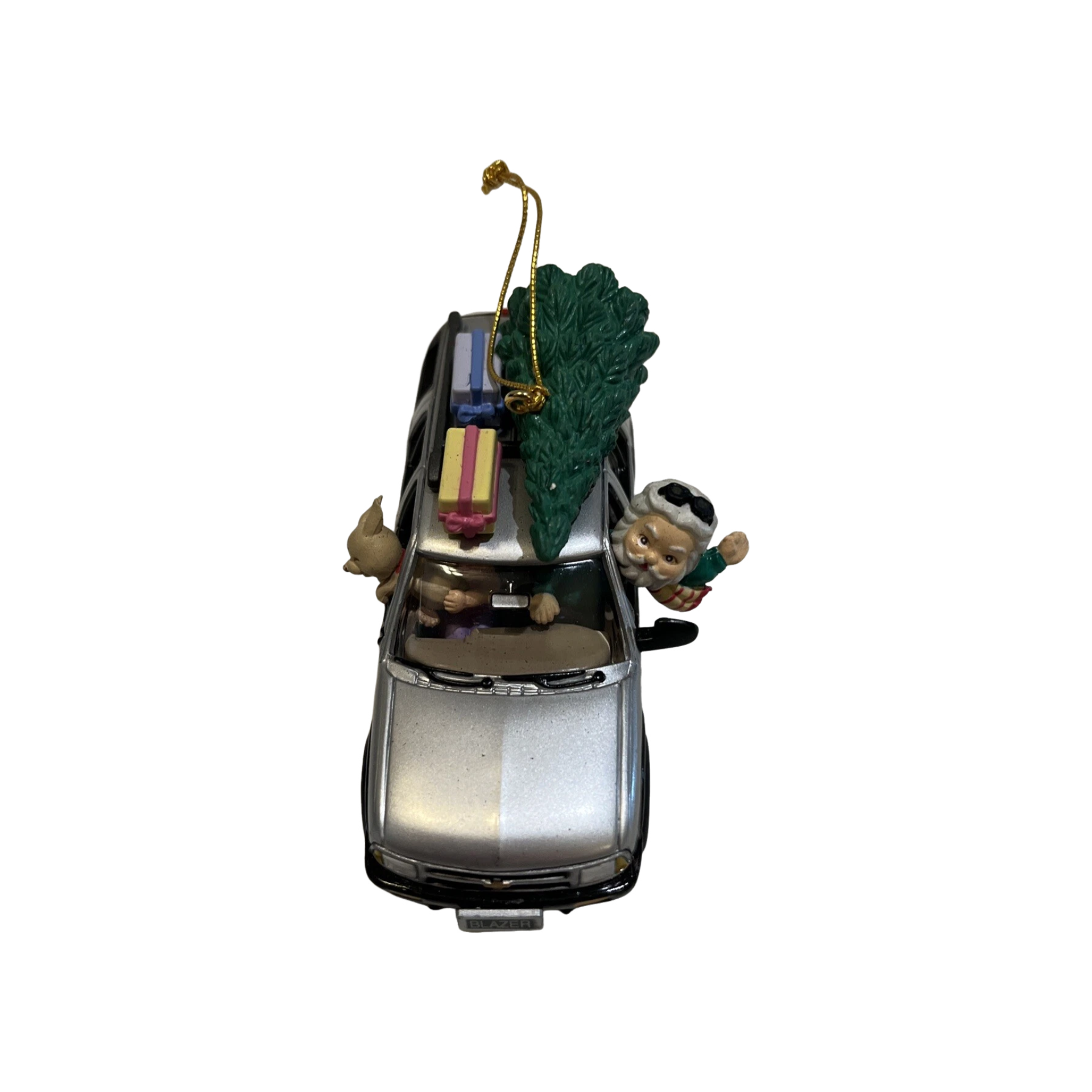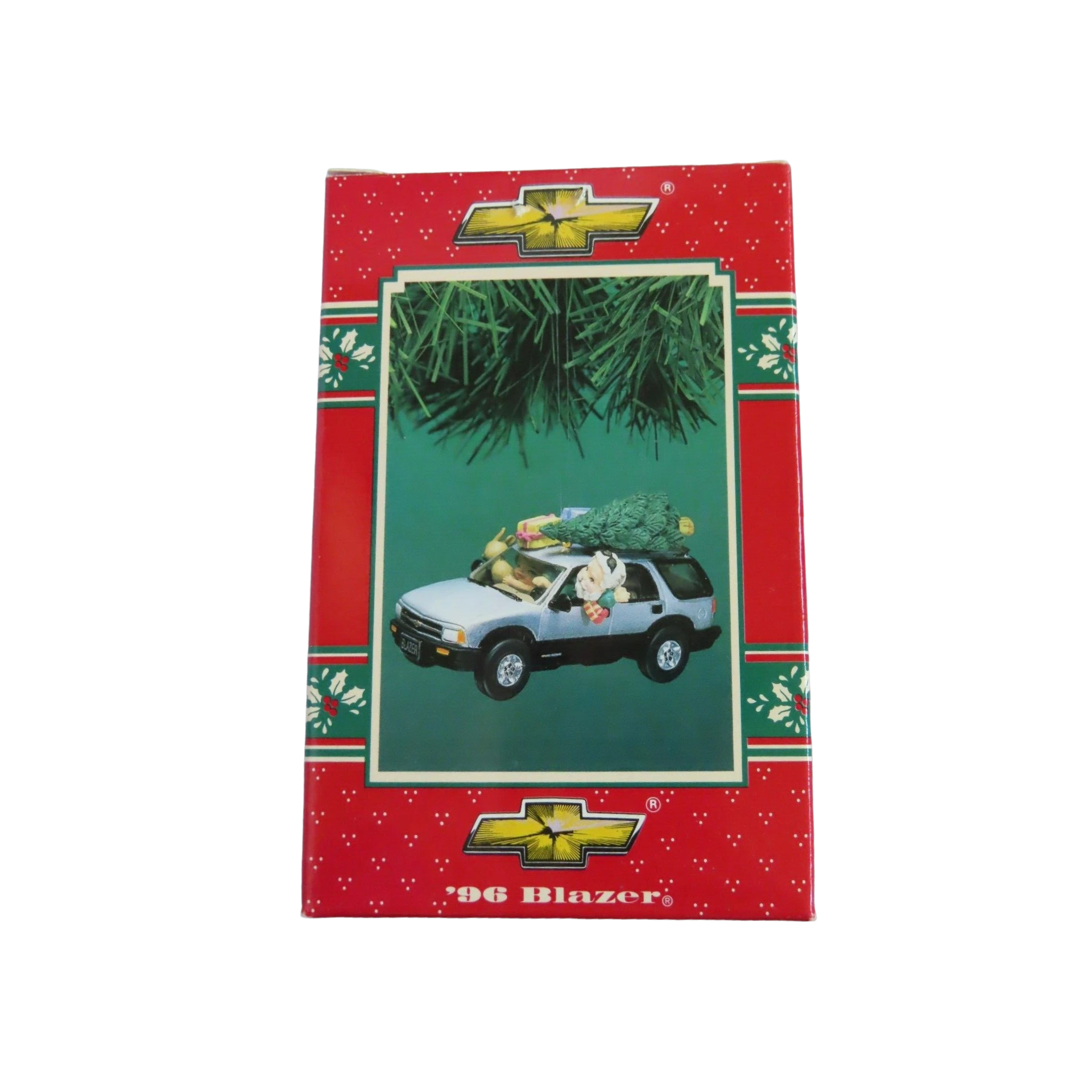 This collectible ornament features Santa behind the wheel of a 1996 Chevrolet Blazer, decked out for the holidays with a Christmas tree strapped to the roof and brightly wrapped presents aboard. The detailing includes realistic SUV styling—grille, roof rack, classic Blazer silhouette—combined with festive accents and Santa’s cheerful presence. Released as part of Enesco’s vehicle-themed “Treasury of Christmas” line, it blends automotive nostalgia with holiday spirit. Whether you’re a classic Chevy enthusiast or a collector of vintage Christmas décor, this piece brings playfulness, detail and seasonal charm to your tree or display.