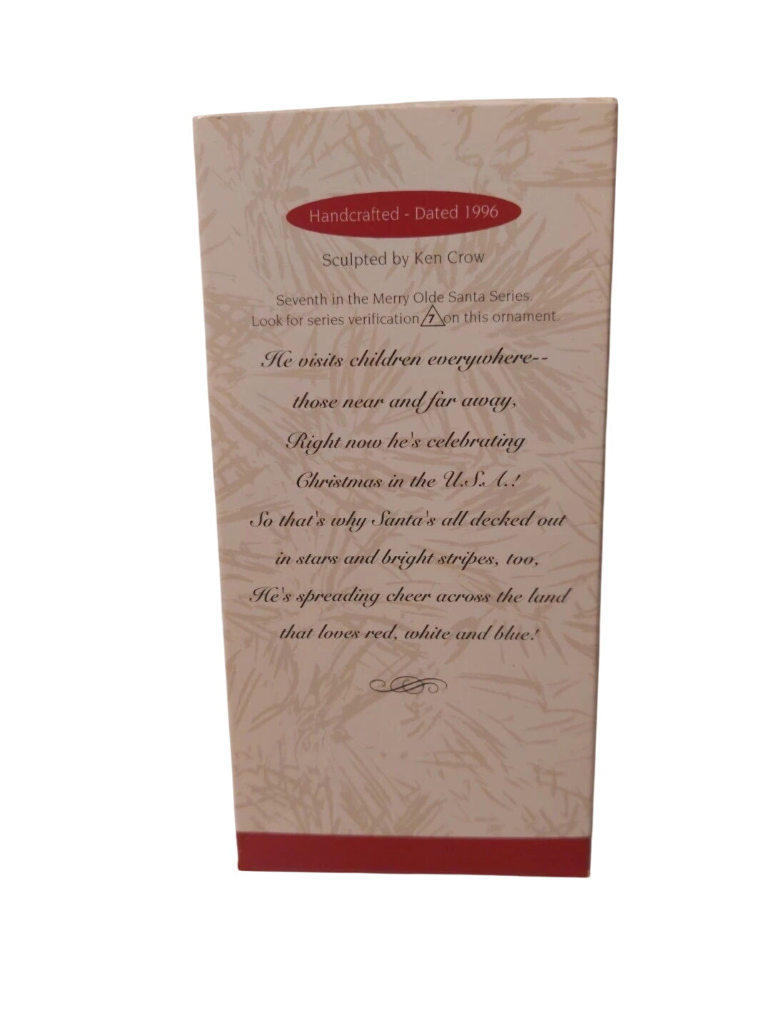 The 1996 Fourth of July ornament (Merry Olde Santa #7) features Santa dressed in vibrant red, white, and blue, holding a miniature American flag along with a drum, doll, and a toy-filled sack, celebrating patriotic spirit alongside holiday cheer; it normally includes the ornament itself, often with its original box and the Hallmark tag, and since this is a Keepsake decorative piece, no batteries, cords, or lights are needed to enjoy its festive design.