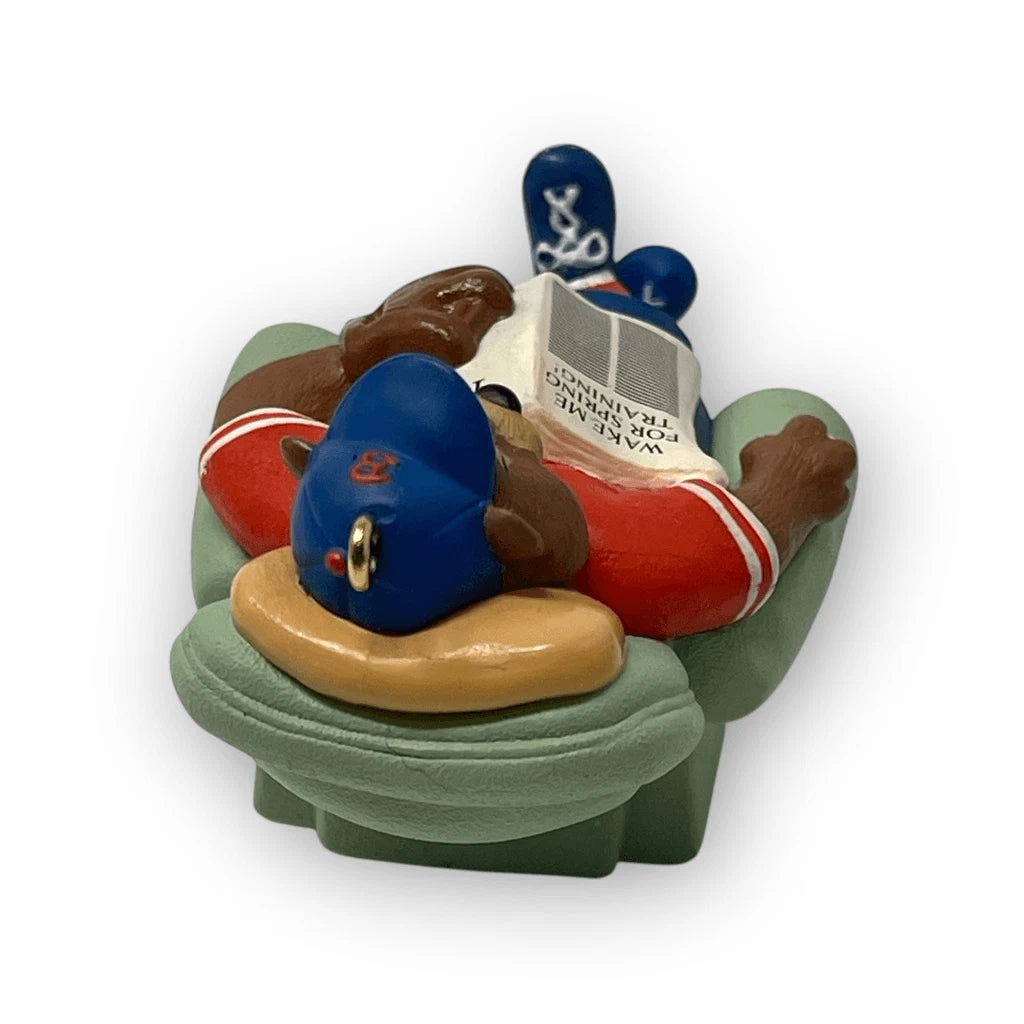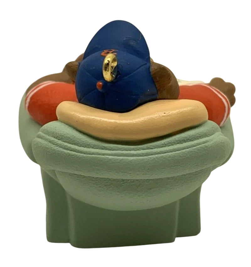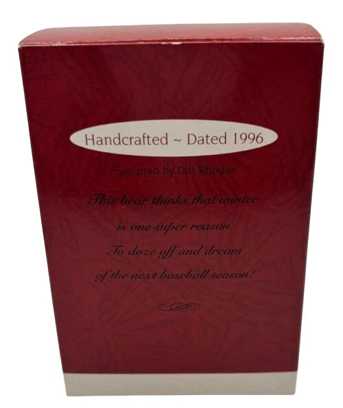 The 1996 edition of the Keepsake series features a relaxed Papa Bear lounging in his favourite recliner, baseball glove in hand and a newspaper headline reading “WAKE ME FOR SPRING TRAINING”. The figure is sculpted with fine detail—showing the bear’s contented pose and the casual winter-theme décor—making it a charming piece for both holiday trees and bear-theme collections. Designed by Dill Rhodus, this ornament highlights a humorous “holiday nap” motif that appeals to collectors seeking unique 1990s pieces. It works well as a stand-alone accent or paired with other animal-themed ornaments.