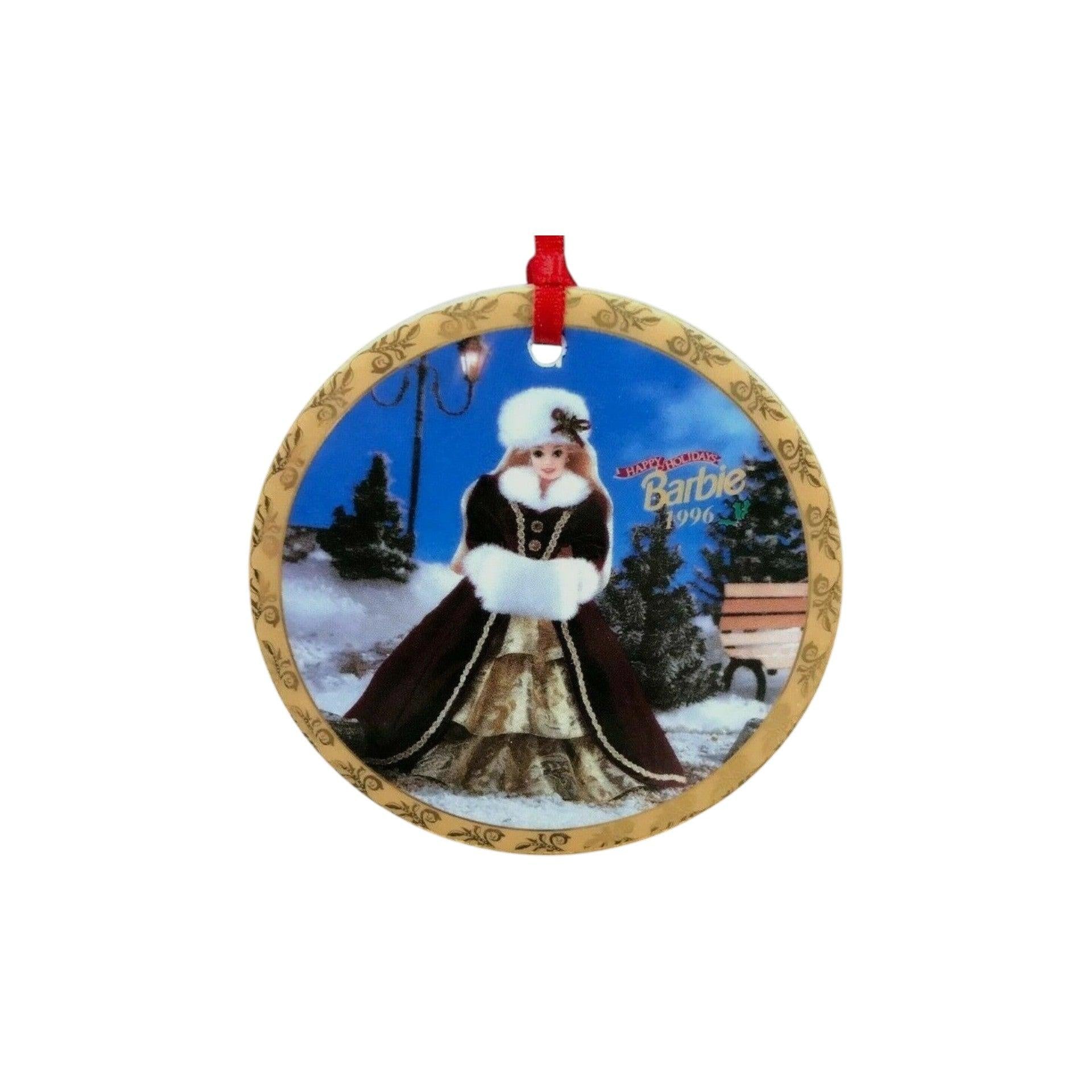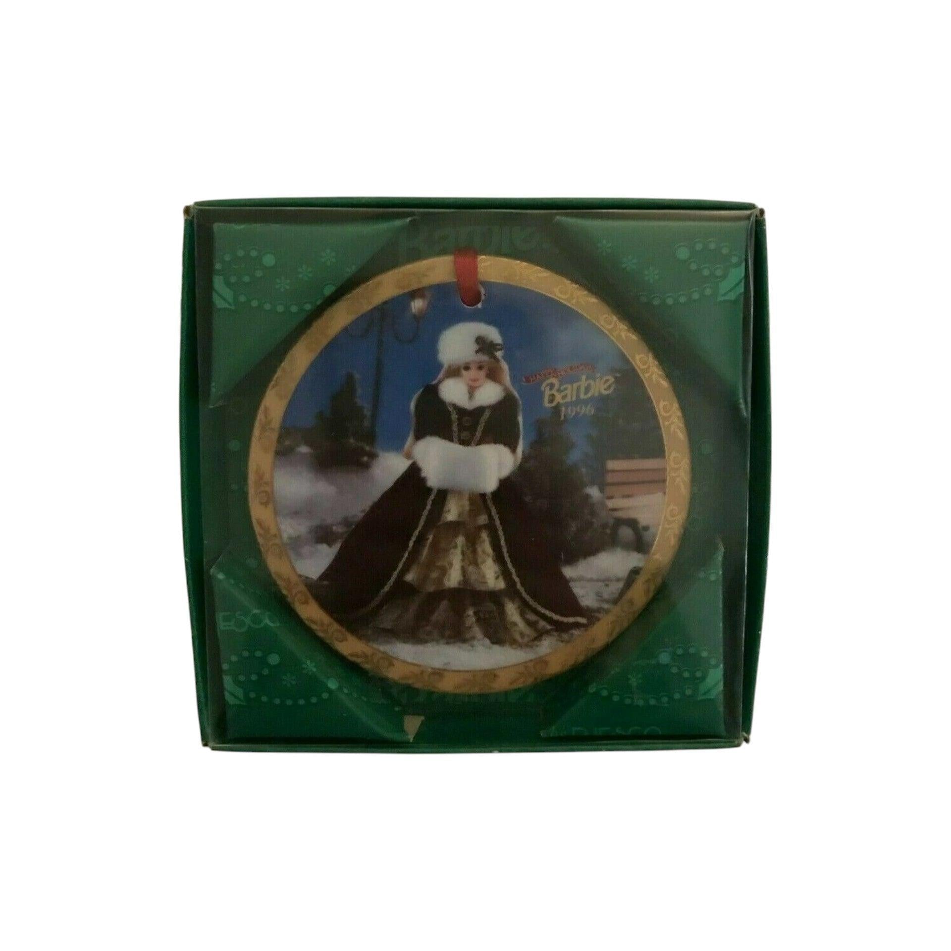 Celebrate timeless holiday elegance with this 1996 “Happy Holiday Barbie” ornament. The piece features the iconic Barbie dressed in a festive burgundy-velvet coat trimmed in white fur and styled for her special holiday moment, crafted by Enesco under licence from Mattel. The ornament is a finely detailed porcelain disc (approx. 3.25″ in diameter) with rich colour and vintage collectible appeal. Its classic design and branded elegance make it an ideal display piece for Barbie enthusiasts, holiday décor lovers, or ornament collectors seeking a premium licensed piece.