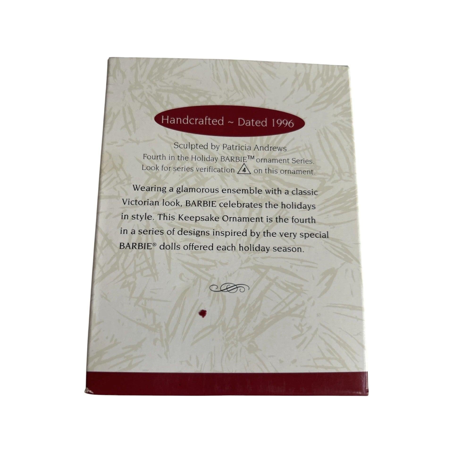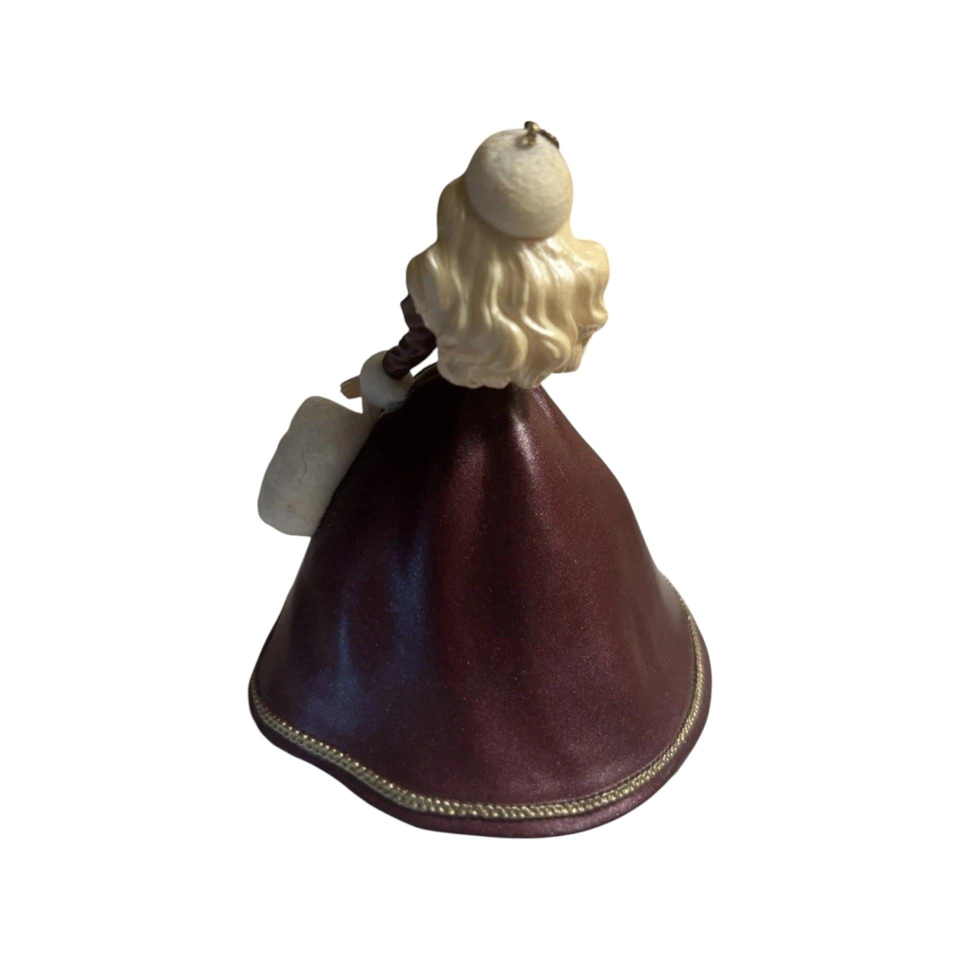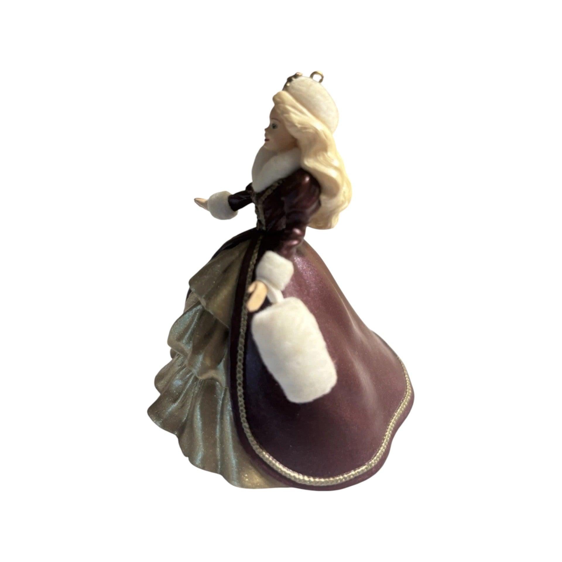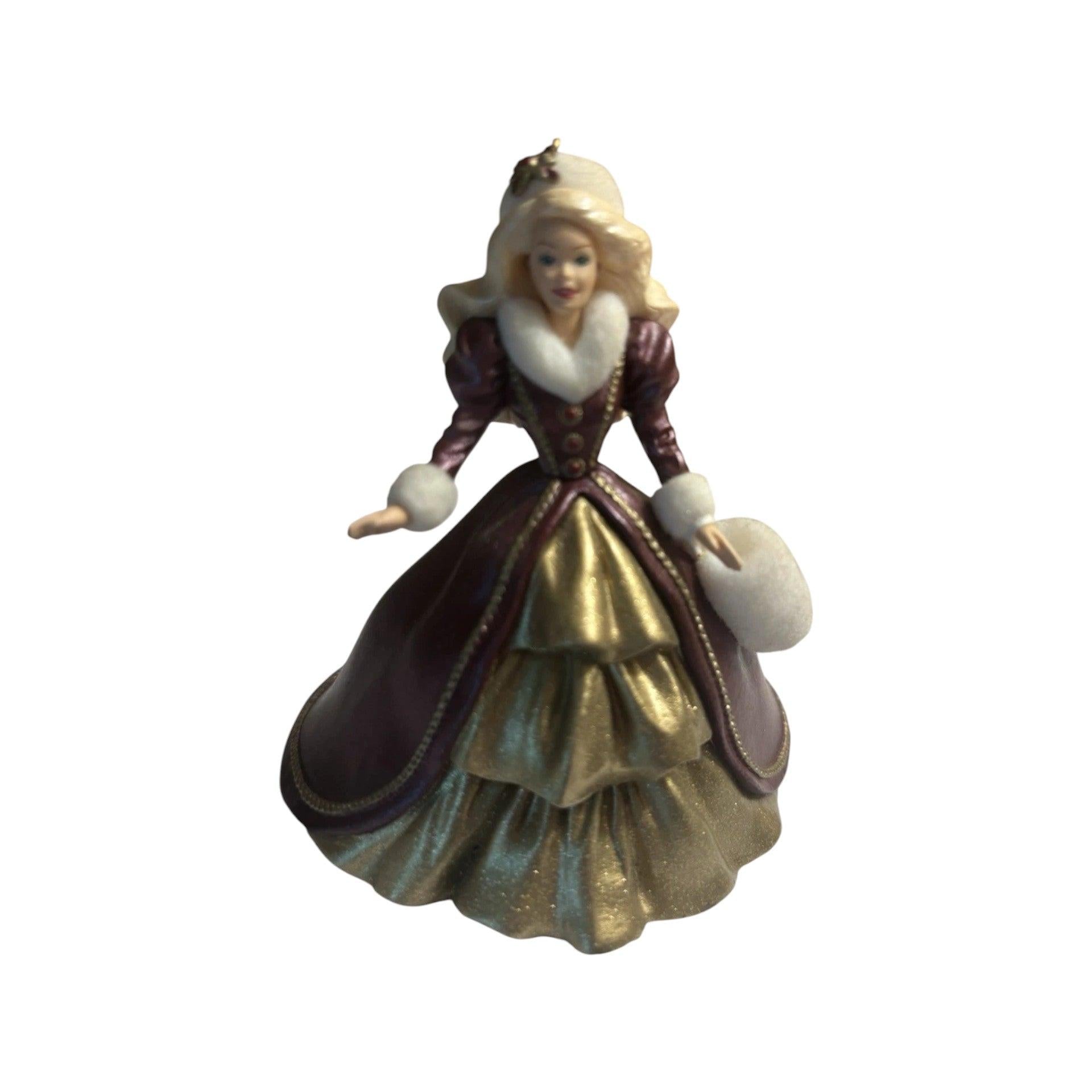 Celebrate elegance in winter wonder with the 1996 Holiday Barbie (Holiday Barbie) ornament—the fourth collectible in Hallmark’s beloved Holiday Barbie series. Arranged for festive charm, Barbie is depicted in a luxurious gold gown and a rich burgundy coat, accessorized with a white fur muff and pillbox hat—ready for the holiday gala. This figure is masterfully sculpted by Patricia Andrews, embodying timeless style and craftsmanship.