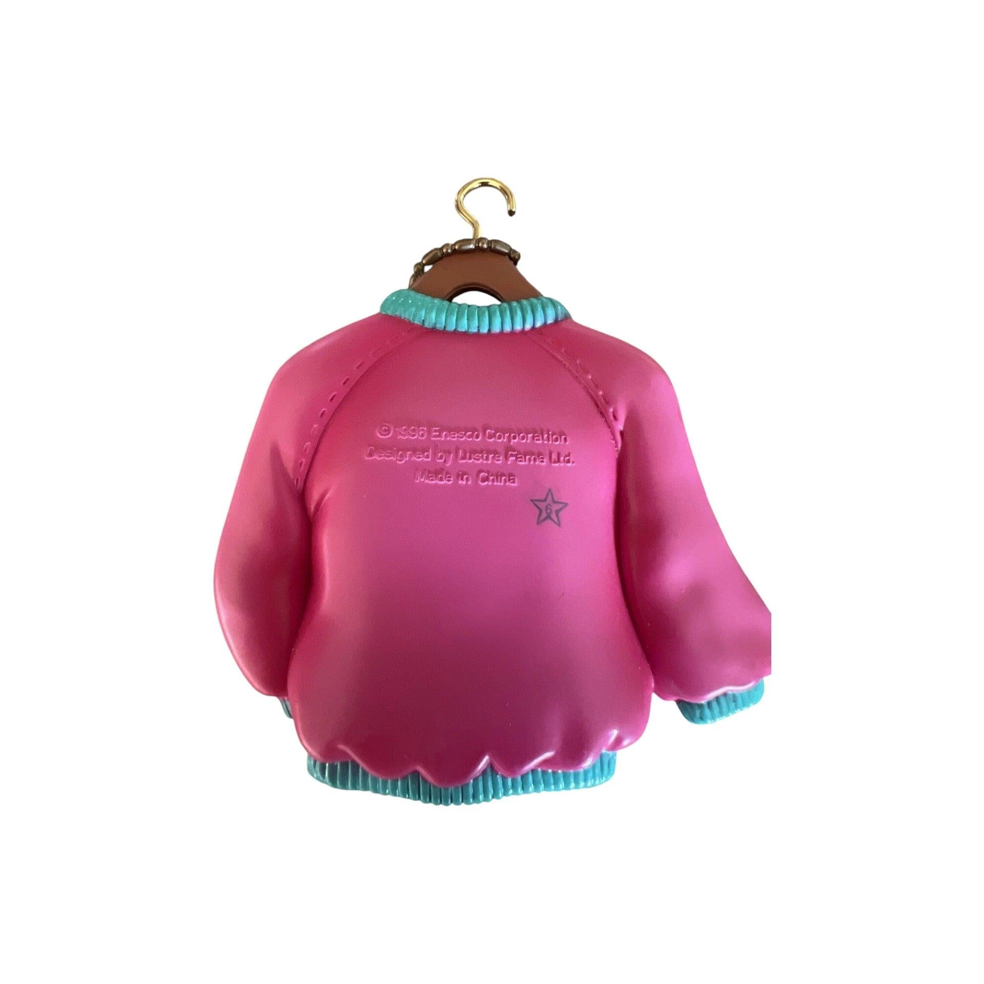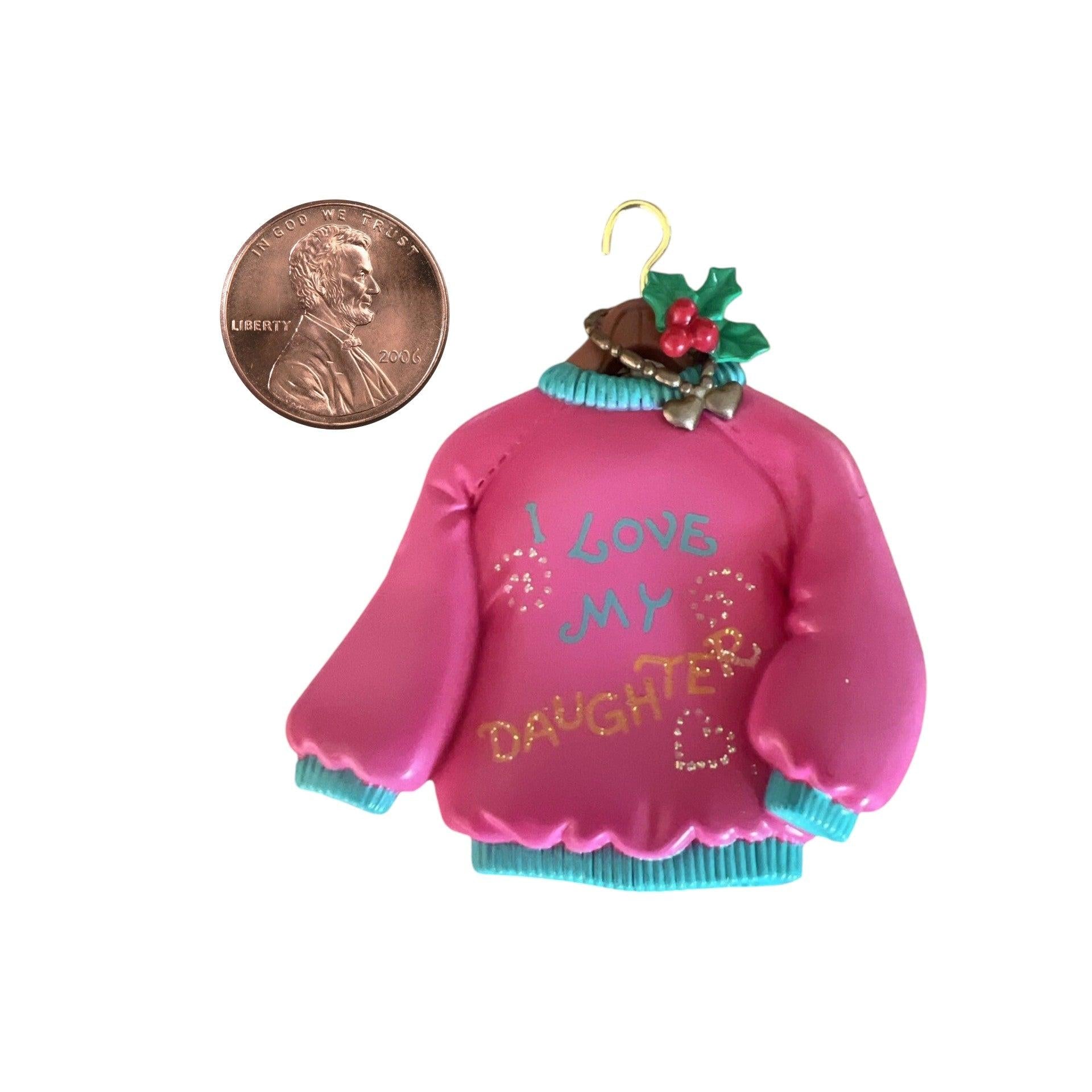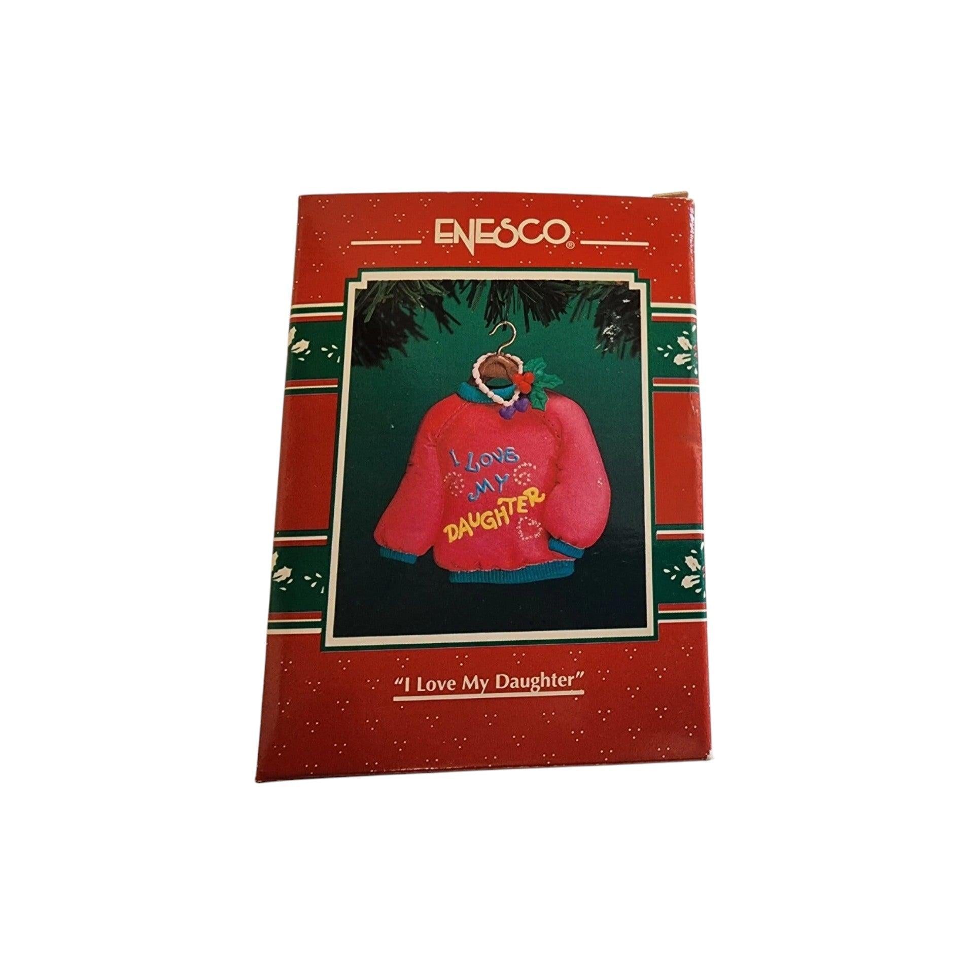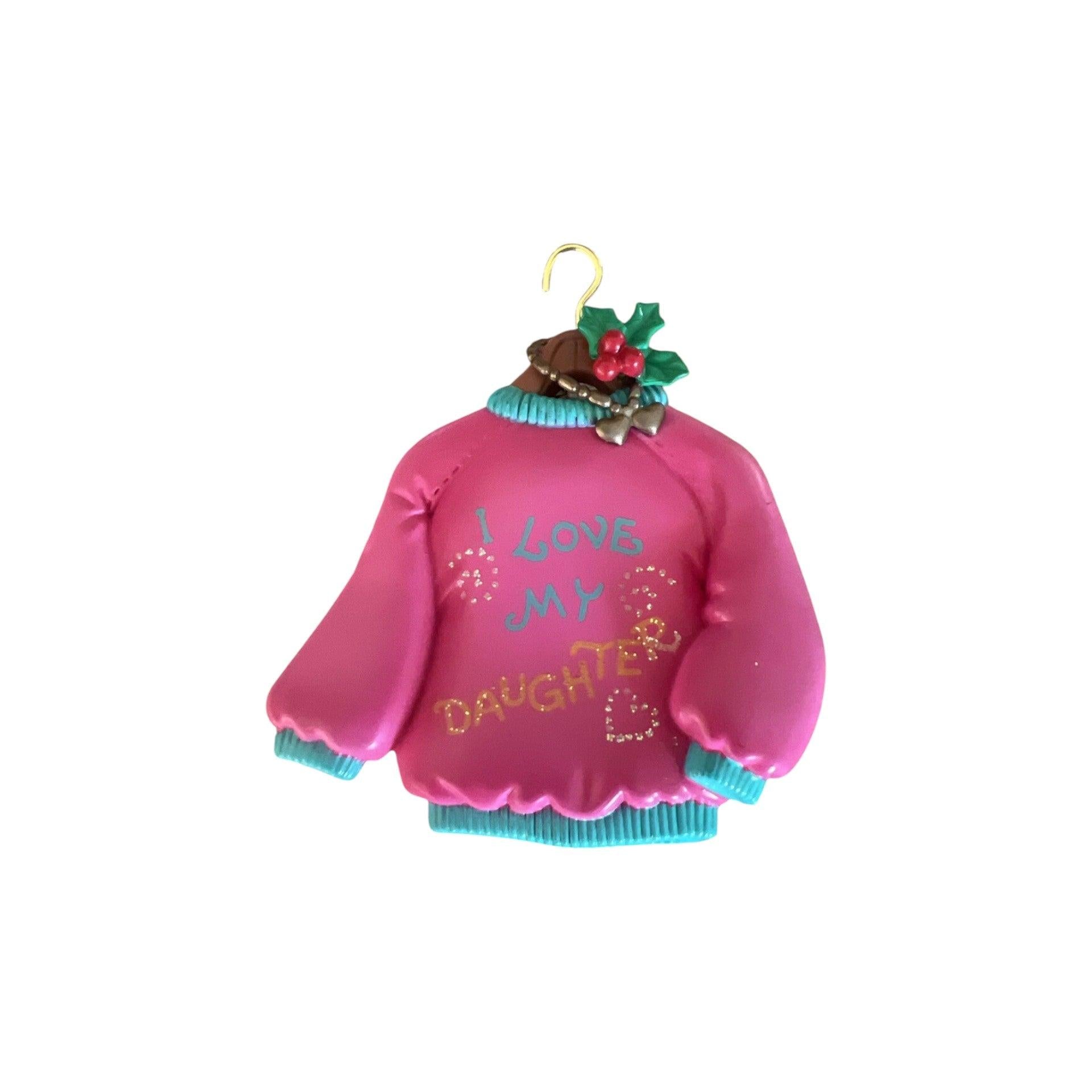 This sentimental 1996 Enesco ornament features a charming design shaped like a pink sweatshirt, hand-painted and decorated with glittery gold lettering that reads “I Love My Daughter.” Sleek and simple in its message, it’s crafted in durable plastic (or resin/plastic blend) with a hanging loop—perfect for gifting, tree-display or as a keepsake to honour the special daughter in your life. The subtle sparkle, nostalgic colour palette and heartfelt wording make it a timeless piece with collector appeal.