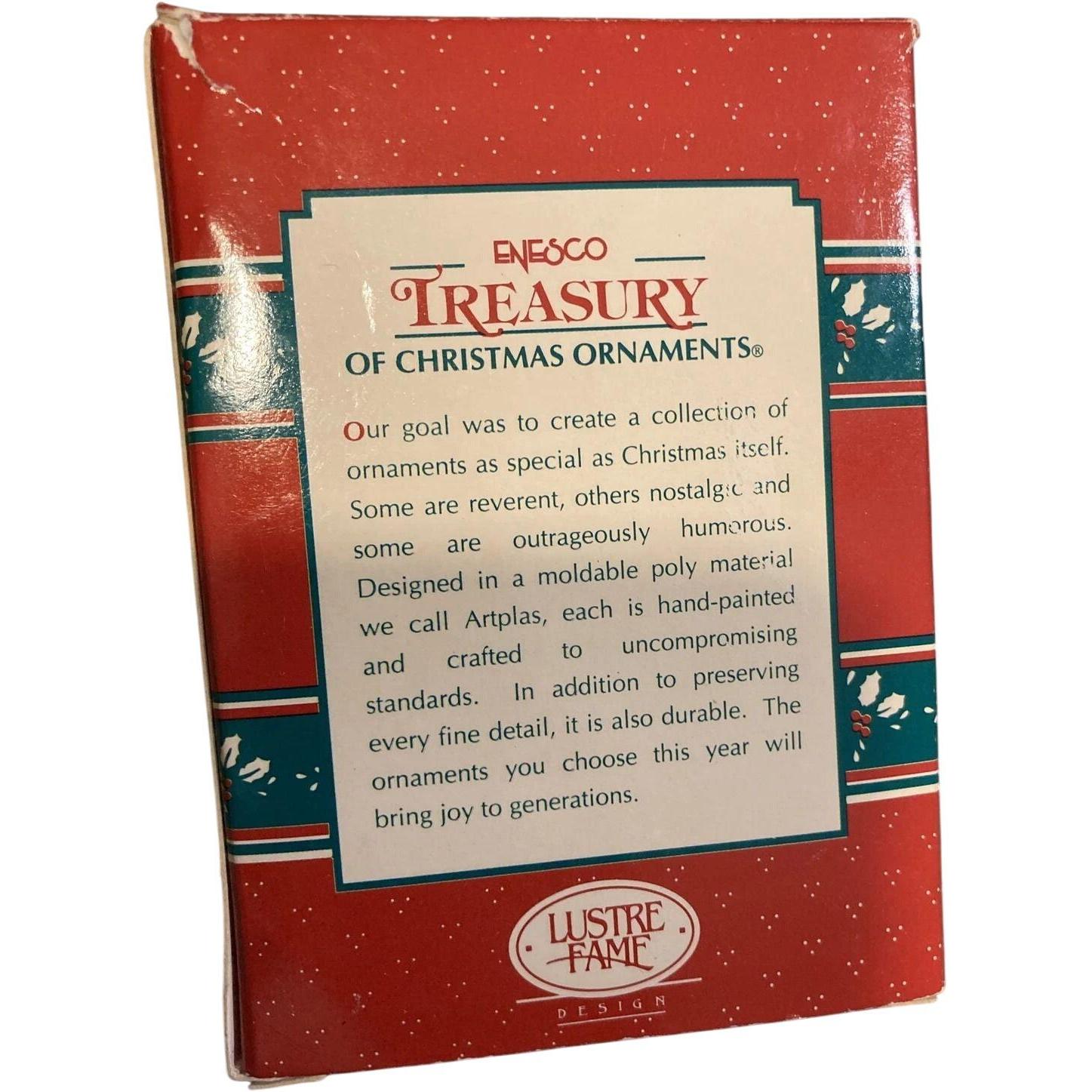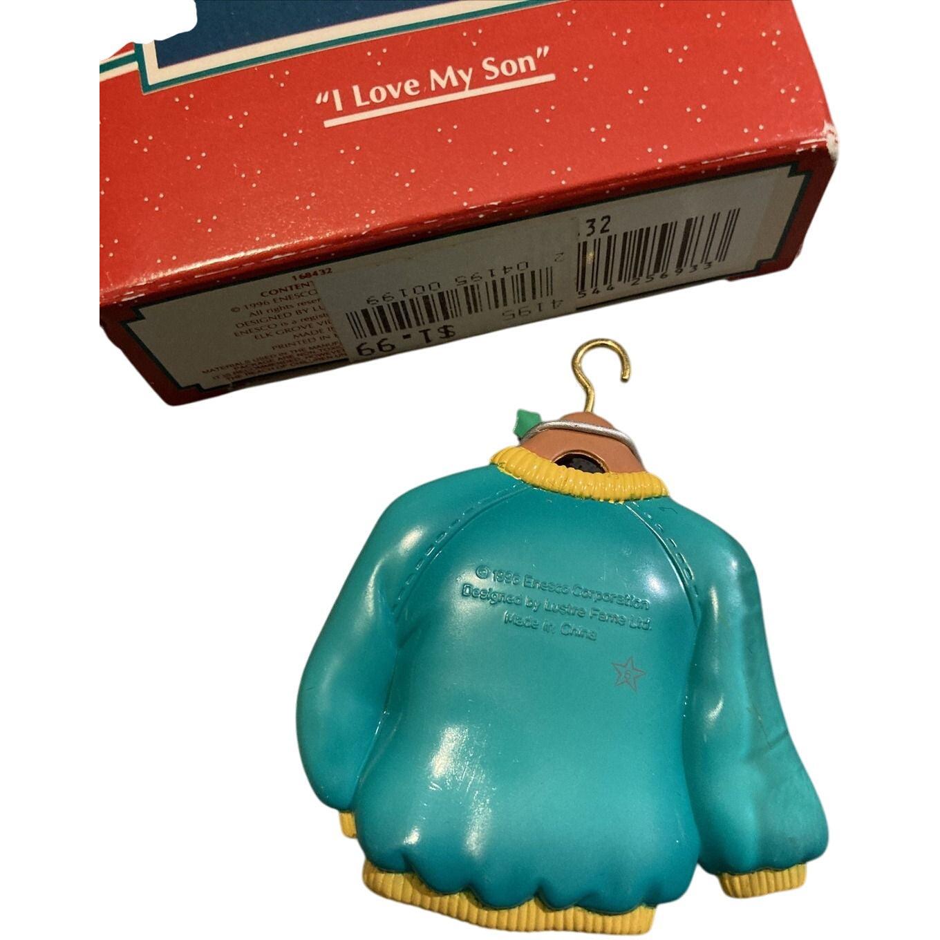 Celebrate the special bond between parent and son with this 1996 “I Love My Son” sweater-style ornament from Enesco’s “Treasury of Christmas” collection. The miniature holiday sweater design carries glitter-accented lettering proclaiming “I Love My Son” and comes in cheerful holiday colors (notably a blue box version but green variants exist). Crafted in molded resin/plastic with a built-in hanging loop, this keepsake ornament is both sentimental and collectible. Great for tree display, gifting to a proud parent, or adding to a family-themed holiday décor collection.