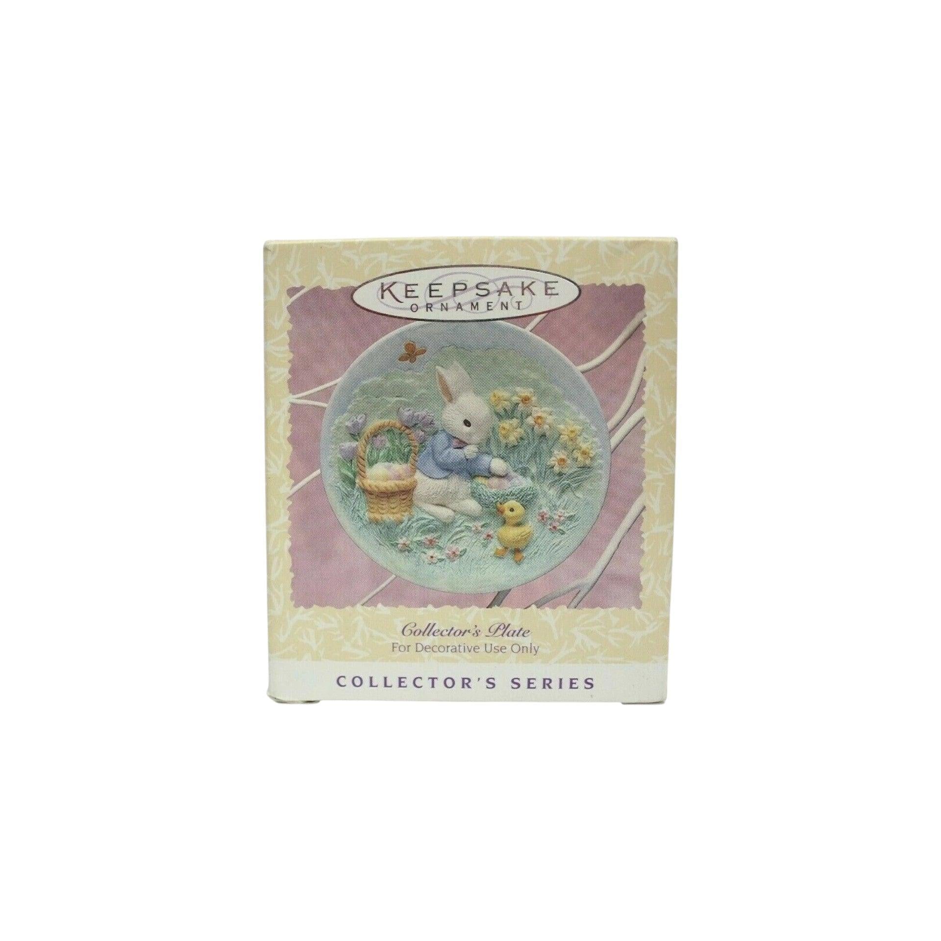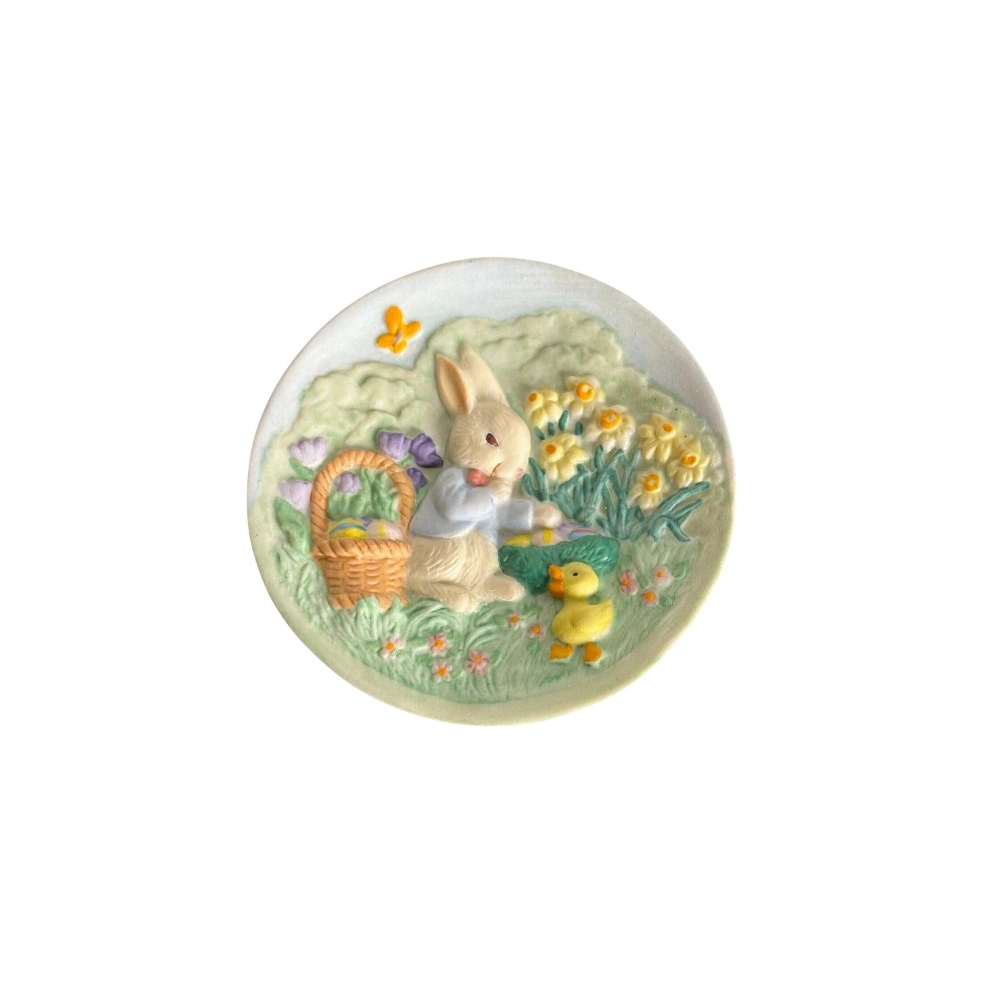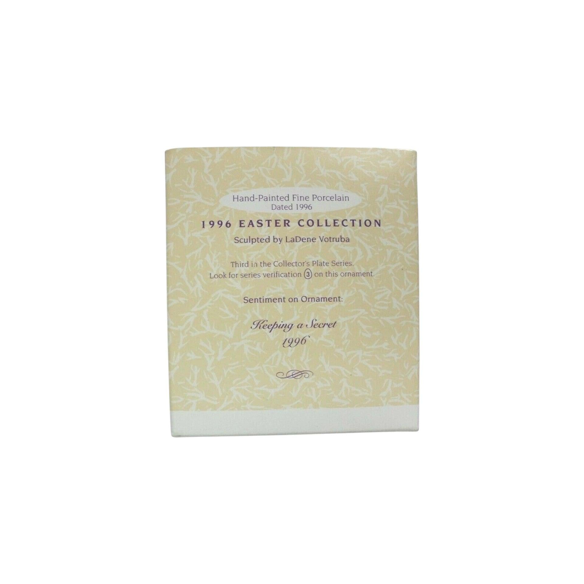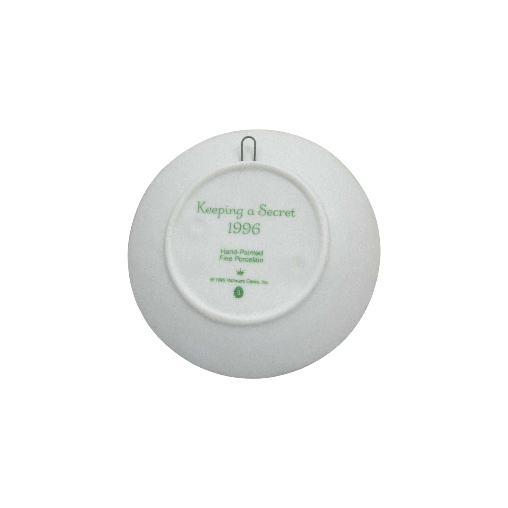 This 1996 collector’s-plate ornament from Hallmark features a charming scene of a white bunny in a blue jacket whispering a secret to a little yellow chick, surrounded by pastel-spring flowers and an Easter basket. The hand-painted fine porcelain piece conveys a soft, nostalgic spring theme rather than a traditional Christmas motif, making it stand out among Hallmark Keepsake Easter offerings. As the 3rd plate in the Collector’s Plate series, it holds appeal for both Hallmark plate collectors and those drawn to whimsical animals and Easter decor. Its compact size makes it ideal for tabletop display or inclusion in a seasonal vignette.