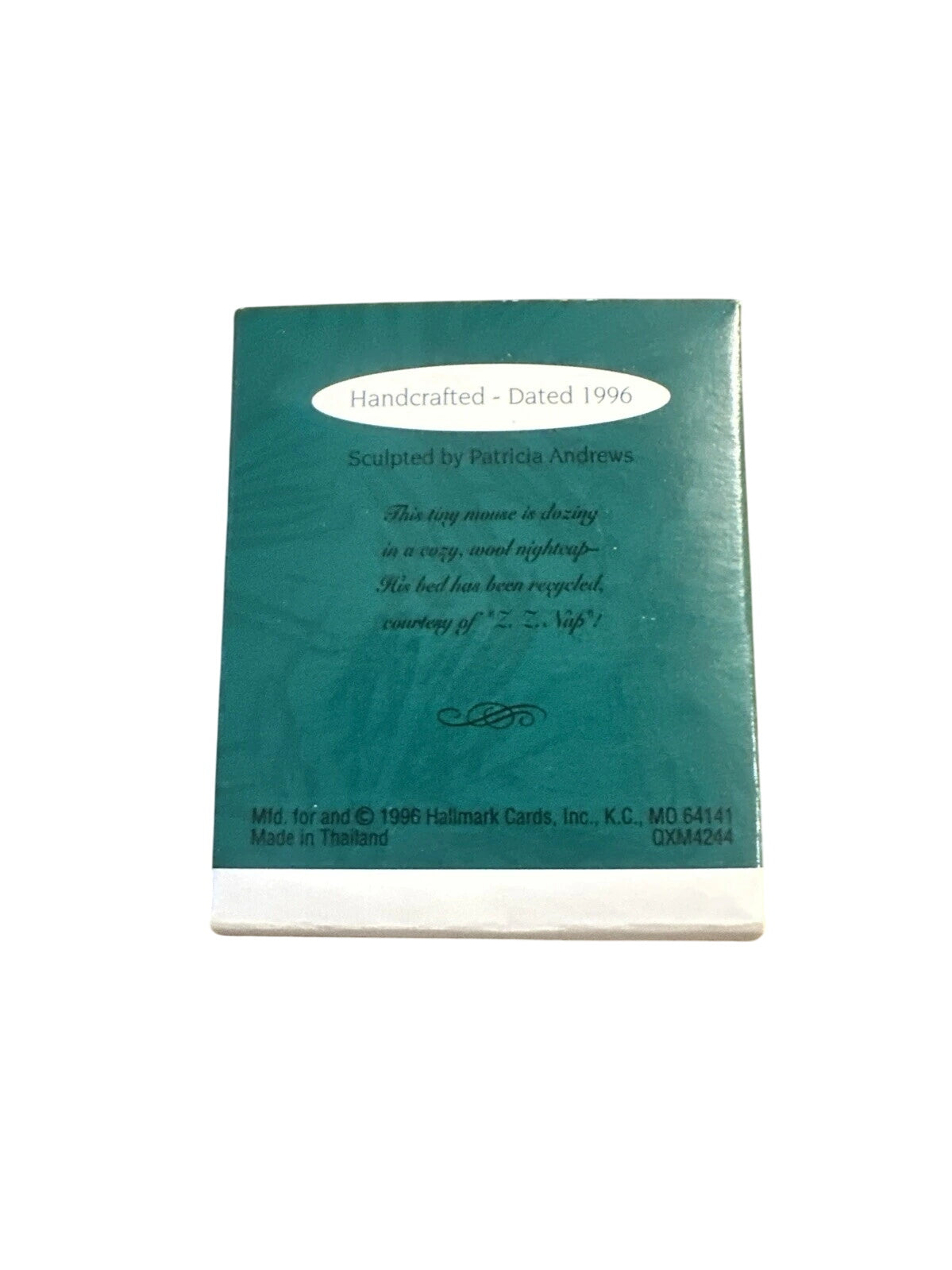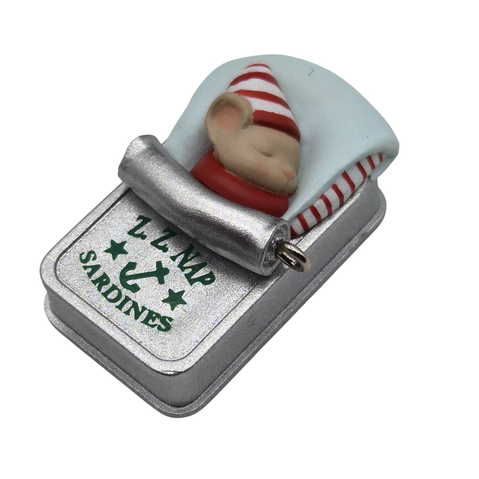 This delightful Hallmark Keepsake Miniature ornament from 1996 features a tiny mouse snugly curled up inside a silver sardine-can-style tin, complete with a striped nightcap and the inscription “Long Winter’s Nap.” The whimsical design captures a wintry scene in miniature form—painted metal-look finish, delicate detailing on the tin, and the sleepy rodent pose all lend it a charming, collectible character. Ideal for lovers of mice or miniature ornaments, this piece evokes cozy holiday imagery and adds a playful touch to any tree or display. As a dated 1996 release (SKU QXM4244) it holds appeal for long-time collectors seeking a vintage miniature from Hallmark’s catalogue.