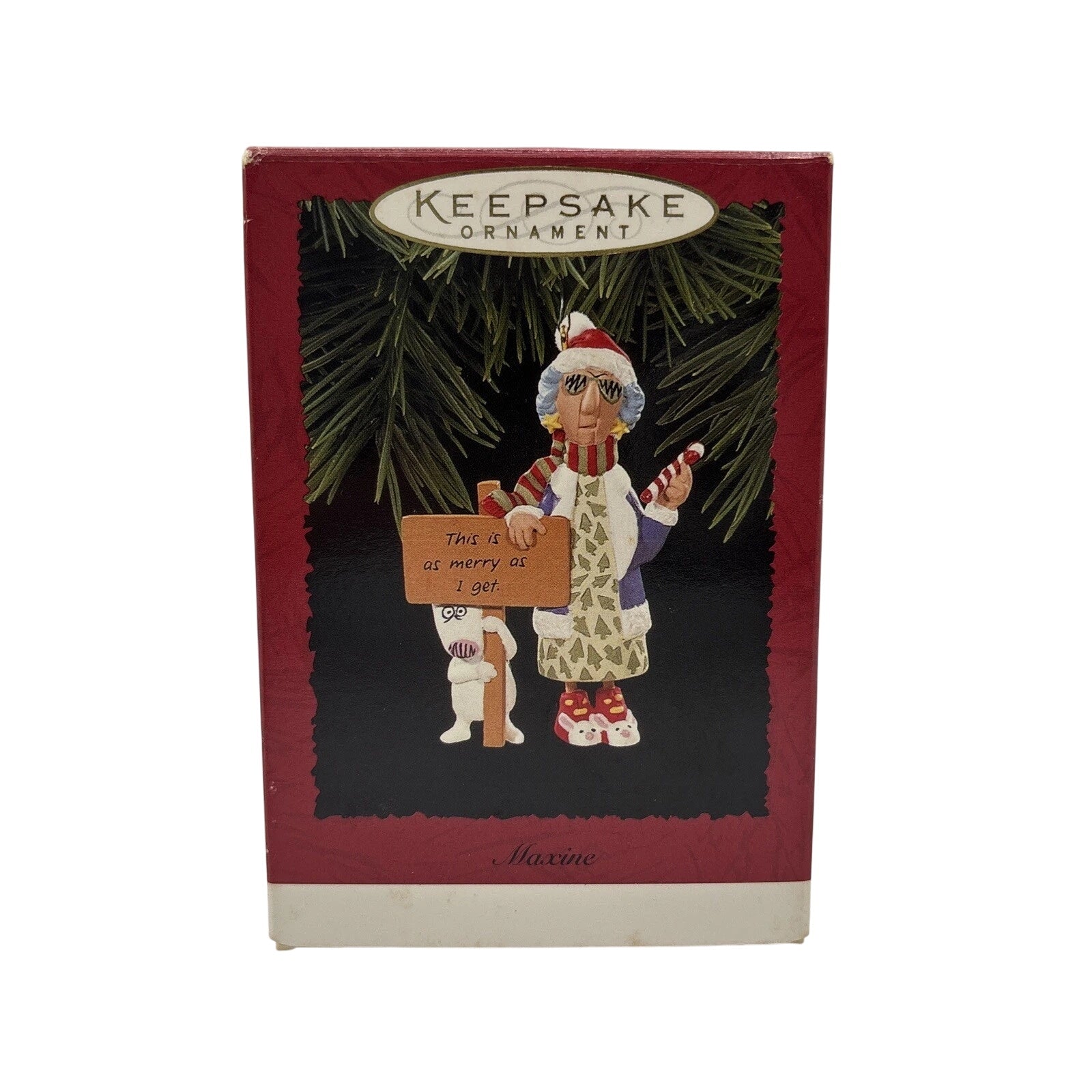 Channel your inner curmudgeon this holiday season with Maxine—Hallmark’s icon of holiday sass—in her 1996 Keepsake ornament debut. Part of the Shoebox Humor line, this edition marked the 10th Anniversary of Shoebox Greetings, celebrating the beloved Maxine in true 'lean, mean, grouching' fashion. Clad in a Santa hat, striped scarf, and loungewear, she holds a candy cane and a sign that reads "This is as merry as I get." Her faithful Bull Terrier, Floyd, stands beside her—equally unimpressed. Designed by Sharon Pike (with contributions by John Wagner), this mixed-media piece stands approximately 3.35″ tall, elegantly shaped and richly detailed.