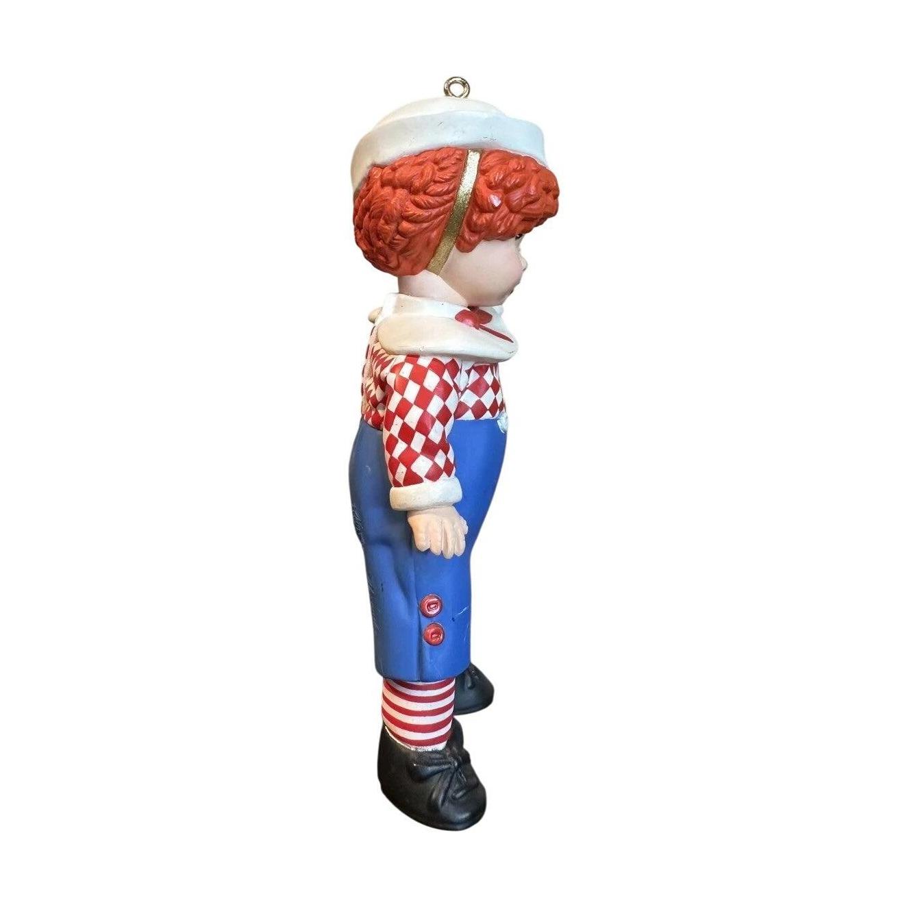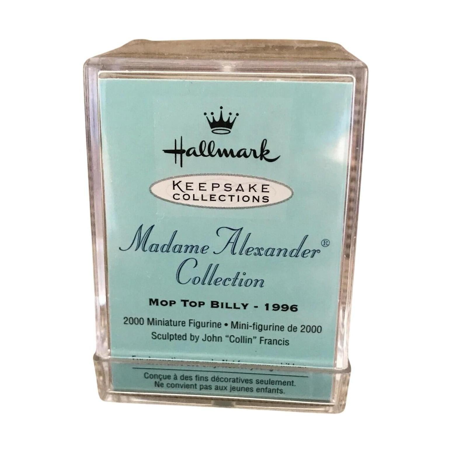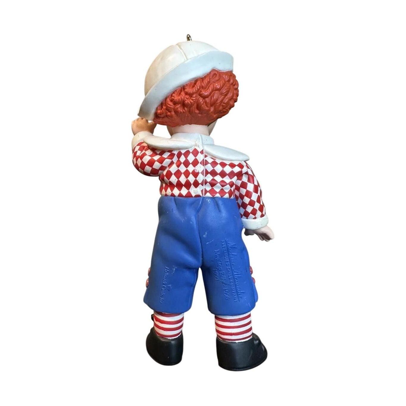 This decorative keepsake from Hallmark features “Mop Top Billy,” styled in the fashion of the Madame Alexander doll collection, evoking vintage toy-charm and collector appeal. Billy is posed with charming detail—hair in mop-top style, dressed in early-20th-century courtly attire, rendered in bright painted finishes and sculpted form—capturing the nostalgic doll aesthetic. As part of the Madame Alexander line, this piece adds a whimsical collectible feel to any holiday display or dedicated keepsake shelf. Its historical toy-inspired design plus steady collector interest make it a desirable piece for vintage ornament and doll-inspired décor enthusiasts.