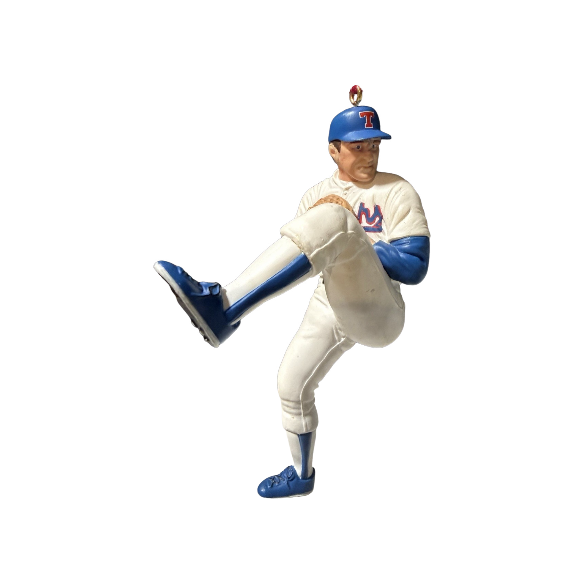 Celebrate baseball greatness with the 1996 Nolan Ryan, At the Ballpark ornament—Hallmark's debut in the beloved "At the Ballpark" series. Sculpted in a powerful pitching stance, Nolan is captured in full Texas Rangers regalia, mid-windup, exuding legendary focus and energy. The keepsake comes nestled in its original box and includes a collectible trading card for added memorabilia value. No batteries or power needed—just hang it to bring a slam-dunk slice of sports history to your holiday décor.
