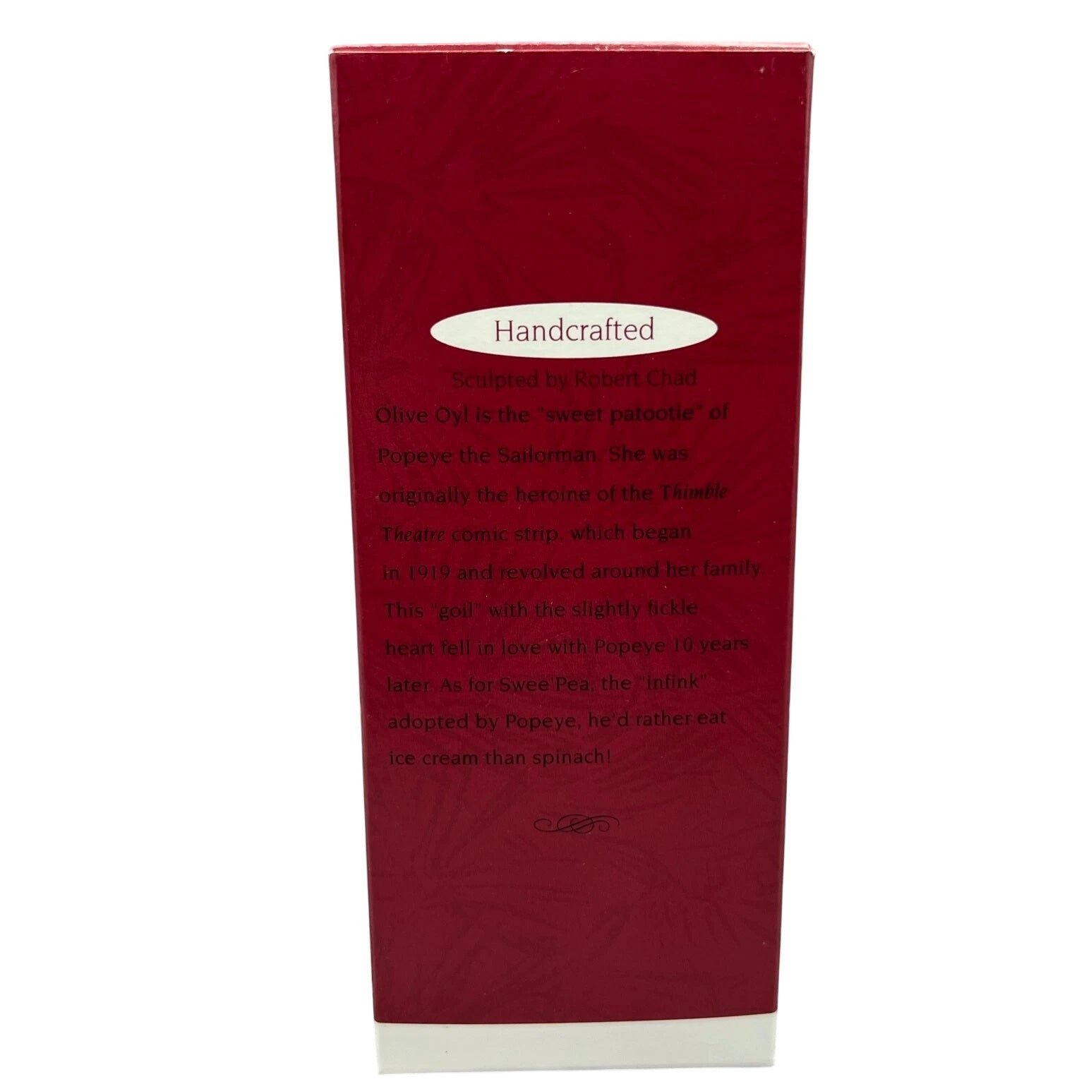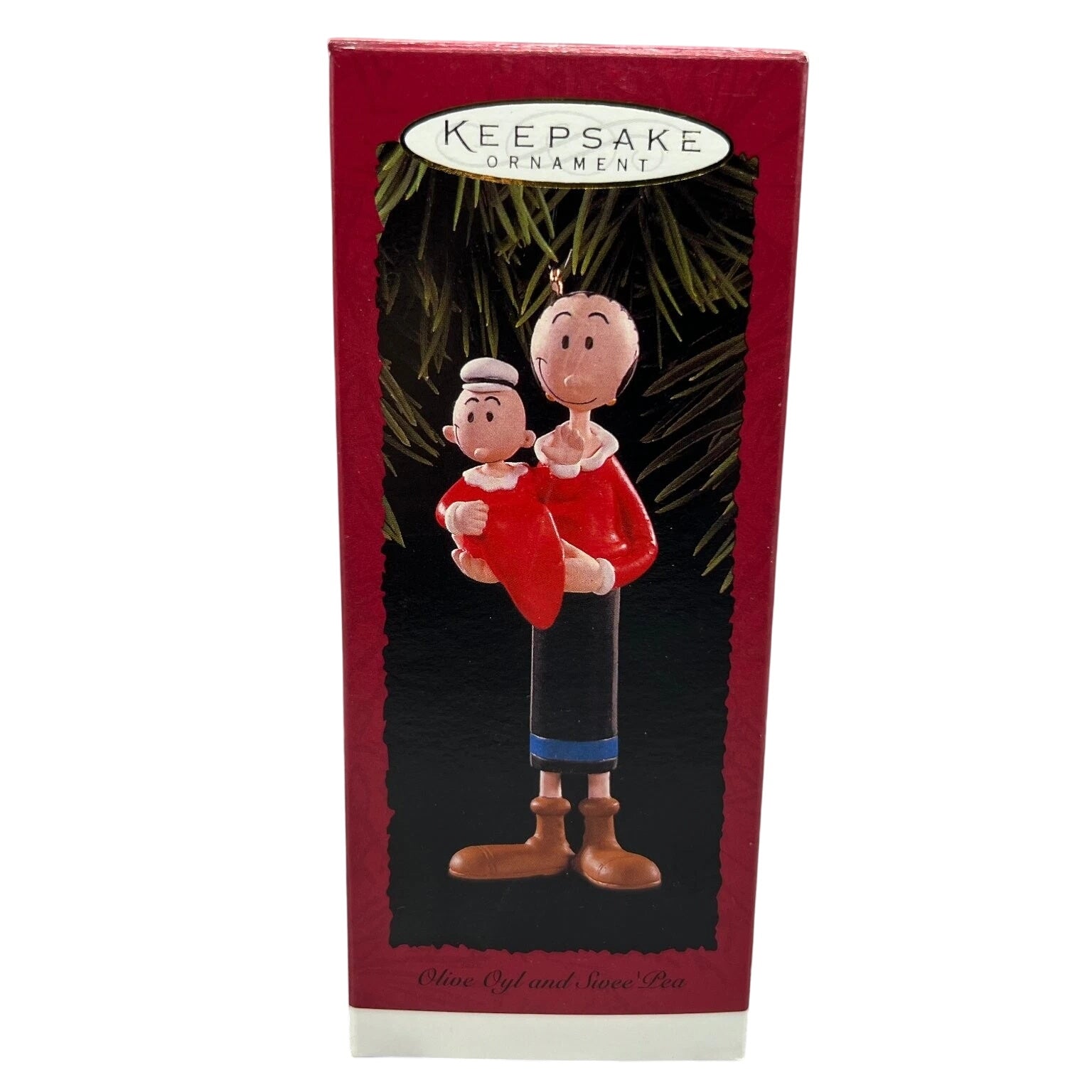 This 1996 keepsake ornament from Hallmark features the classic cartoon characters Olive Oyl and Swee’ Pea from the Popeye the Sailor series. Olive Oyl stands in her familiar dress and hair-bun styling, while Swee’ Pea is portrayed perched or held in a cameo-style scene beside her—capturing a nostalgic moment of the cartoon duo. The ornament is finely sculpted by artist Robert Chad and finished in multiple colours, making it a decorative appeal for both Popeye fans and vintage ornament collectors. With its moderate size and detailed design, it’s a standout piece for displaying on a holiday tree or in a collector’s cabinet.