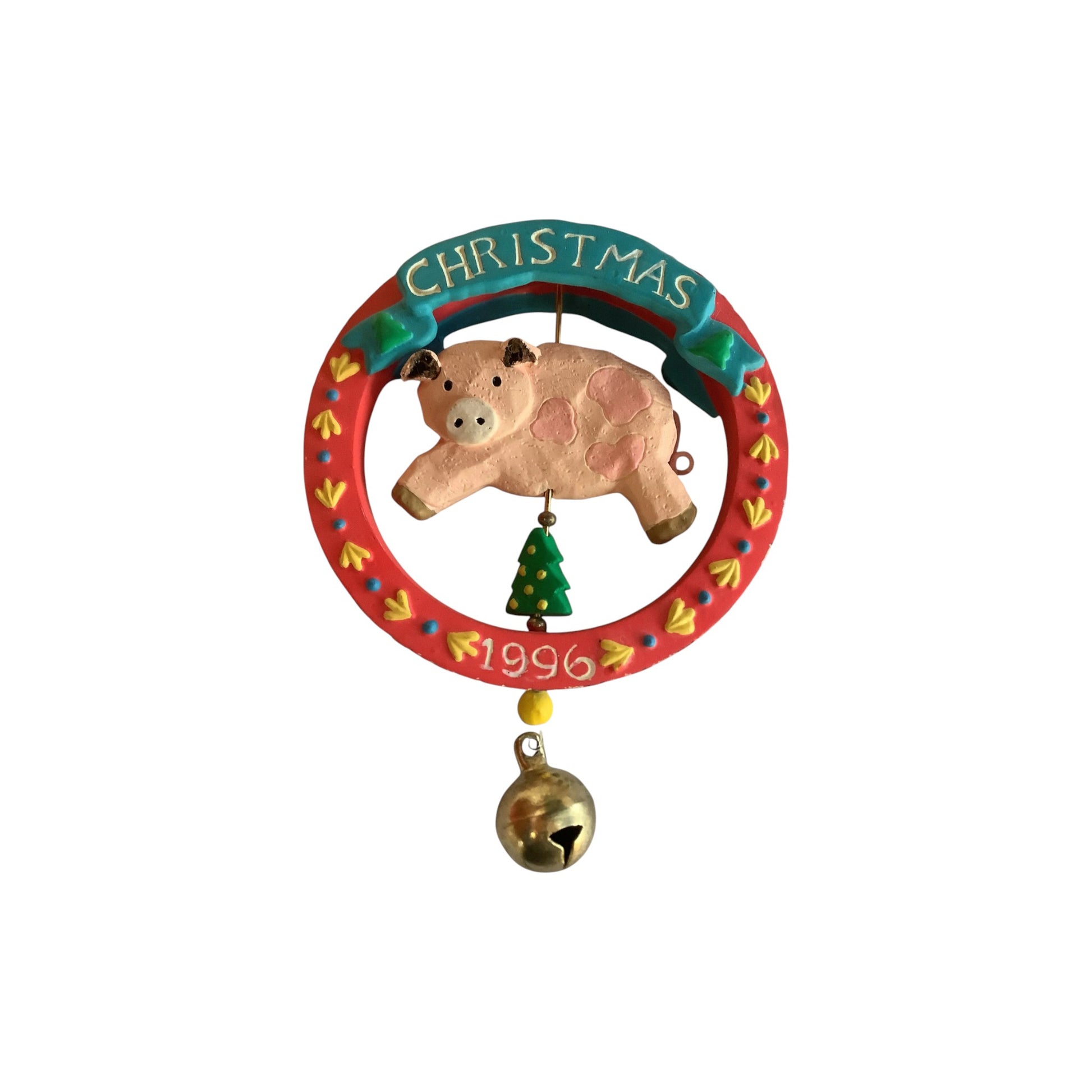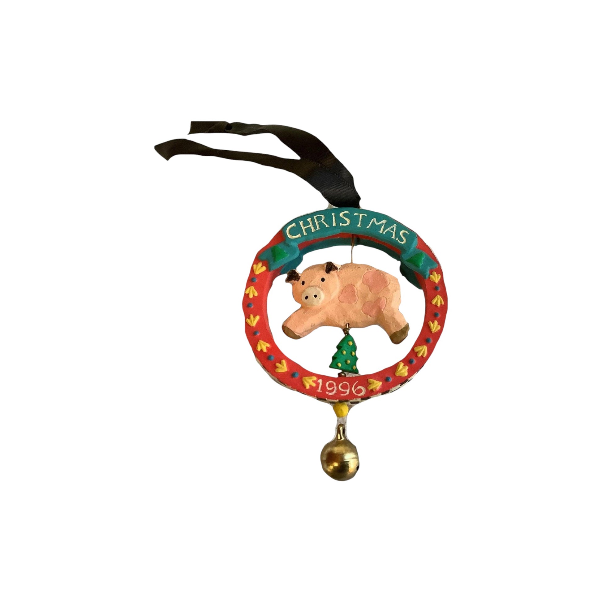 Bring some barnyard charm to your holiday tree with this cheerful “Perky Pig” ornament from Carlton Cards’ Heirloom collection. Released in 1996, this adorable pig figure is nestled within a festive wreath and accented with a small dangling bell — rendered in high-quality resin/plastic with a bright colour palette and fine detailing. It’s a fun and lighthearted piece ideal for animal-themed collections, pig lovers, vintage Carlton ornaments and anyone seeking a whimsical holiday accent.