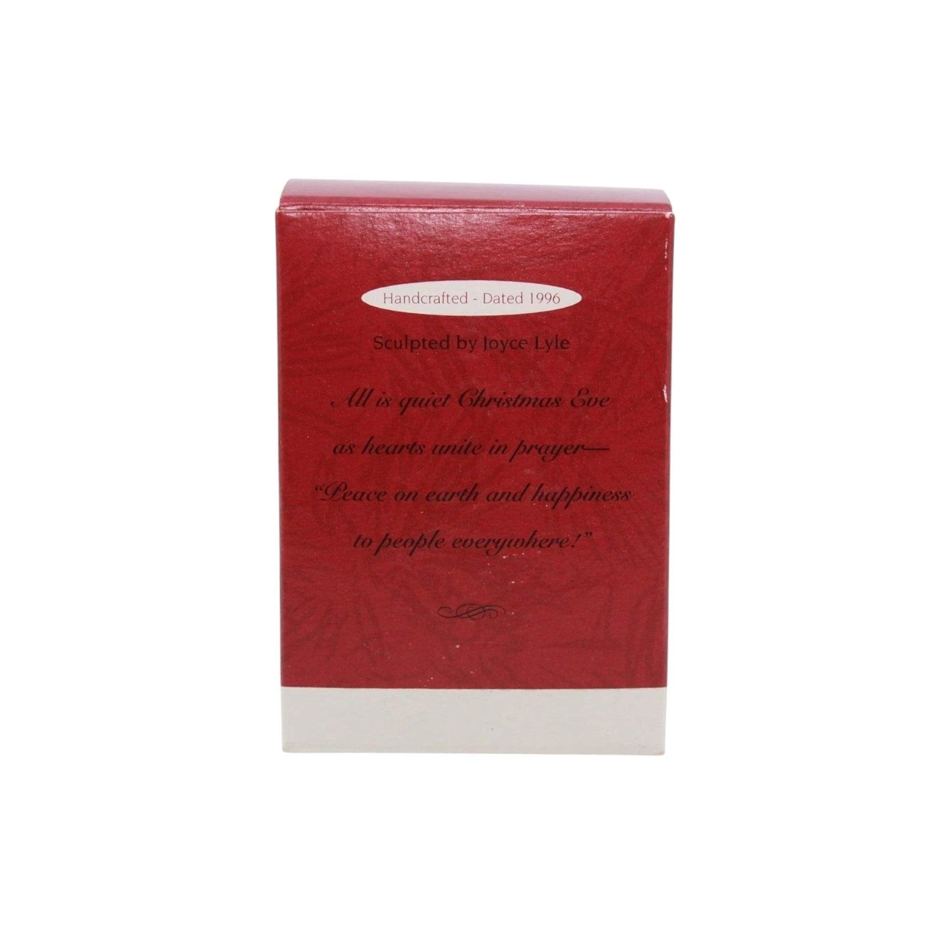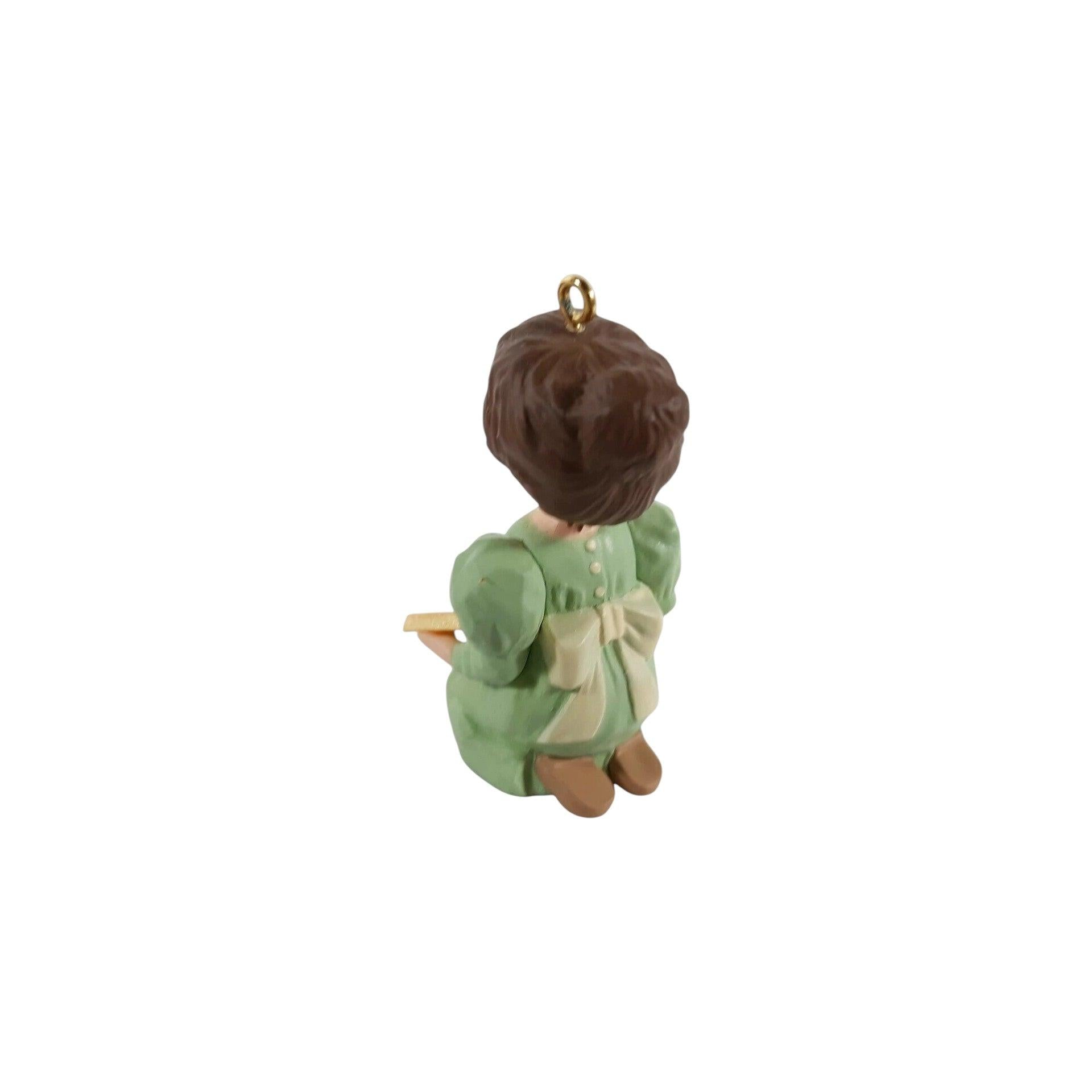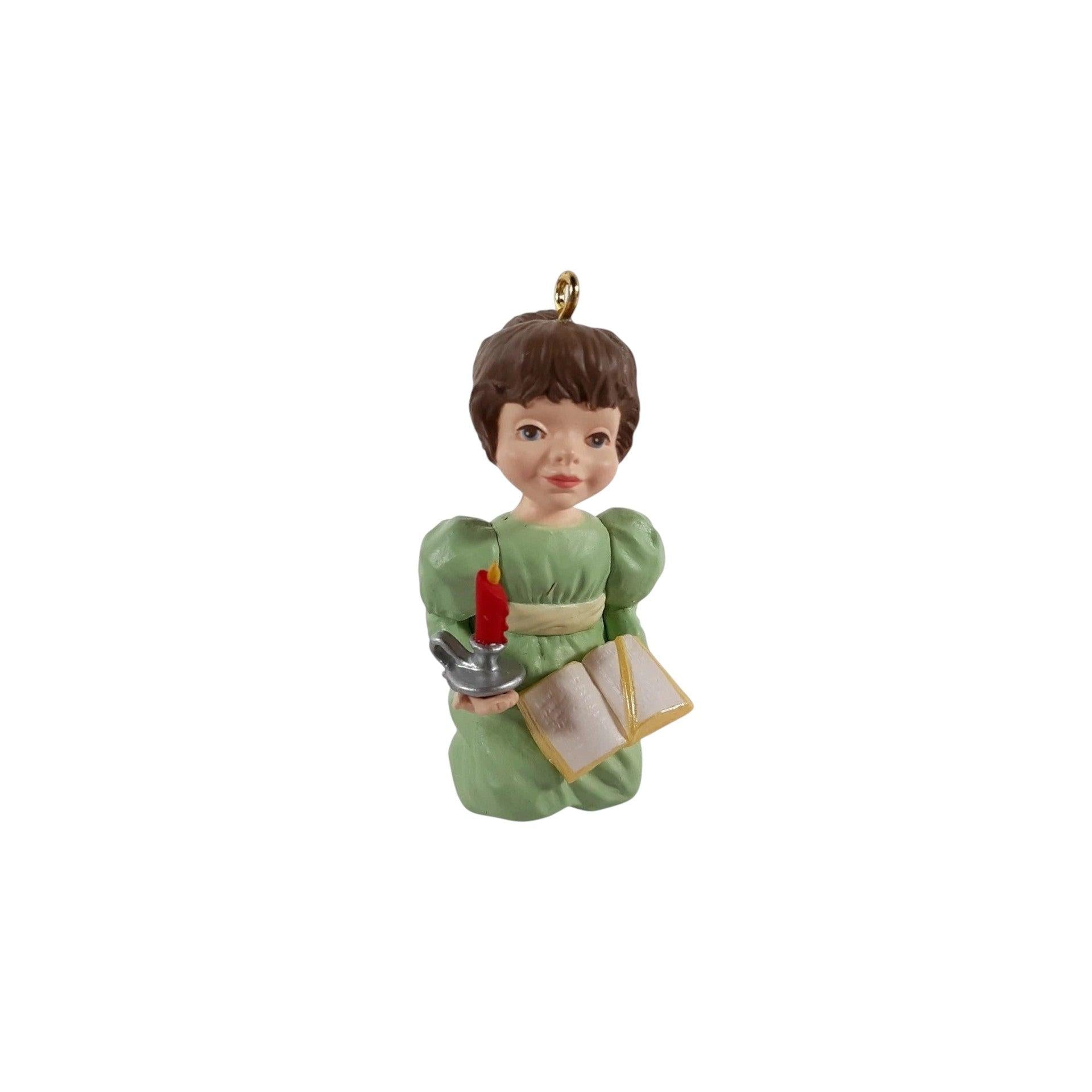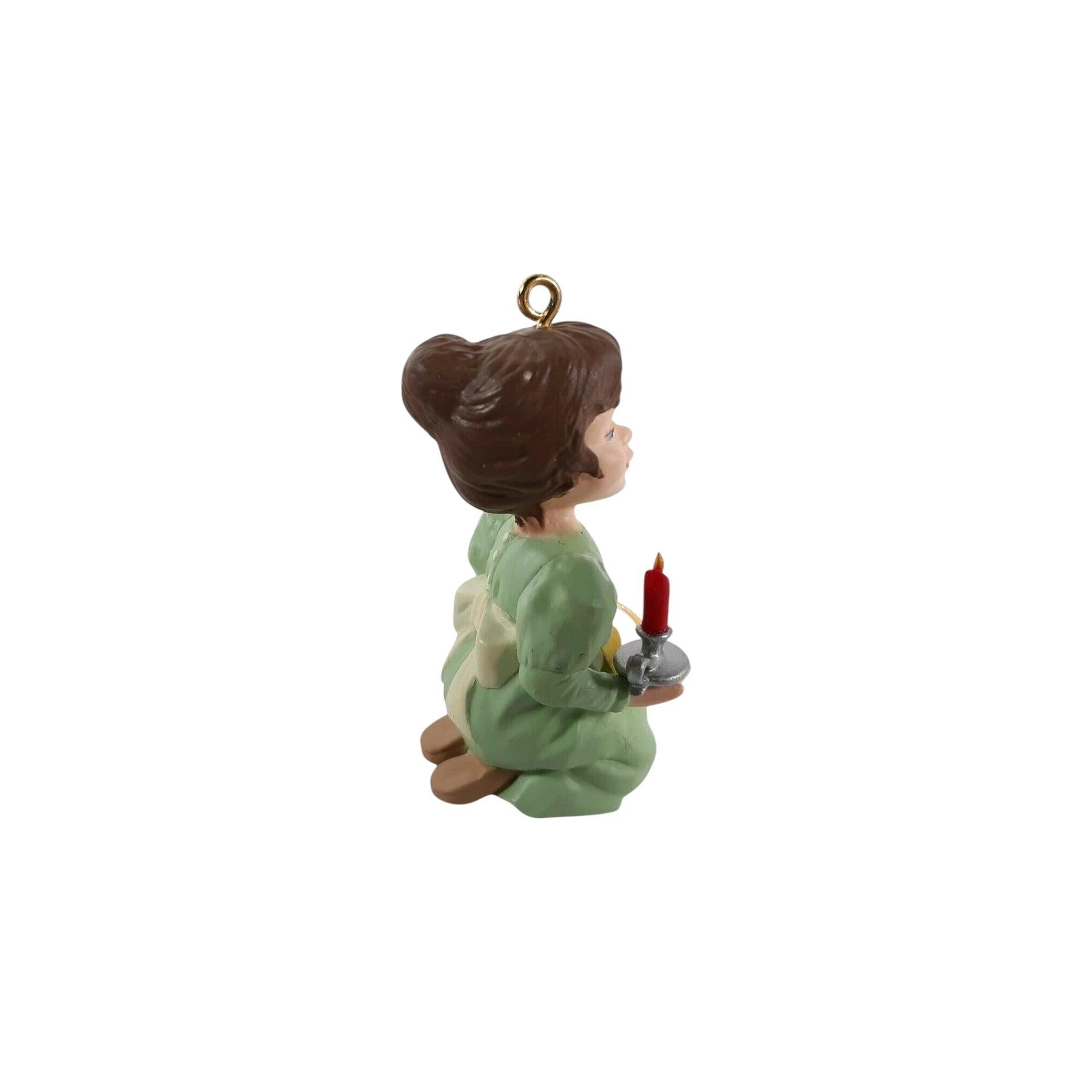 This ornament from Hallmark features a young girl kneeling in a green dress, holding a red candle and a book, in a peaceful, prayerful holiday pose. The title “Prayer for Peace” and its contemplative theme make it especially meaningful for faith-based or tranquil holiday décor. Designed by artist Joyce Lyle, this 1996-dated piece provides a quiet, timeless message of hope.