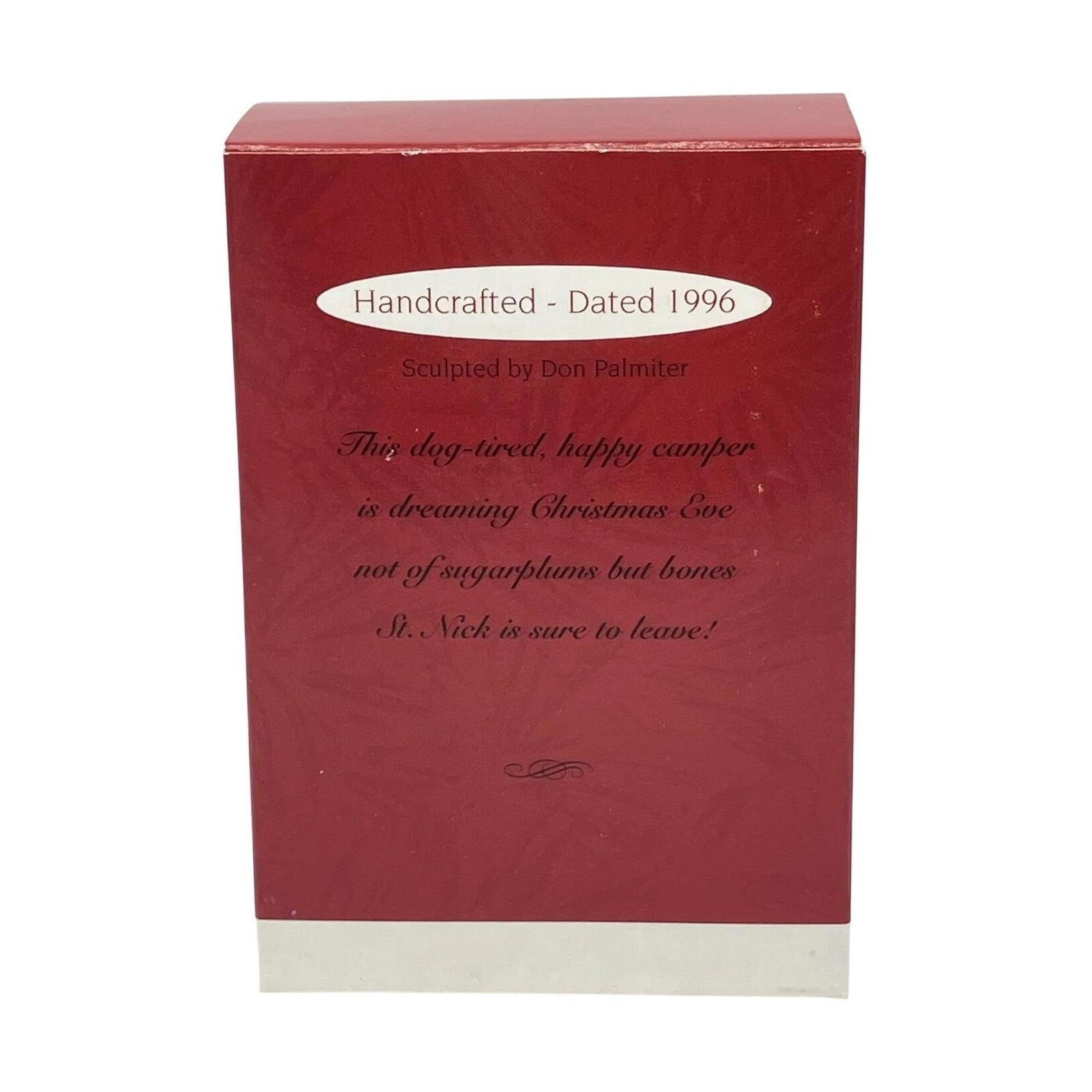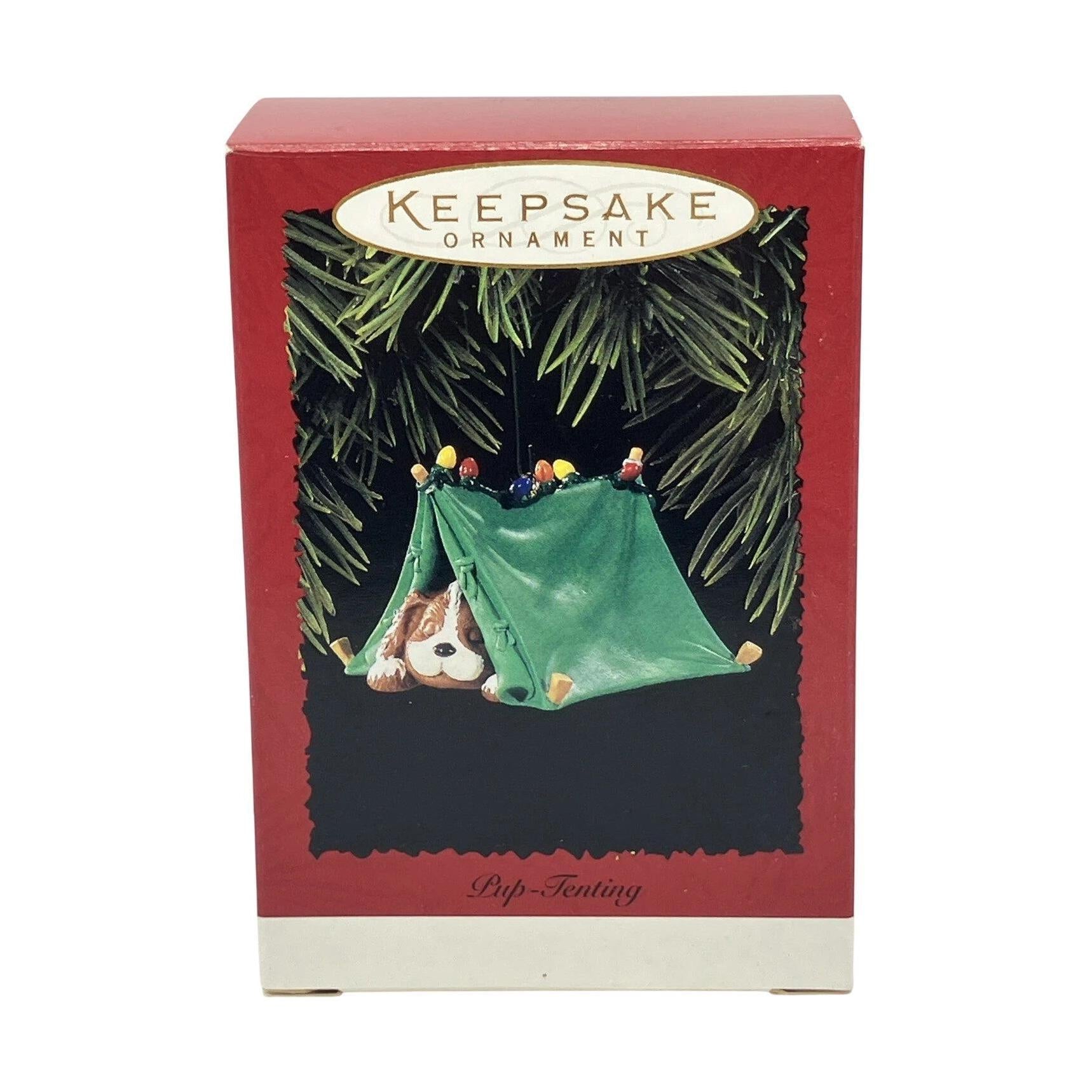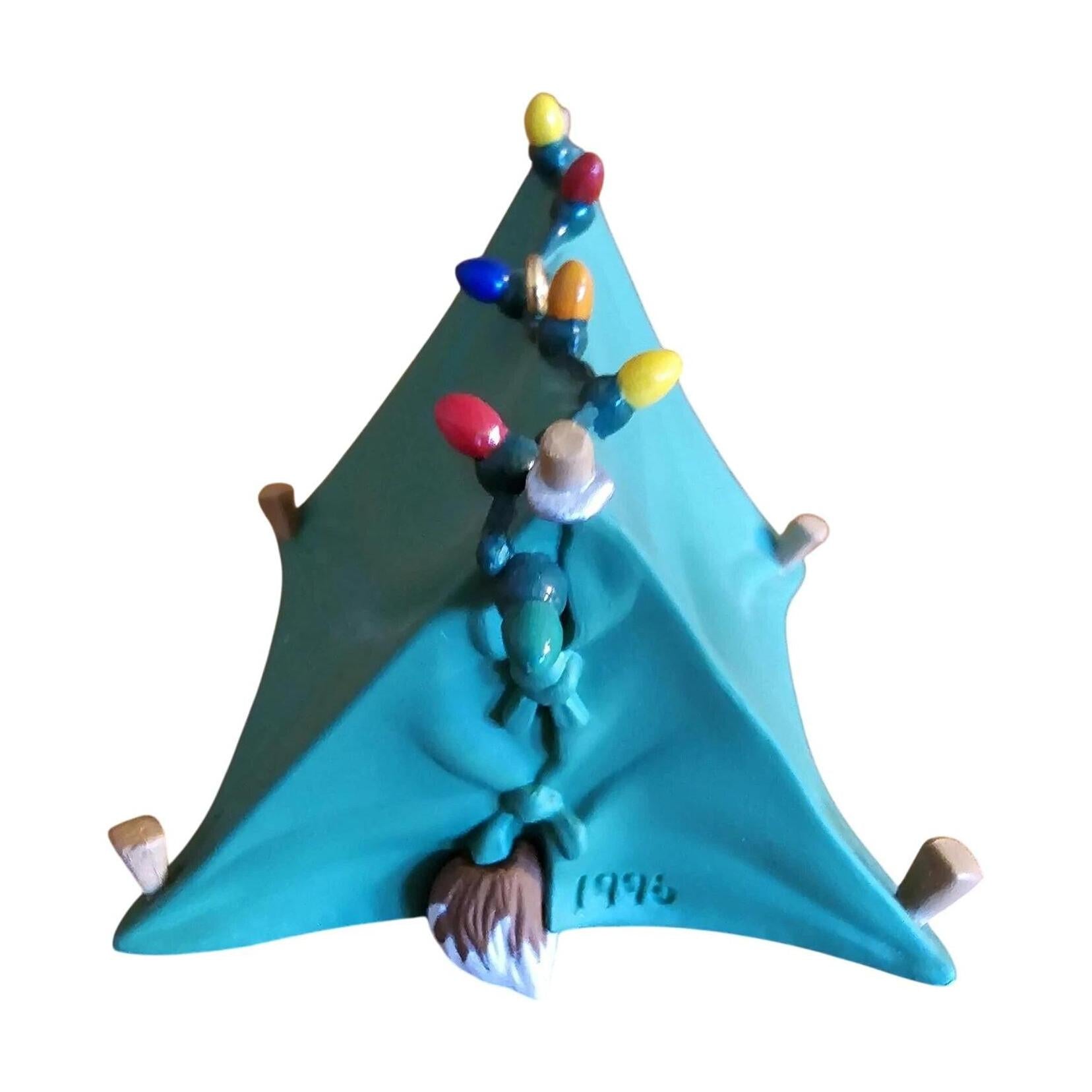 This 1996 entry in the Hallmark Keepsake collection portrays an endearing puppy nestled in a cozy camping tent, complete with camping-gear accents and snow-dusted details. The tent is rendered in a soft green with multicoloured trim and the pup appears relaxed and content, giving a light-hearted outdoor holiday vibe. Sculpted by Don Palmiter, the ornament masterfully balances charm and craftsmanship in a compact format. It appeals to collectors who enjoy nature or pet-themed holiday pieces, and stands out for its playful yet seasonal design.