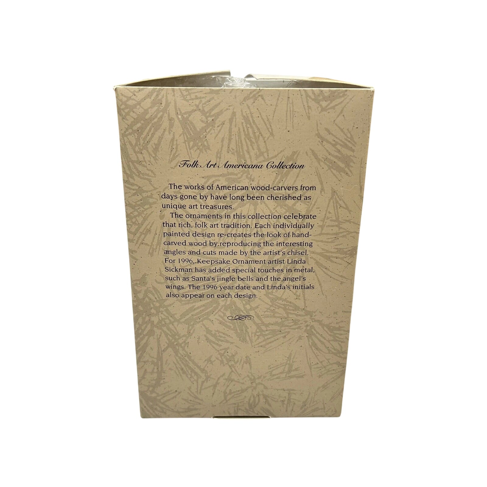Add handcrafted charm to your holiday collection with the 1996 Santa’s Gifts ornament from Hallmark’s beloved Folk Art Americana collection. This rustic-style figurine portrays Santa carrying a bundle of toys, complete with artisan details like brass bells and a copper angel wing accent. Designed by Linda Sickman, the keepsake arrives mint-in-box with its original tag and requires no batteries, cords, or lights.