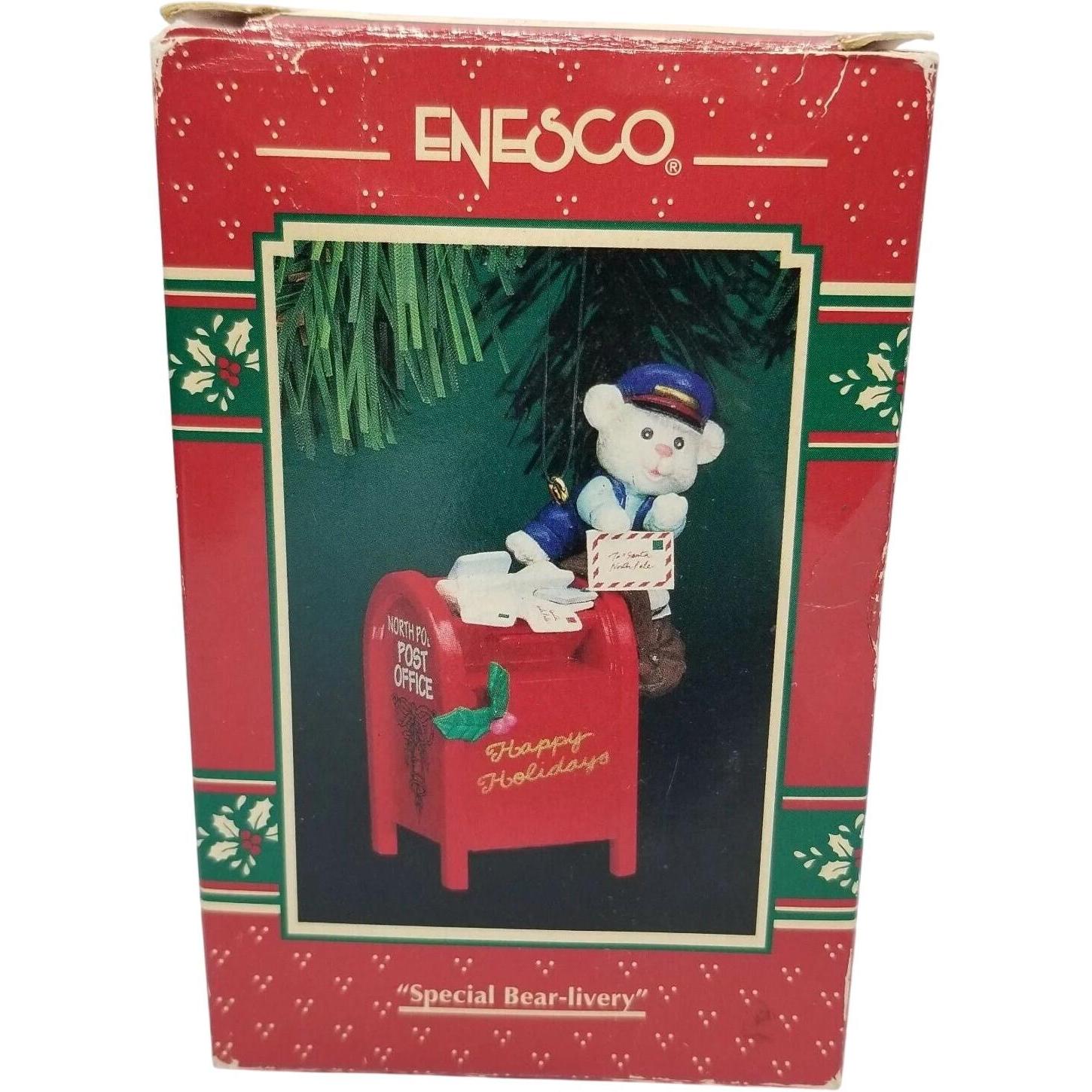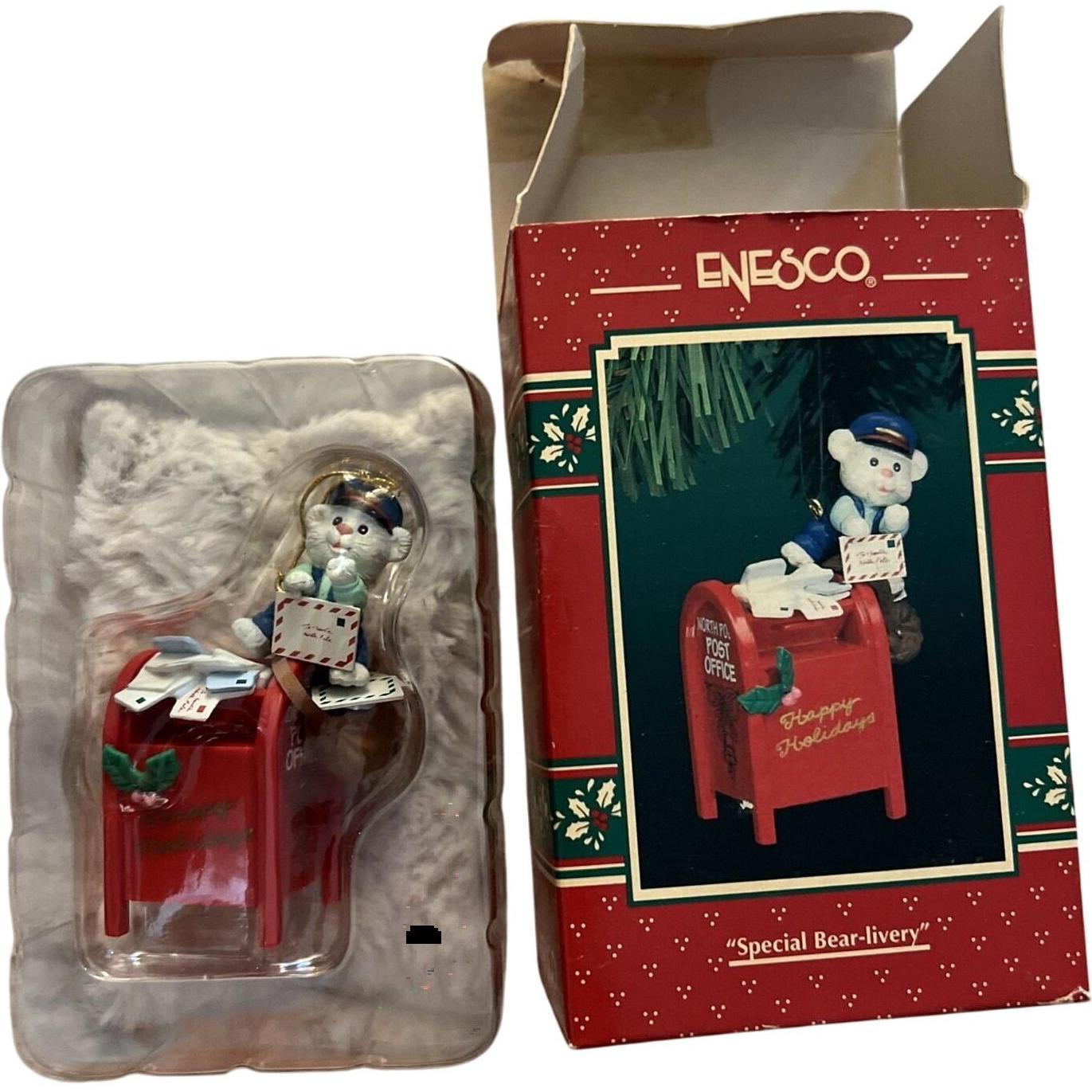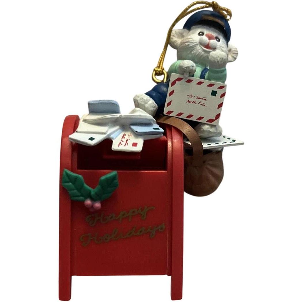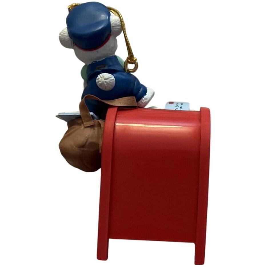 This playful 1996 Enesco ornament features a cheerful polar bear dressed as a postal mail-carrier, complete with uniform, mailbag and holiday postbag, delivering letters from the North Pole. The sculpted design is crafted in molded plastic/mixed-media with rich hand-painted detail and whimsical charm. Perfect for collectors of animal-themed ornaments, postal-service décor, or vintage holiday collectibles, this piece brings both nostalgic appeal and crisp craftsmanship.