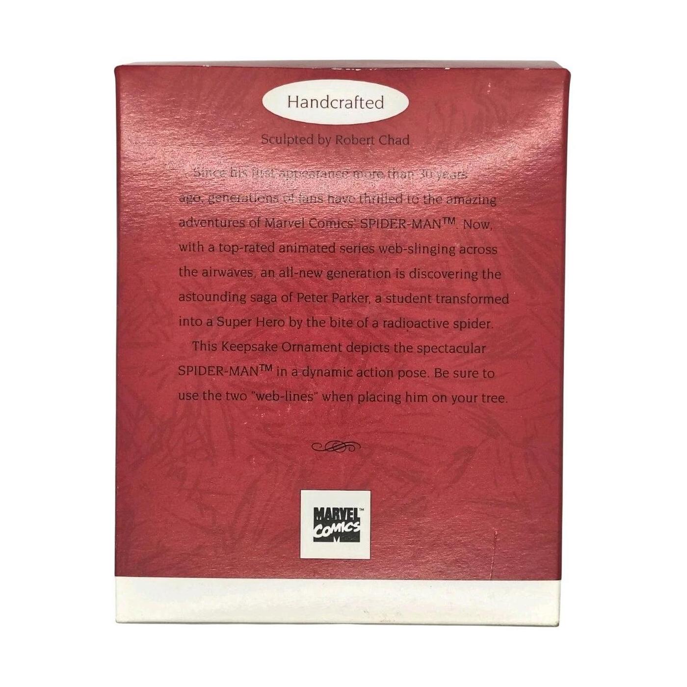 Swing into action this holiday with the 1996 Spider Man Keepsake ornament. This dynamic figure of Peter Parker in his iconic red & blue suit is sculpted mid-web swing—with two web lines to hang him securely on your tree or display. Designed by Robert Chad, the ornament captures the athletic pose and classic Spider Man flair. The package includes the ornament itself, original printed tag, and box. No batteries, cords, lights, or power required—it’s purely decorative.