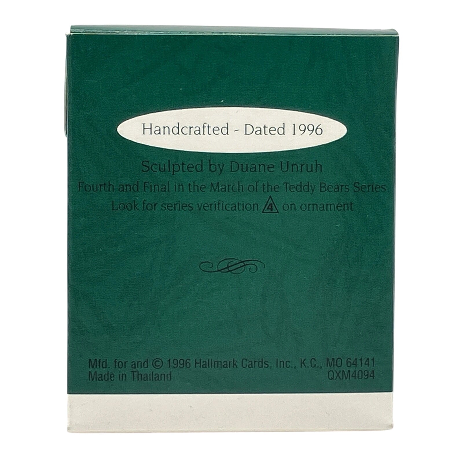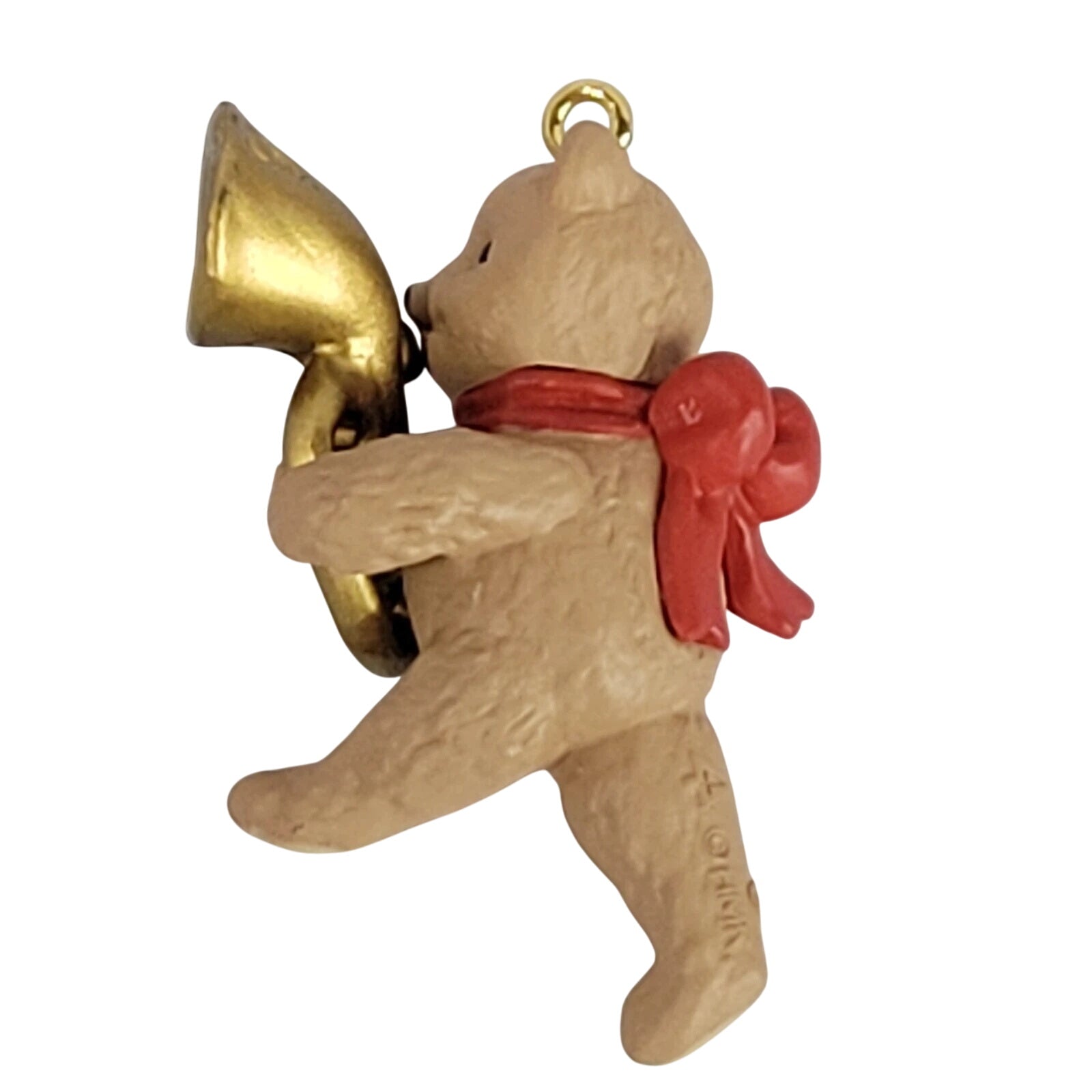 Join Hallmark’s nostalgic parade with this delightful 1996 miniature ornament—Teddy with Horn, the fourth and final piece in the cherished March of the Teddy Bears series. Crafted by Duane Unruh, this tiny teddy bear stands tall (about 1 1/4" high) and is ready to lead the festive march with a shiny gold horn and a red bow tied around his neck. Designed for collectors, it arrives in its original box and requires no batteries or power—just hang and let the miniature magic march on.