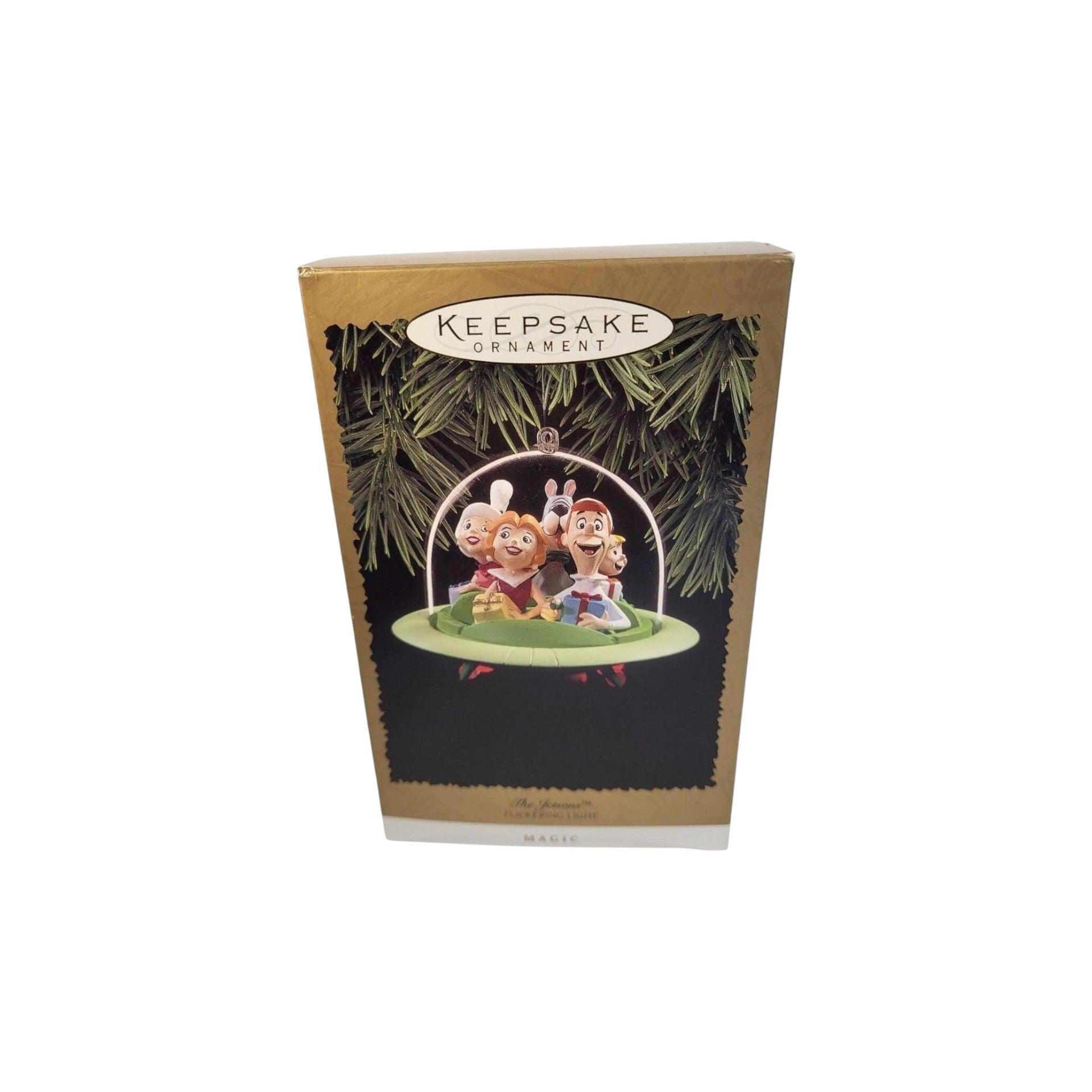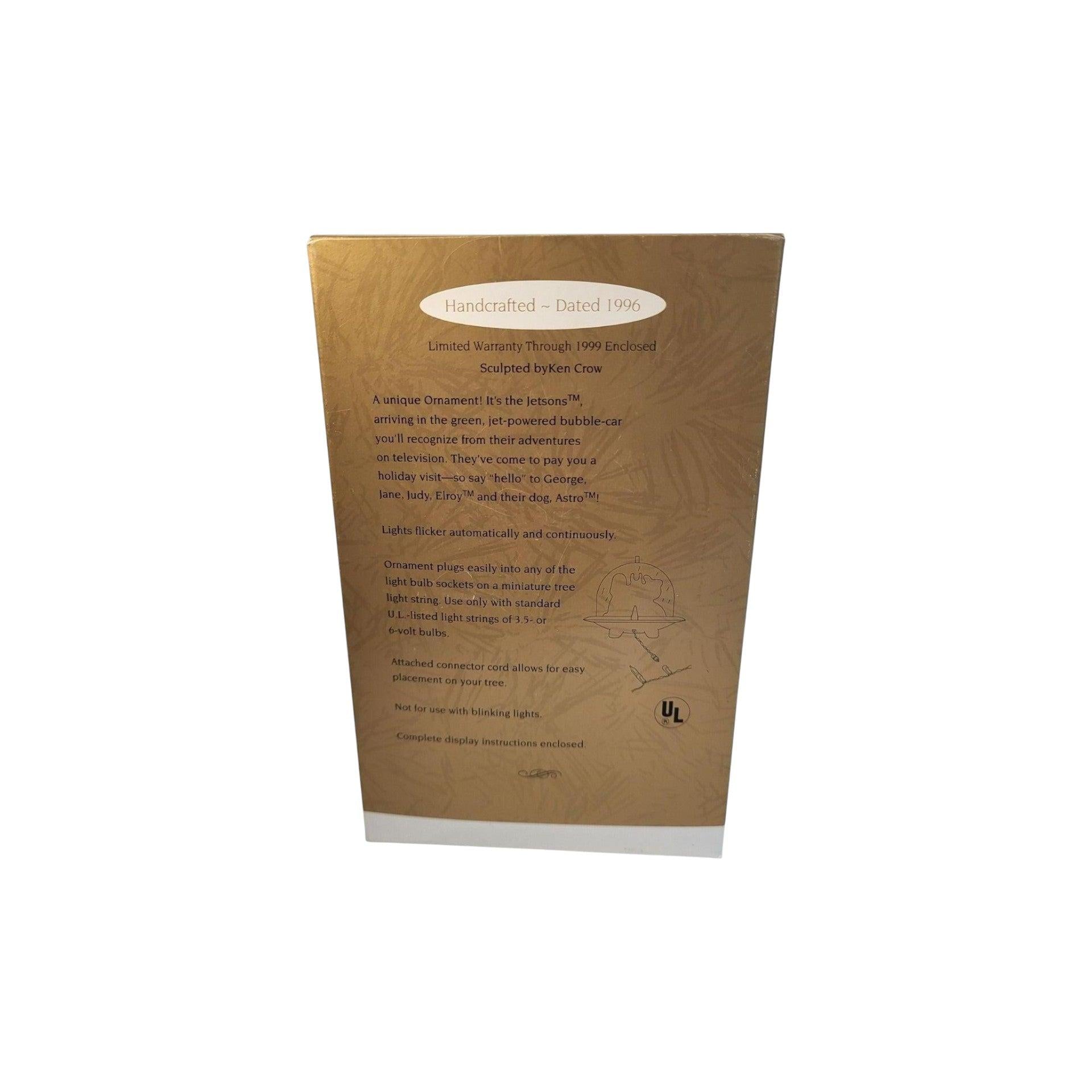Enjoy a nostalgic trip to the future with this 1996 The Jetsons Keepsake ornament. The lively scene showcases George, Jane, Judy, Elroy, and Astro traveling in their iconic bubble-powered flying car. For an extra touch of retro charm, the exhaust flickers and the vehicle’s glass top glows when plugged into a miniature Christmas light socket. It comes new in the original box, and no batteries or cords are needed—just plug it in and let it brighten your holiday décor.