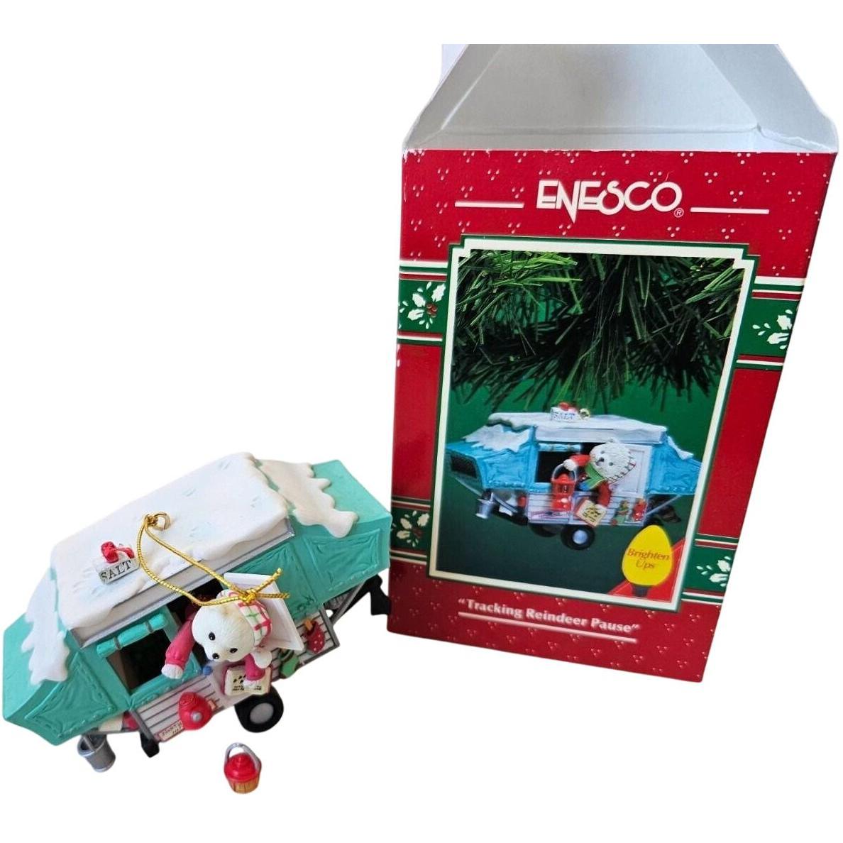 Add a touch of winter whimsy to your holiday display with the 1996 Enesco “Tracking Reindeer Pause” ornament. This delightful piece features an inquisitive polar bear playfully examining a trail of reindeer tracks in the snow. Sculpted with charming detail and finished in soft hand-painted tones of white, blue, and silver, the design captures the peaceful magic of the Arctic season. Perfect for collectors of Enesco ornaments or animal-themed Christmas décor, this figurine reflects Enesco’s craftsmanship and timeless appeal.