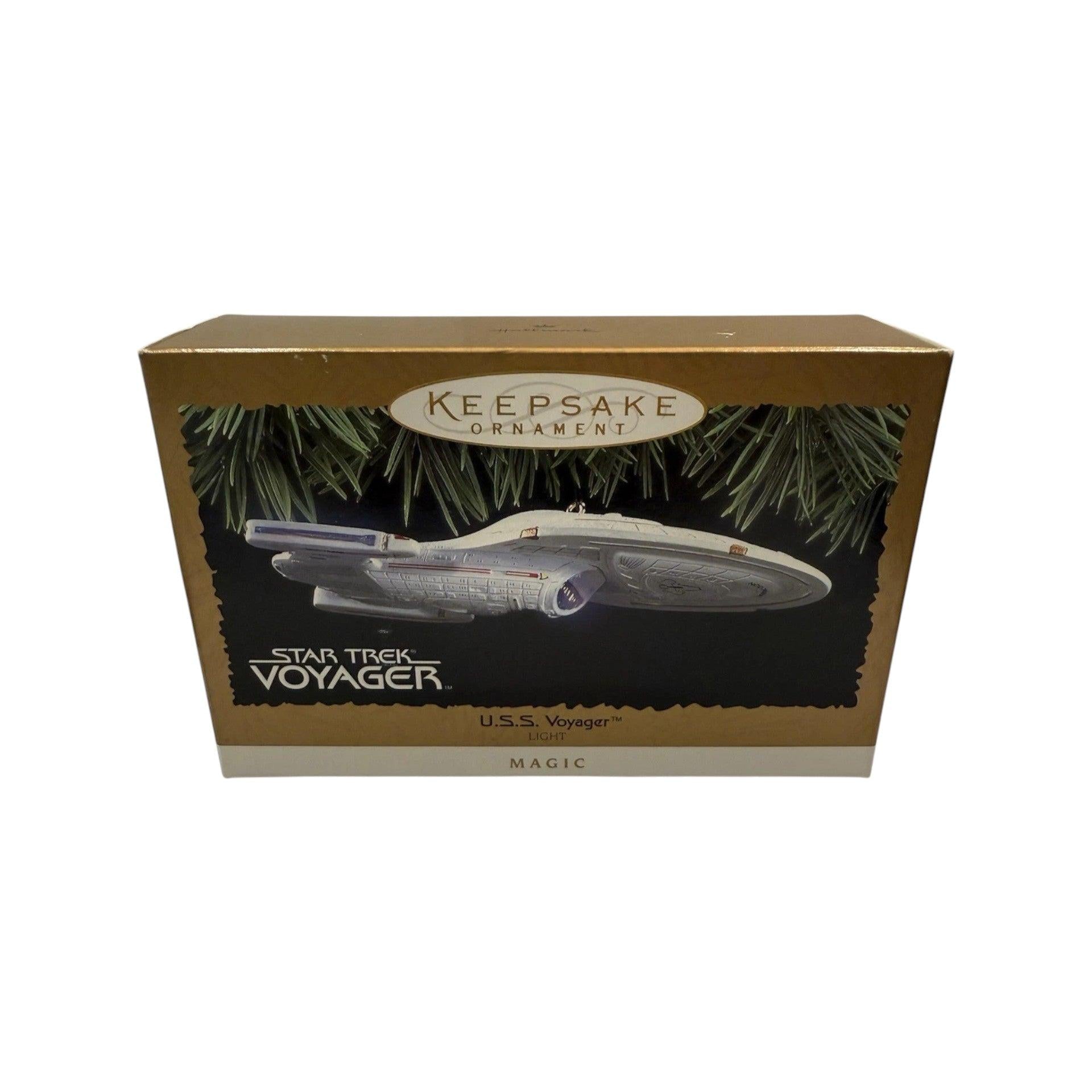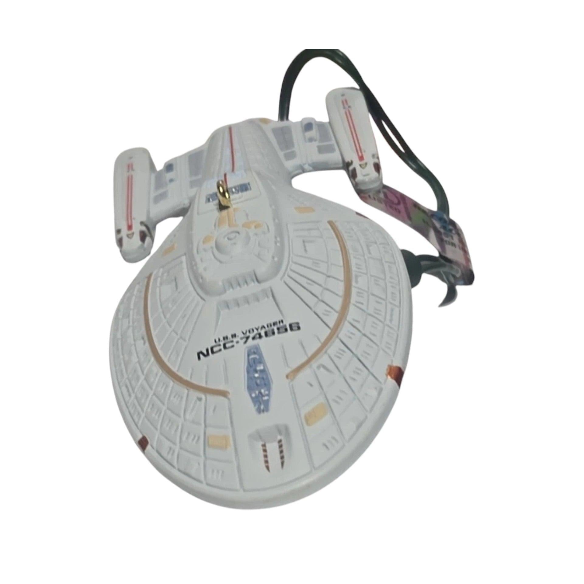 Command your holiday display with the 1996 Light Magic ornament of the U.S.S. Voyager NCC-74656, from Star Trek: Voyager. Designed by Lynn Norton, this starship ornament features two warp nacelles, a prominent deflector dish, and built-in lights that glow when plugged into a miniature Christmas tree light string.