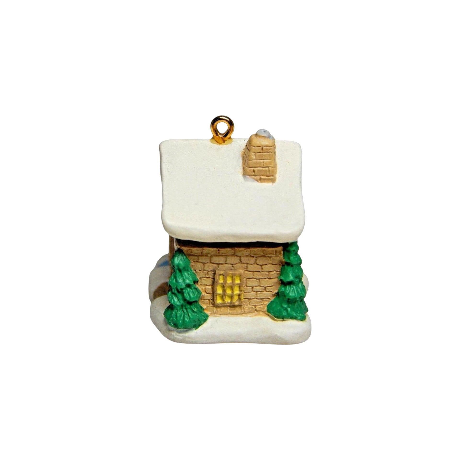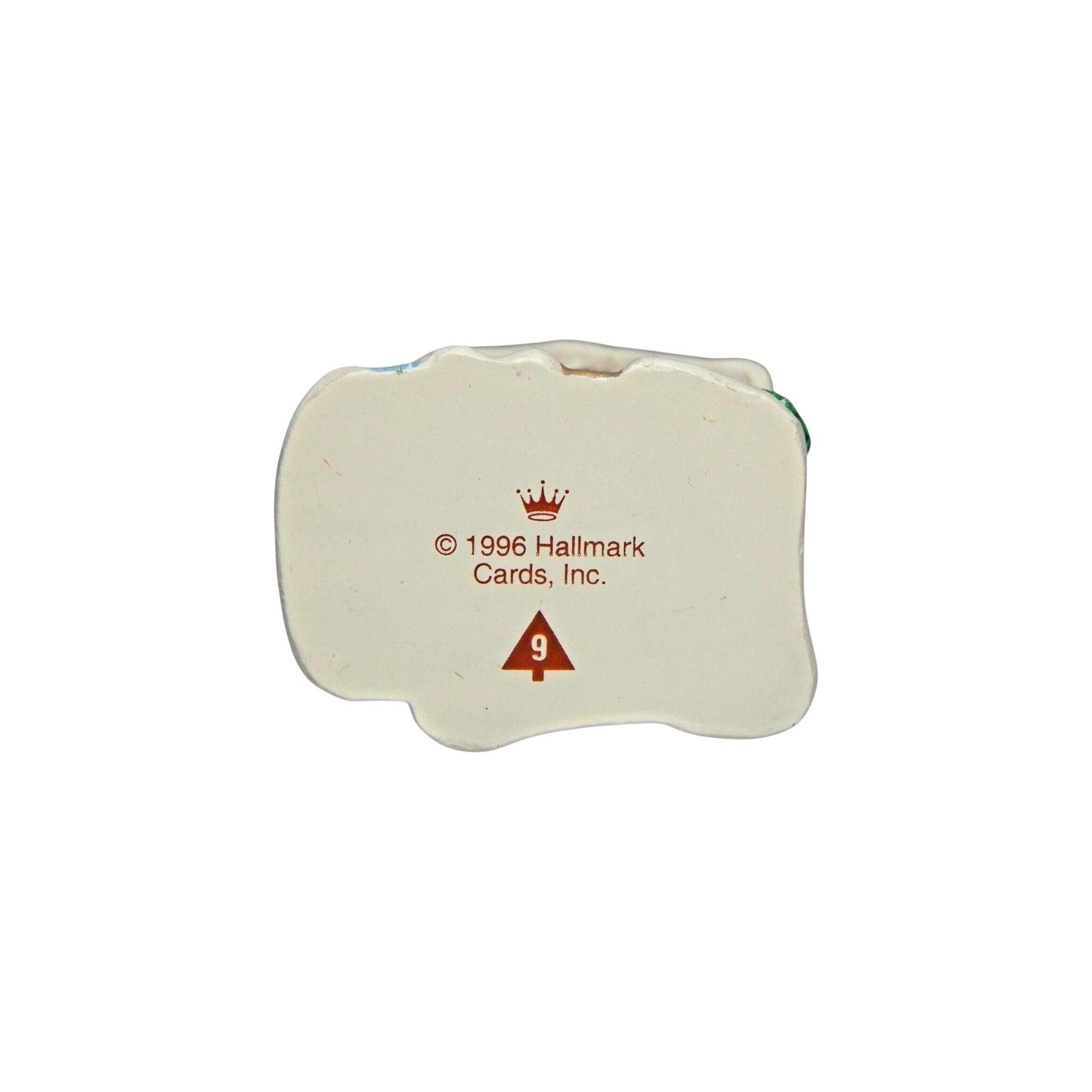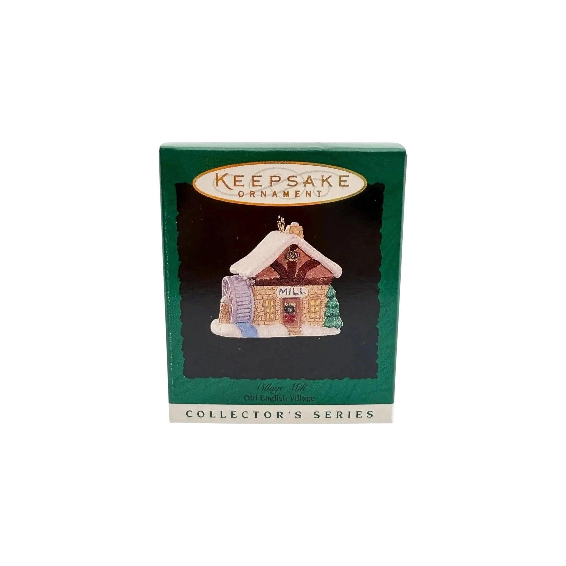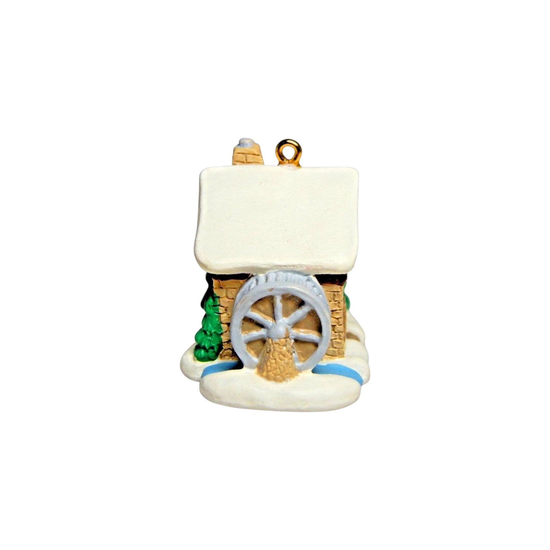 This miniature ornament depicts a rustic old-English style watermill, part of Hallmark’s Old English Village series. It’s ornament #9 in the series and is dated 1996, with “MILL” molded into the side. Designed by artist Dill Rhodus, it features a stone-look base, weathered timber mill structure, and multicolor painted detail that brings out its vintage village charm.