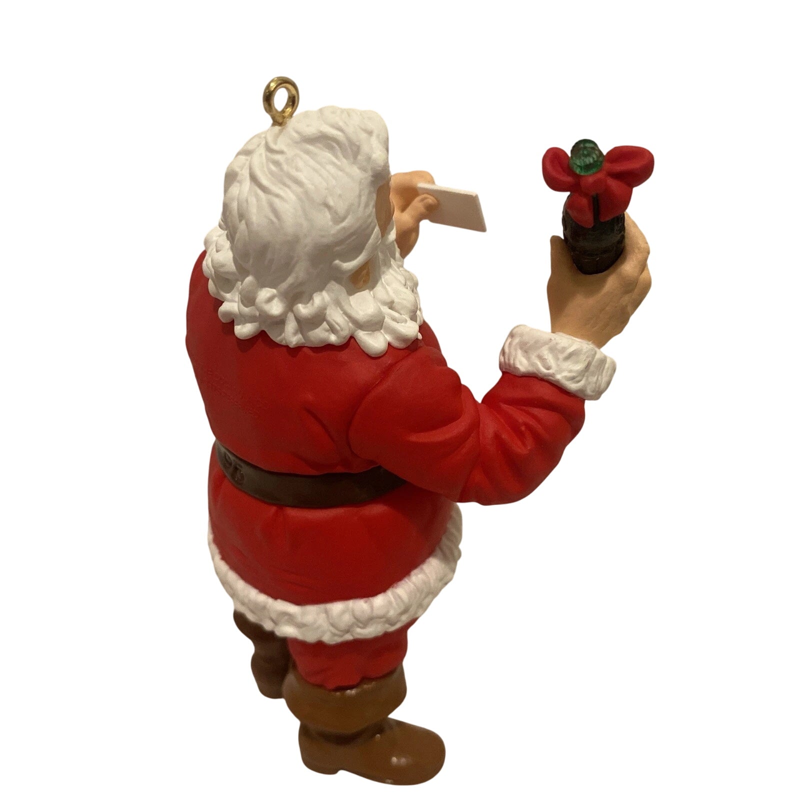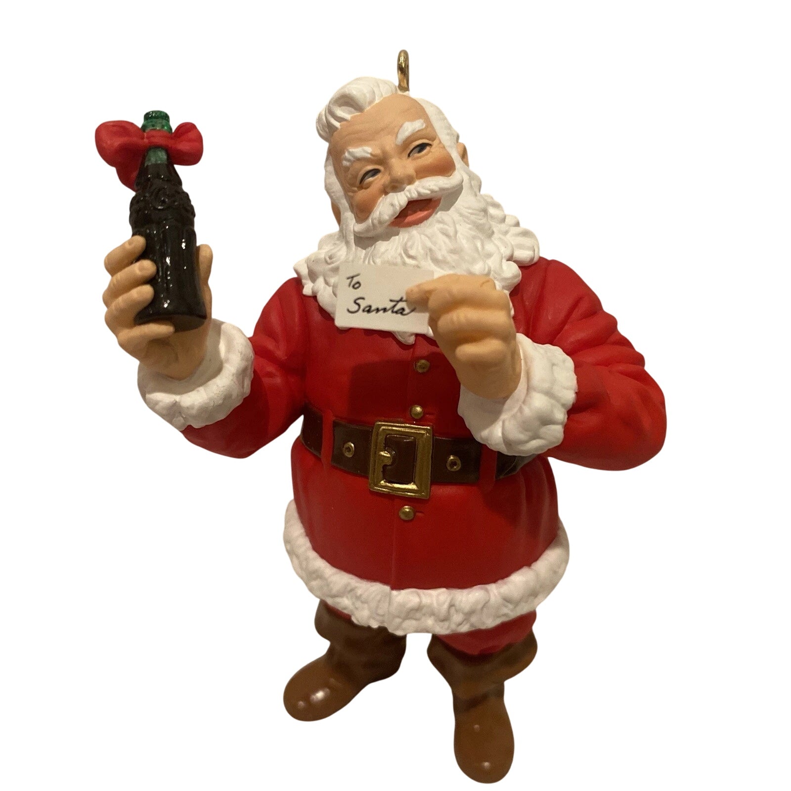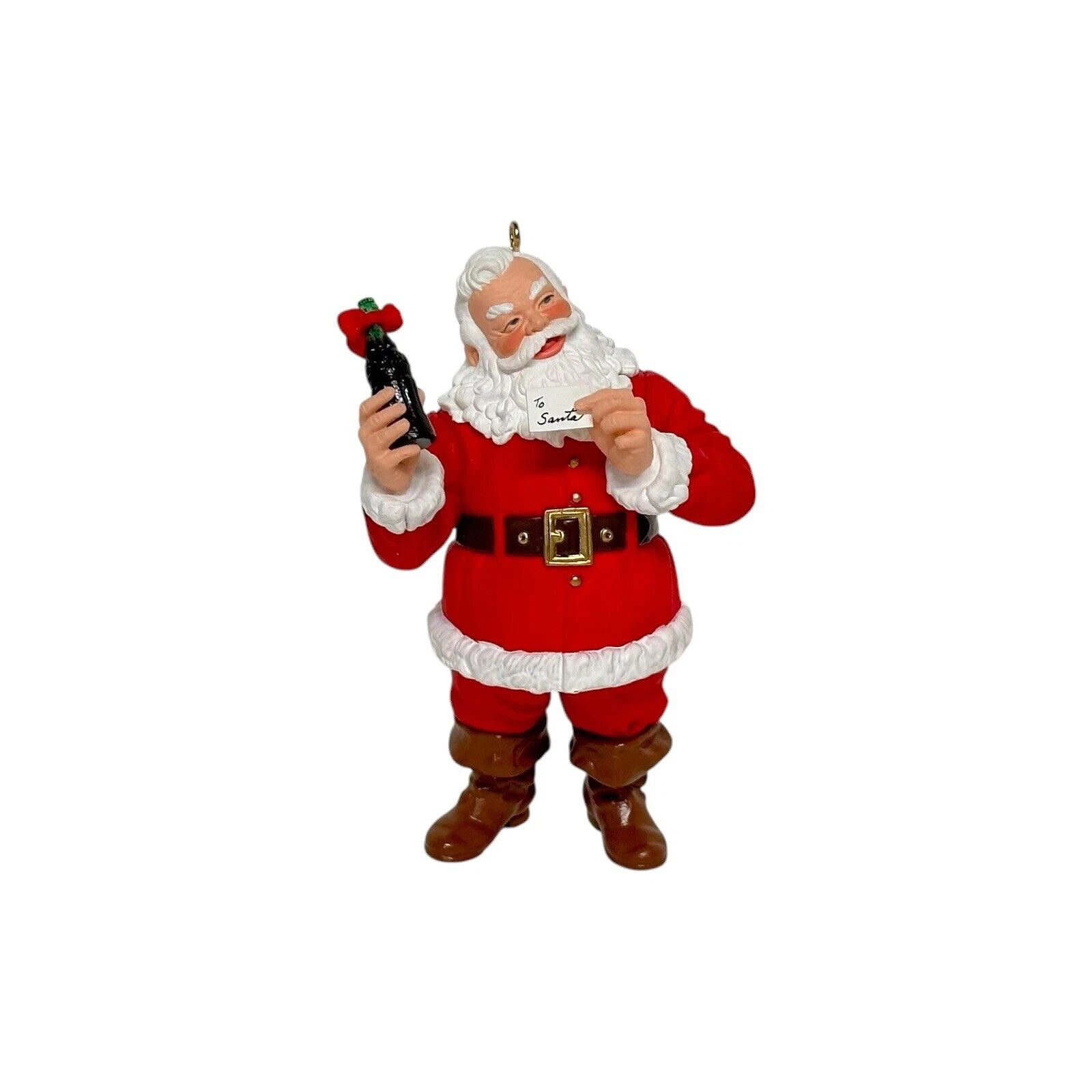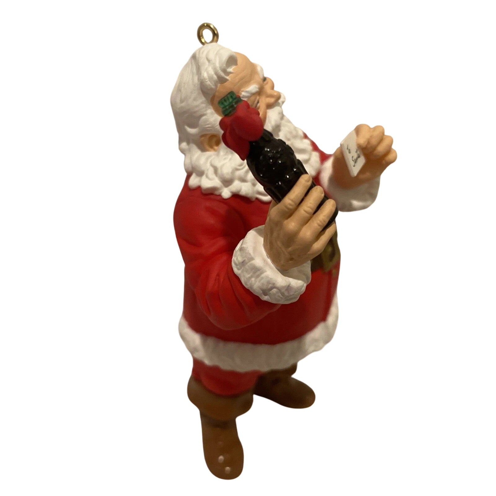 Invite festive cheer into your home with the 1996 Welcome Guest (Coca‑Cola) ornament. Inspired by the classic Haddon Sundblom Coca‑Cola illustrations, this charming piece features Santa Claus holding a Coca‑Cola bottle in one hand and a welcoming note in the other—perfectly encapsulating the spirit of hospitality and holiday joy. Crafted by artist Duane Unruh, the ornament measures approximately 4.23" H × 2.46" W × 1.83" D and is made of resin/mixed materials. It comes with the original Keepsake box and includes a hanging loop for easy display. No batteries or cords are required—simply hang it and enjoy its nostalgic charm.