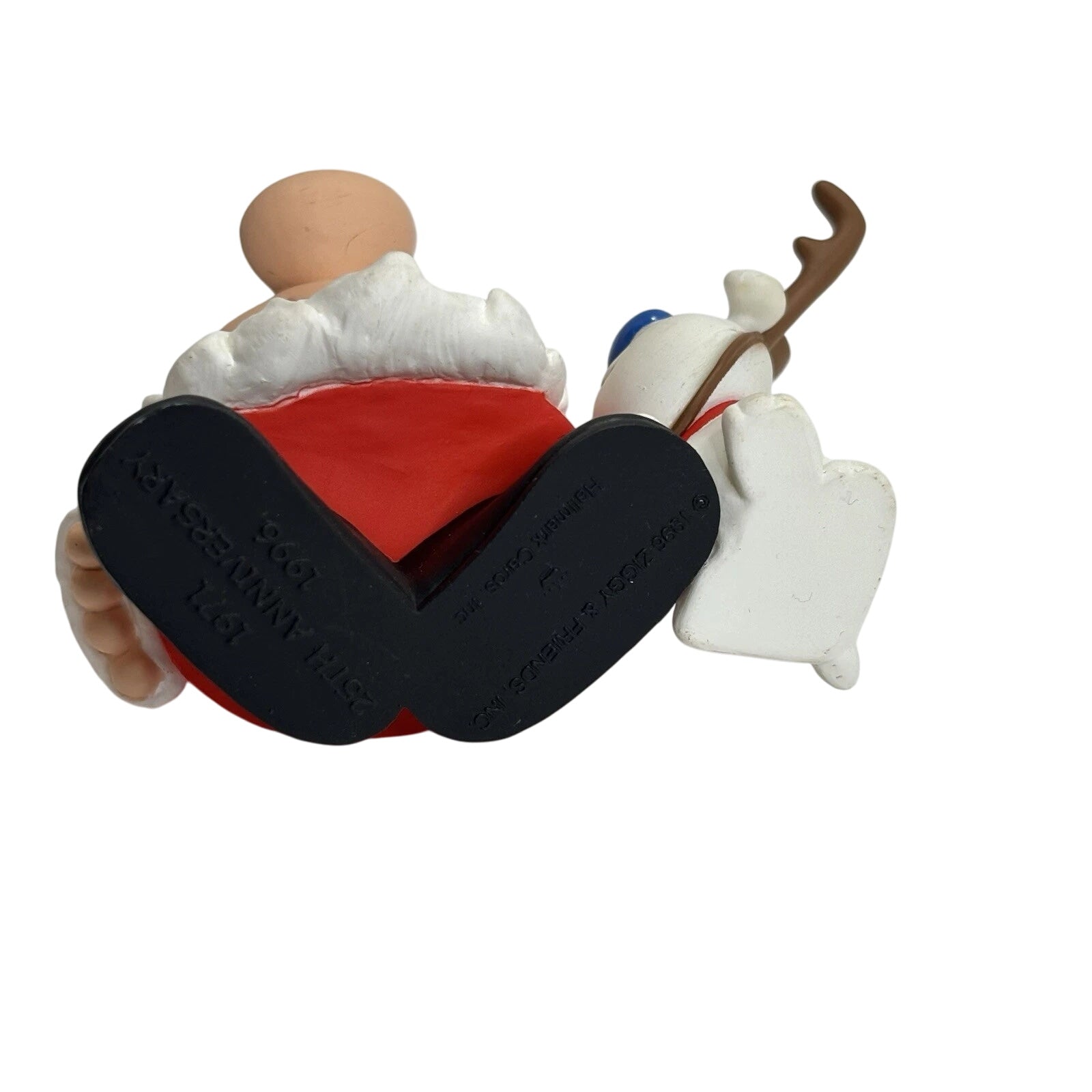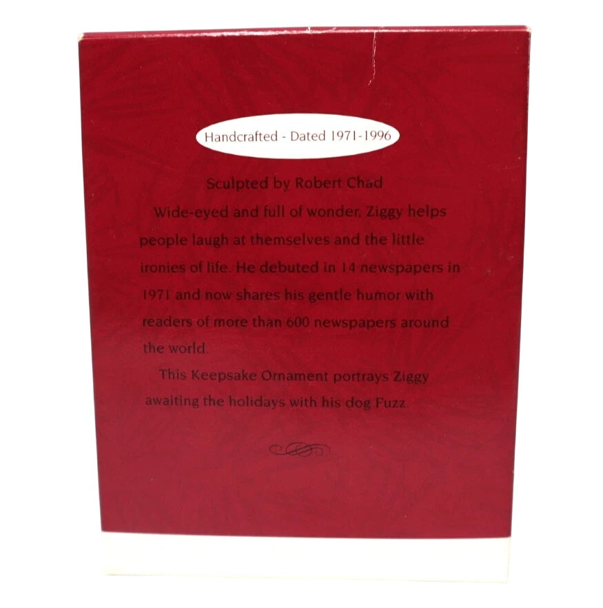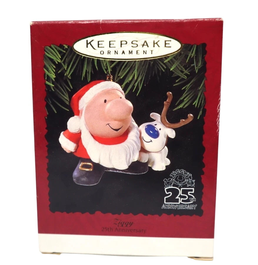 Celebrate a beloved comic-strip milestone with the 1996 Ziggy Keepsake Ornament, created for his 25th Anniversary (1971-1996). This ornament features Ziggy dressed as Santa, accompanied by his loyal dog Fuzz, in a festive, colorfully painted scene that captures Ziggy’s gentle humor and charm.