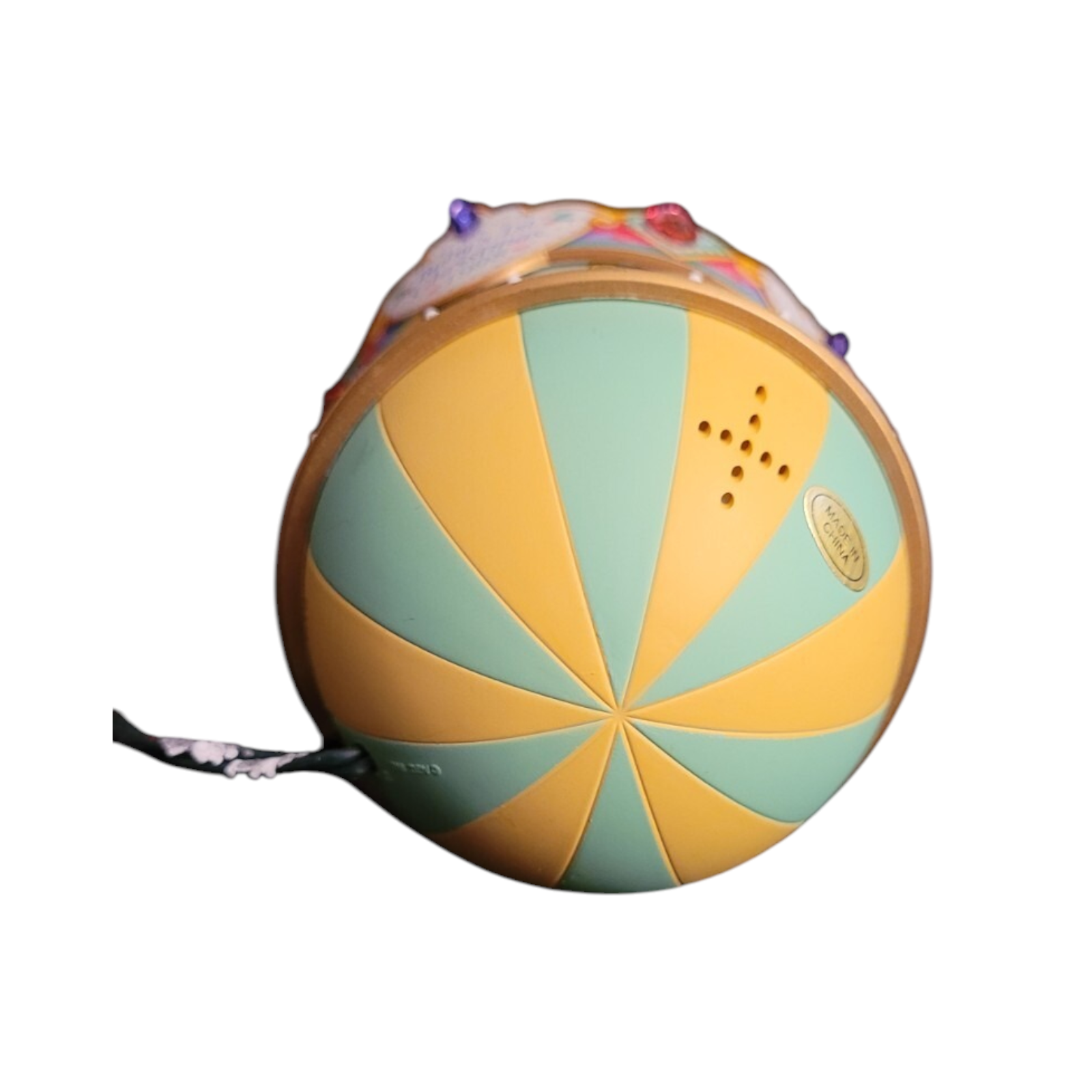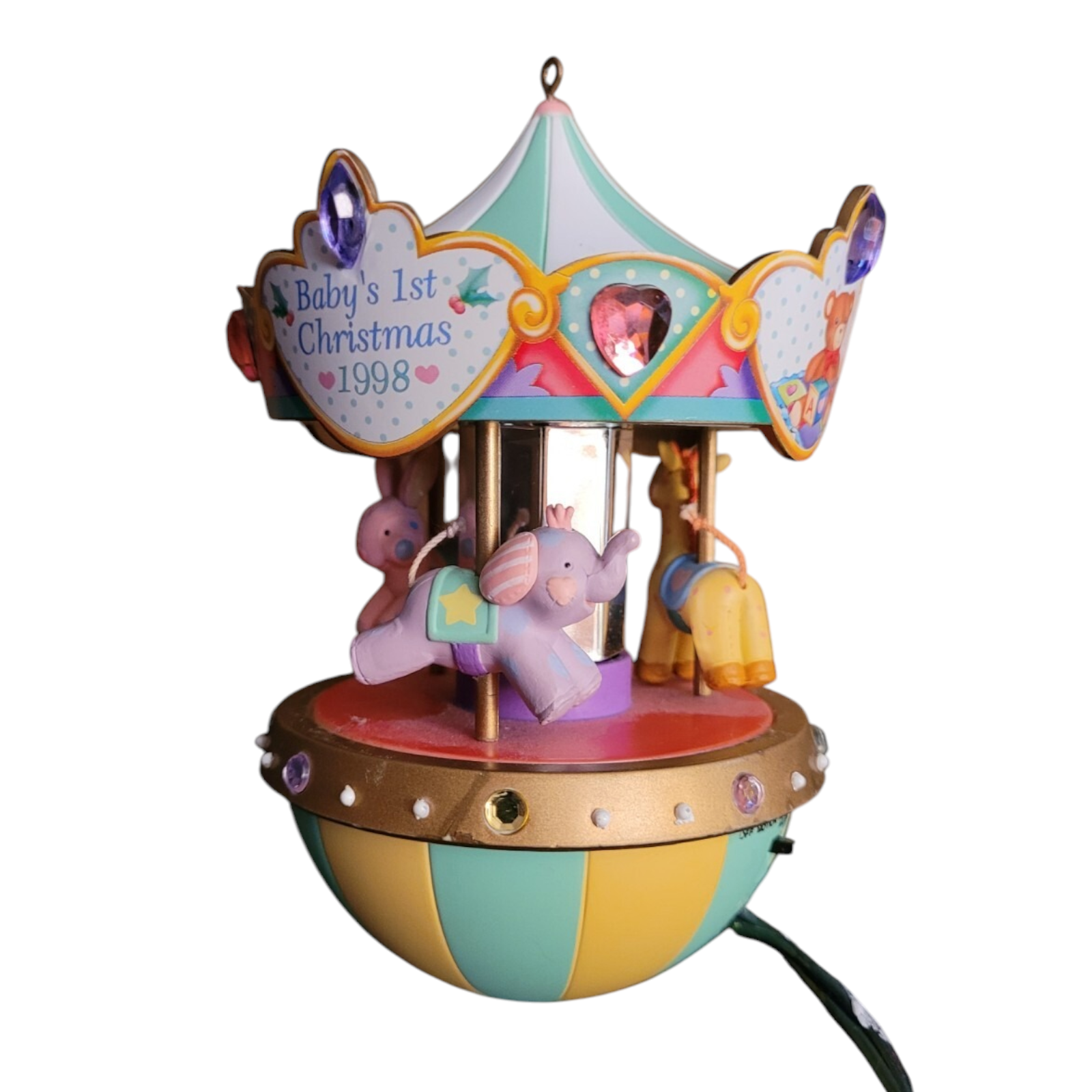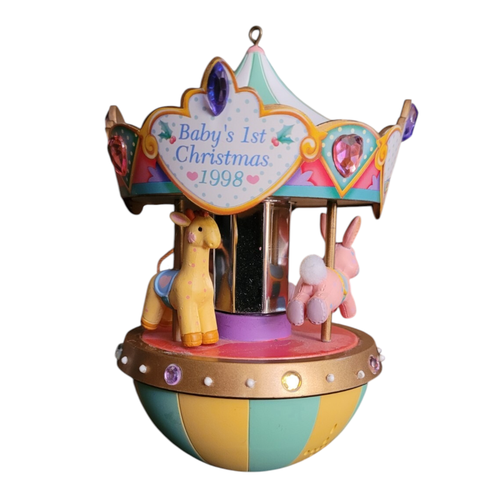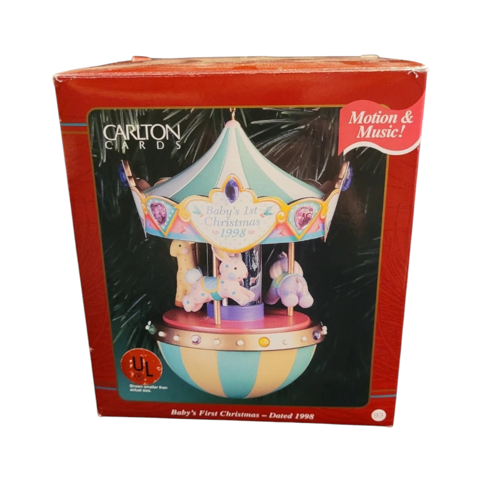 This charming keepsake ornament from the 1997 Carlton Cards Heirloom series commemorates a baby’s first Christmas with pastel-colored motifs of baby shoes, rattles and tender holiday flair. The design features a gentle carousel of tiny figures set within a classic hanging ornament, crafted in mixed media with fine detailing and subtle musical motion. Because it plays a lullaby and spins on a plug-in base, it stands out as both a display piece and collector’s item for new-parents or ornament enthusiasts. Its specific theme and date-marking add to its appeal as a sentimental, memorable holiday keepsake.