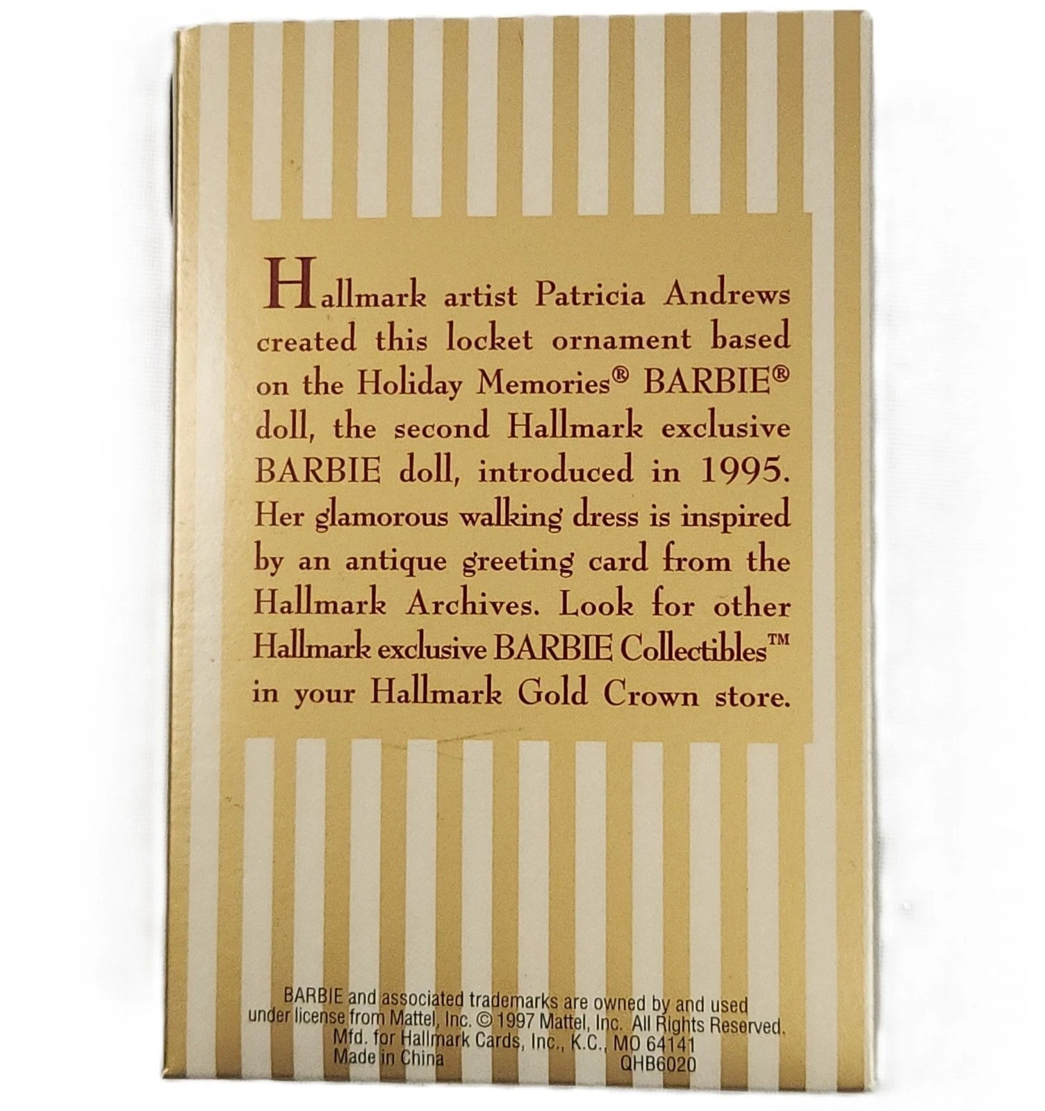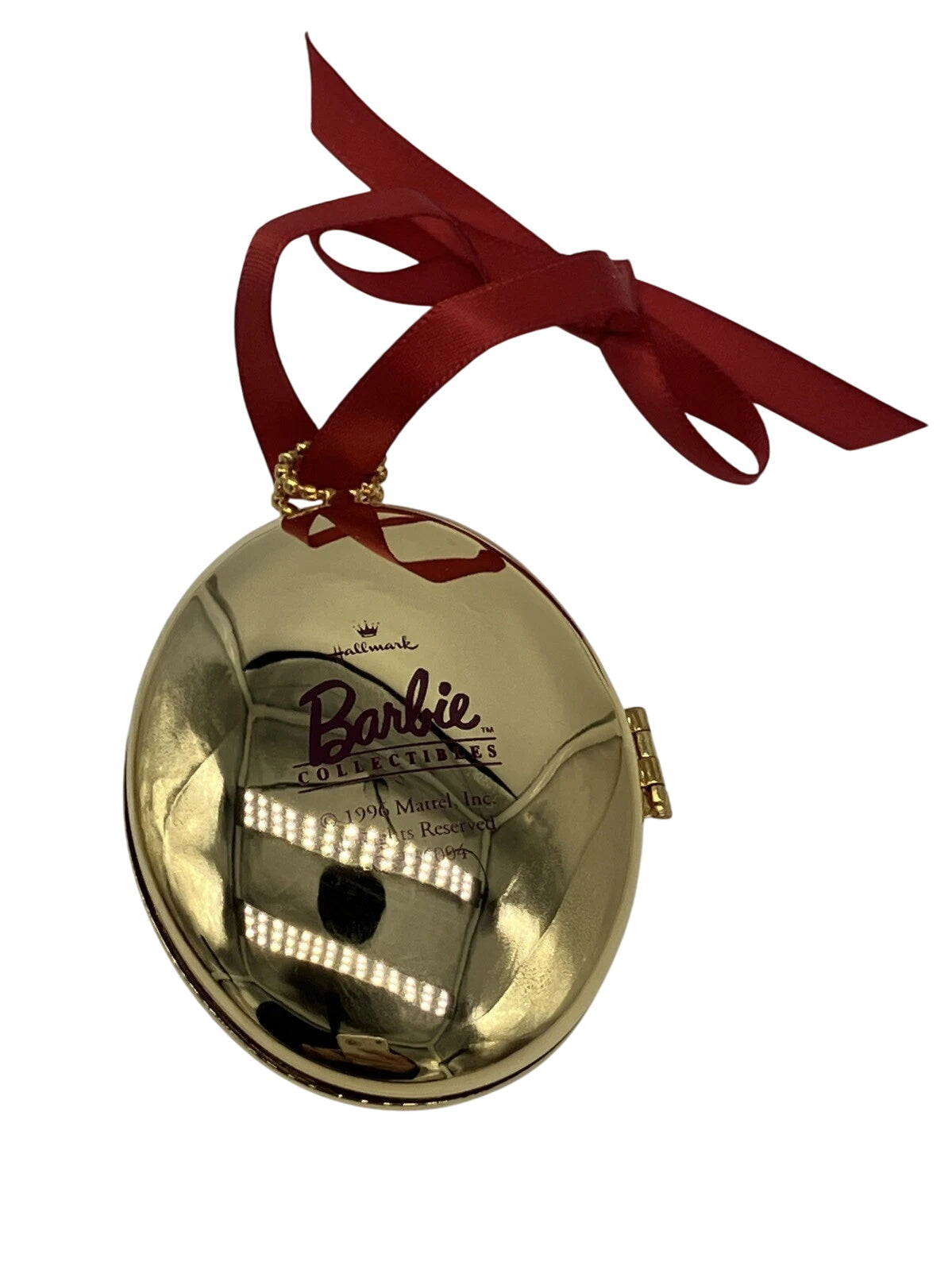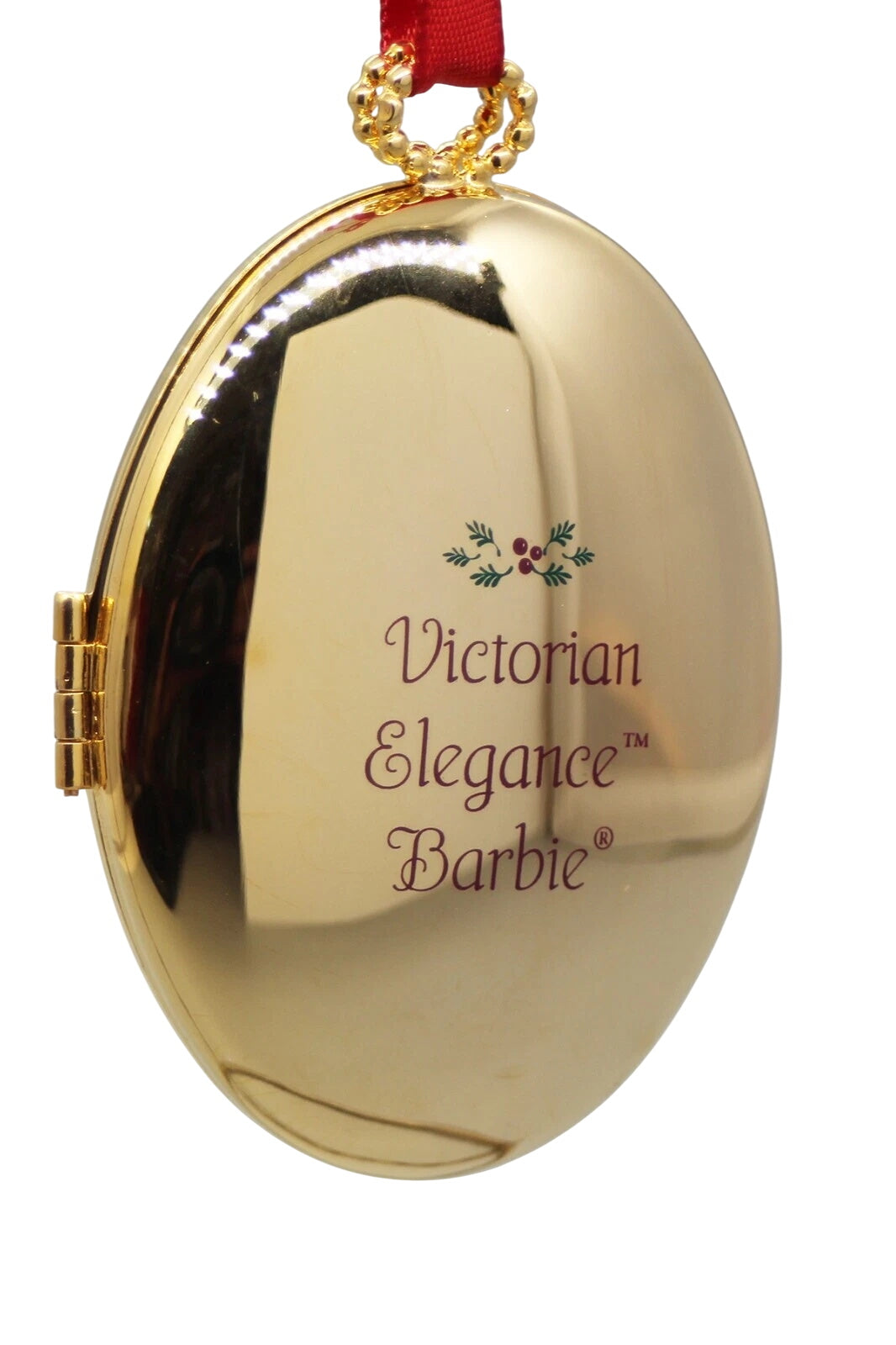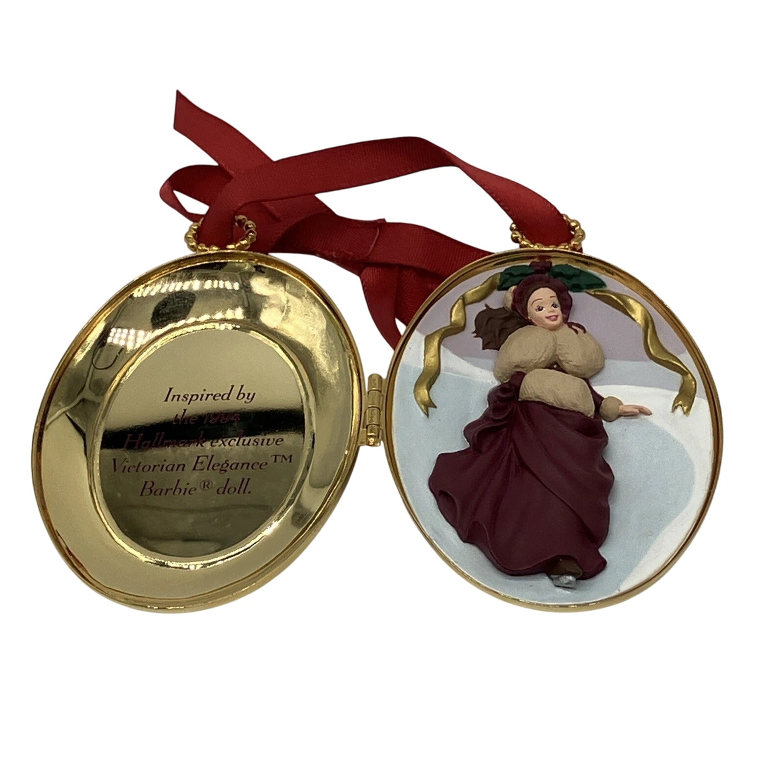 Step into a holiday reverie with the 1997 Barbie Victorian Christmas Collection keepsake ornament. This elegant locket-style ornament features Barbie dressed in a stunning Victorian-era burgundy coat trimmed with white fur, a white muff, and delicate detailing reminiscent of 19th-century holiday fashion. The front opens to reveal a framed scene or sentiment inside, making it both decorative and intimate. When preserved in mint condition, the ornament includes its original Hallmark Keepsake box and hang tag.