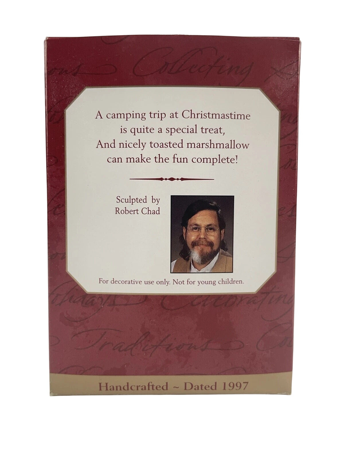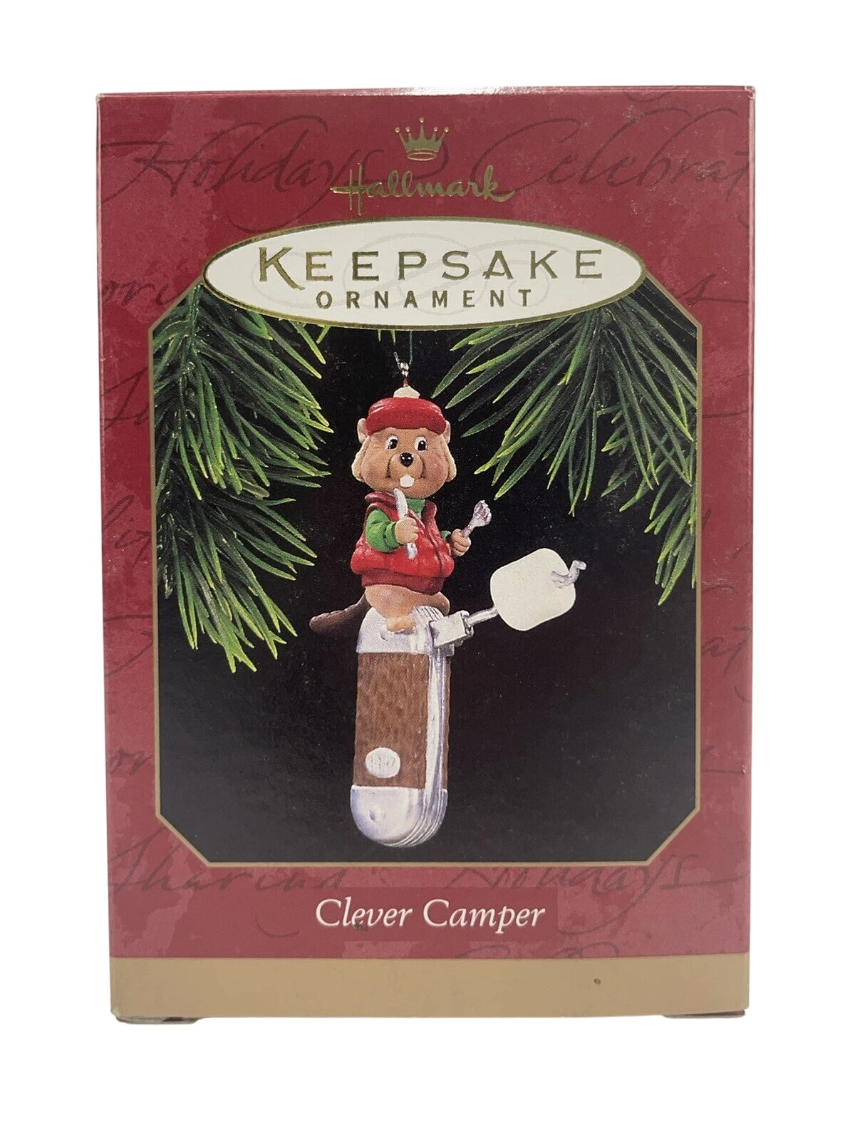 Bring a dash of woodland whimsy to your holiday décor with the 1997 Clever Camper ornament. This charming keepsake features a clever beaver perched on a classic camper, roasting marshmallows over a little campfire using his pocketknife—quintessential camping nostalgia in miniature form. The ornament is a static design (no electronics or lighting), making it a simple yet delightful addition to any tree.