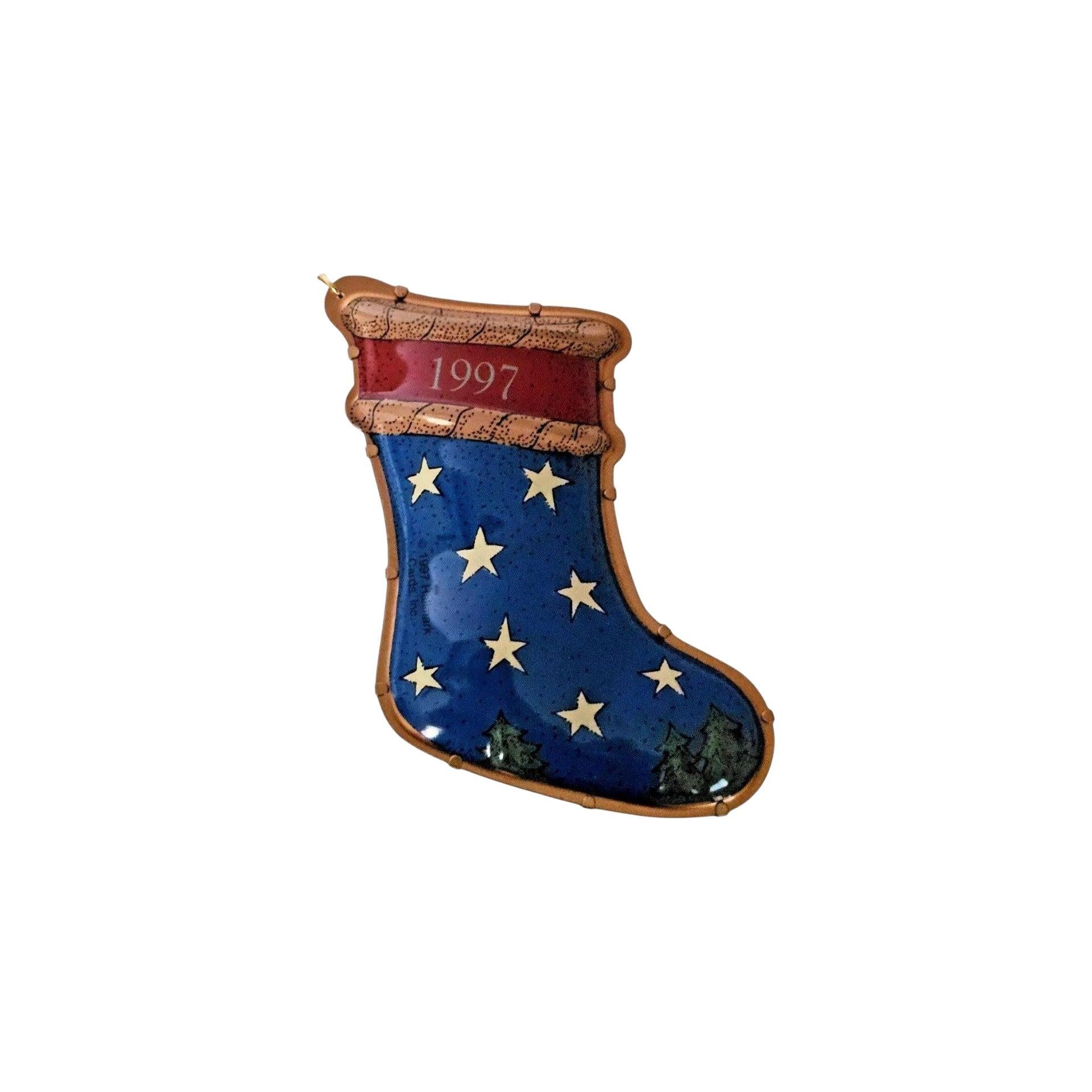 Celebrate the special daughter in your life with this 1997 Hallmark Keepsake Ornament (SKU QX6612). Crafted in pressed tin by artist Katrina Bricker, this piece features a charming stocking motif with angelic details—hovering over a winter village scene—to honor a daughter’s place in the family during the holidays. With its bright colours, dated “97” marking, and collectible tin-stocking style, it’s a thoughtful accent for tree décor or a cherished keepsake that commemorates daughterhood at Christmastime.