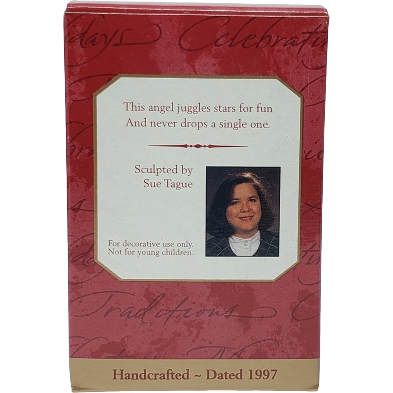 Add a bit of whimsy and wonder to your holiday décor with the 1997 Juggling Stars Keepsake ornament. Featuring an adorable angel dressed in a delicate pastel gown, this miniature captures the magic of the season as she playfully juggles three sparkling stars on golden hoops. Crafted by artist Sue Tague, this fully hand-painted piece arrives mint‑in‑box and ready to enchant—no power or accessories needed.