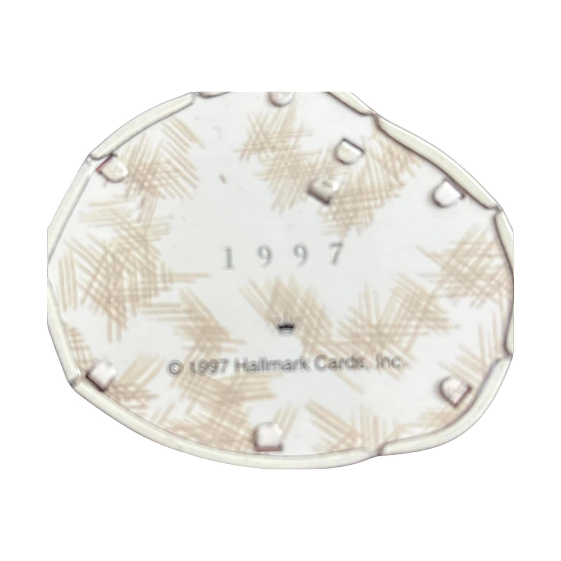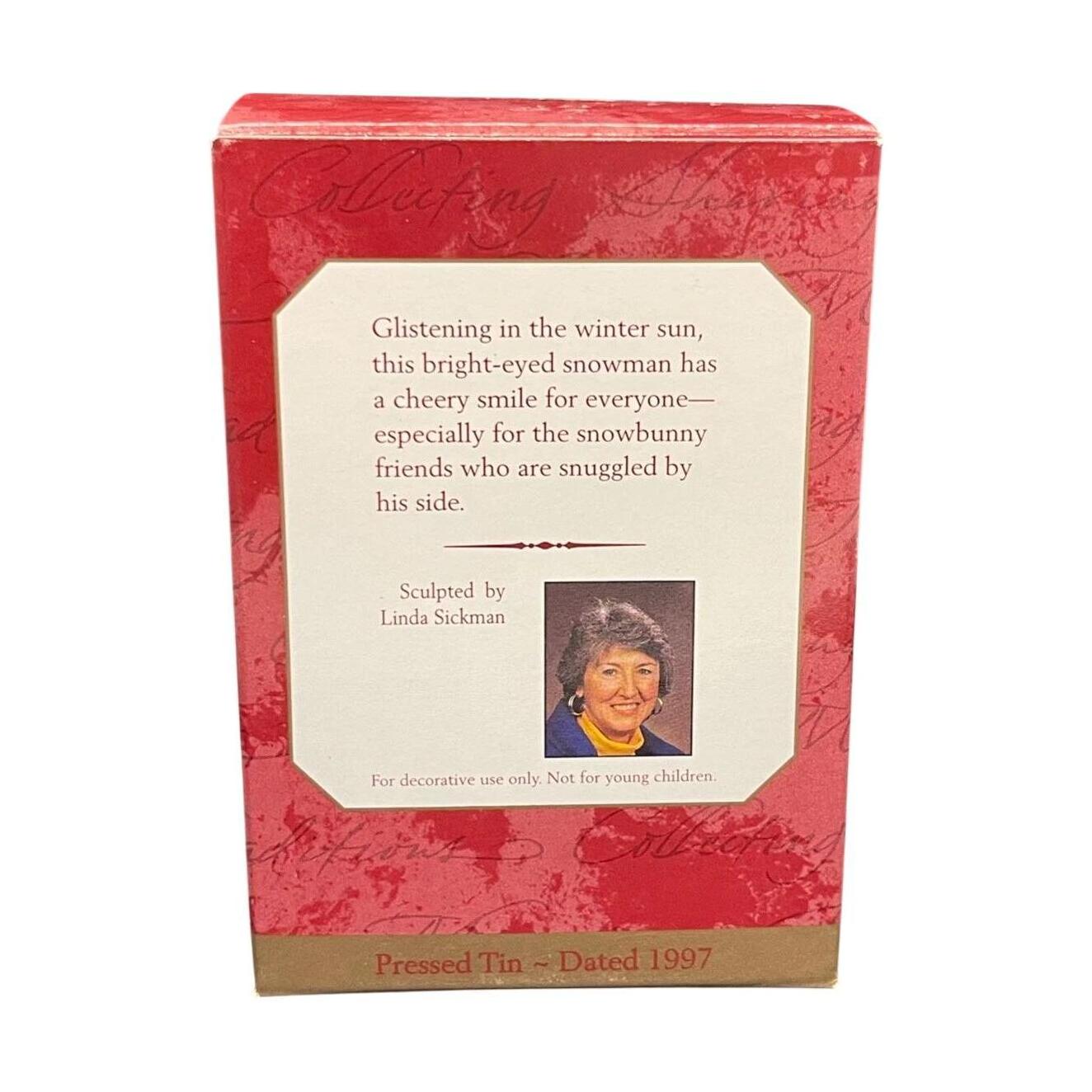 This 1997 release from Hallmark (SKU QX6715) called Meadow Snowman showcases a friendly tin snowman wearing a top hat, scarf and broomstick, with a little bunny companion at his base. It’s designed by artist Linda Sickman and crafted in colorful painted tin, providing a cheerful winter scene with nostalgic charm. Sized at approximately 3.597″ H × 3.574″ W × 1.822″ D, this dated-1997 ornament blends classic snowman iconography with mid-90s Hallmark styling.