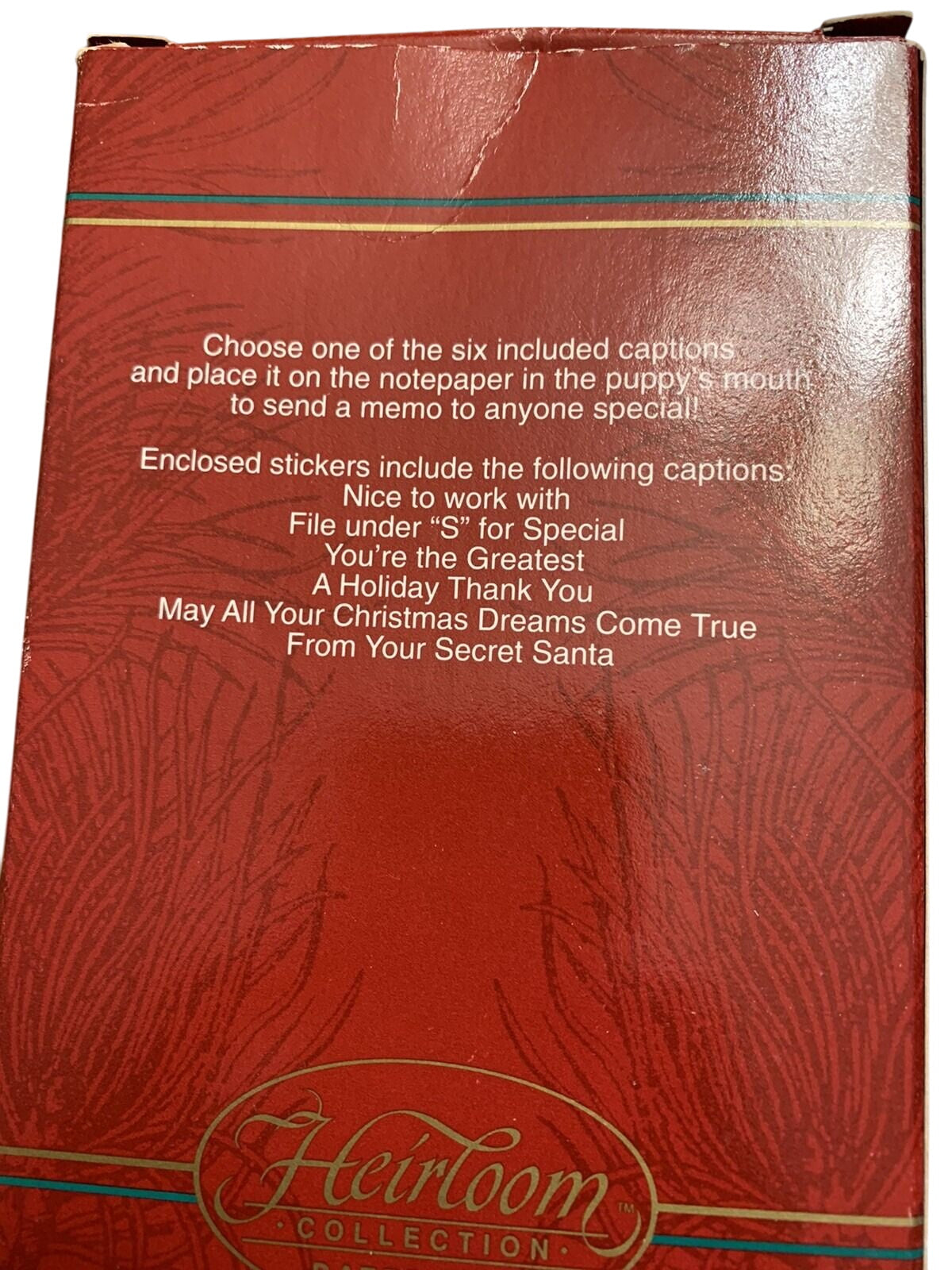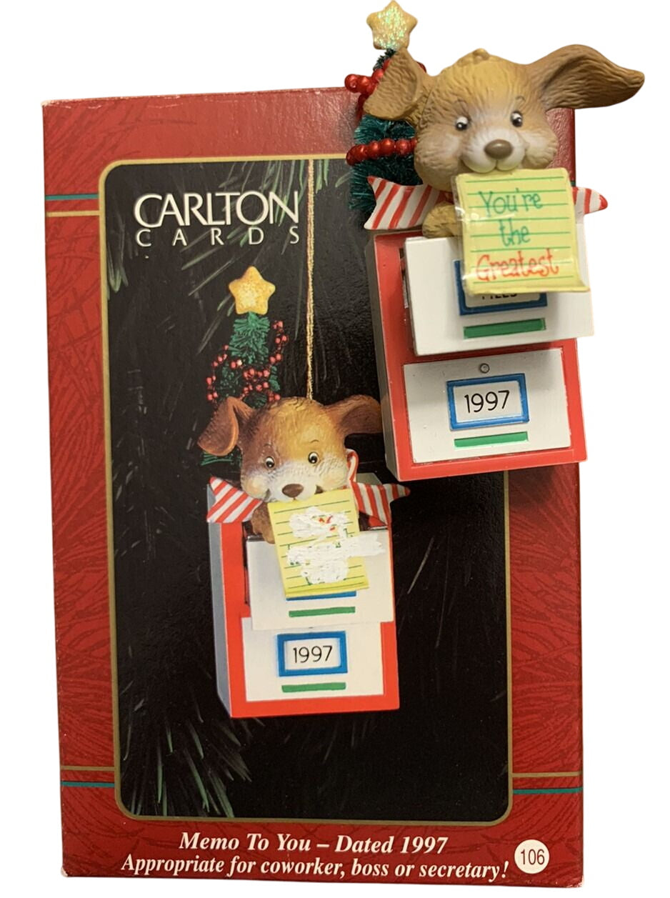 This thoughtful ornament from the 1997 Carlton Cards Heirloom “Memo to You” series features a miniature notepad motif with space for adjustable stickers such as “You’re the Greatest,” making it a perfect gift for a coworker, boss or secretary. The design is molded in plastic or resin with fine paint detail and includes the notepad accent that enhances the office-friendly theme and collector appeal. Its date-specific branding (1997) combined with practical sentiment and collectible finish make it an appealing keepsake for friendship or professional appreciation. With the dual appeal of work-friendly gifting and vintage holiday décor, it stands out among themed ornaments for both sentiment and style.