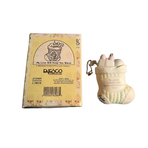 The Precious Moments 272965 "My Love Will Keep You Warm" Ornament would make a perfect gift for someone special in your life, adding a touch of love and warmth to their holiday decor.