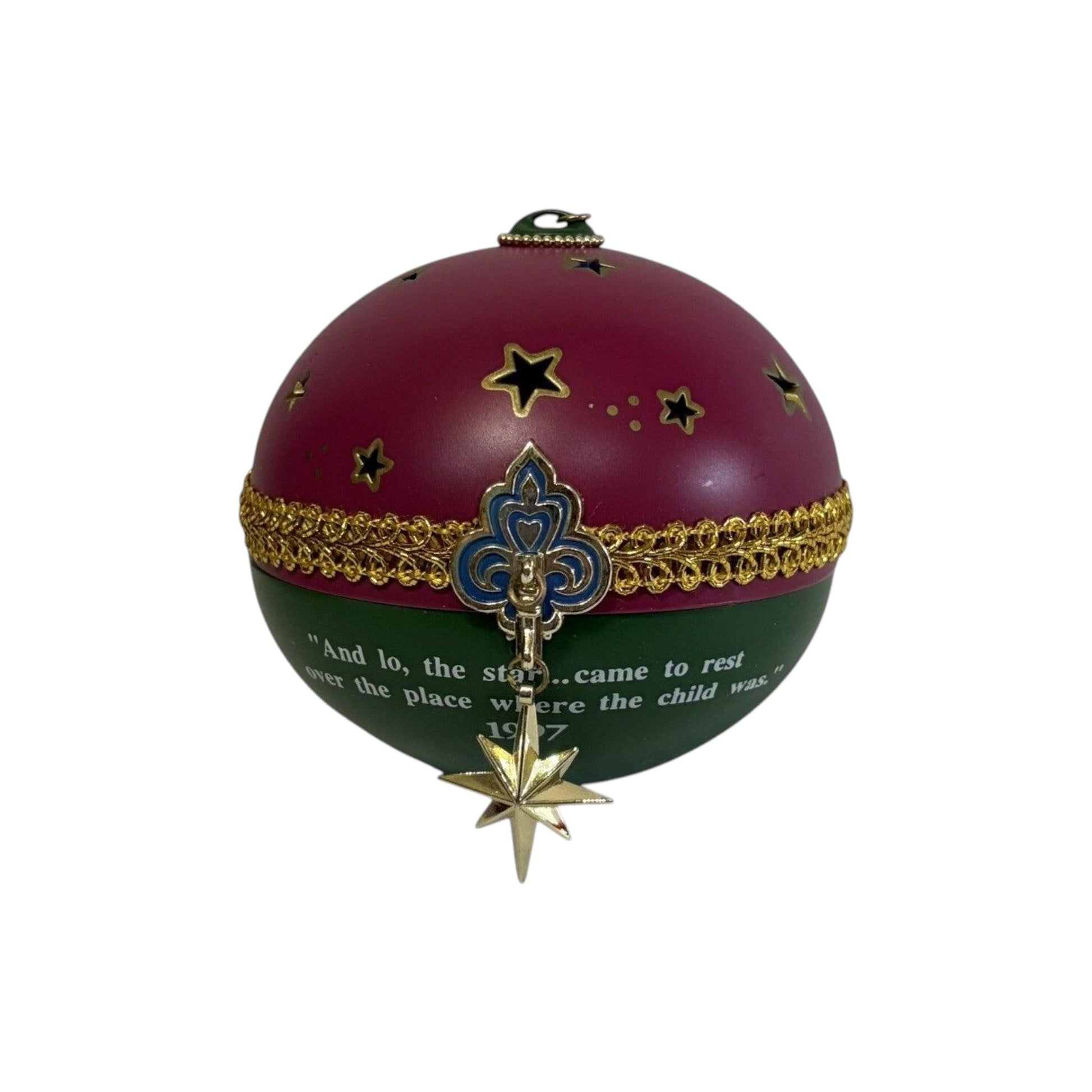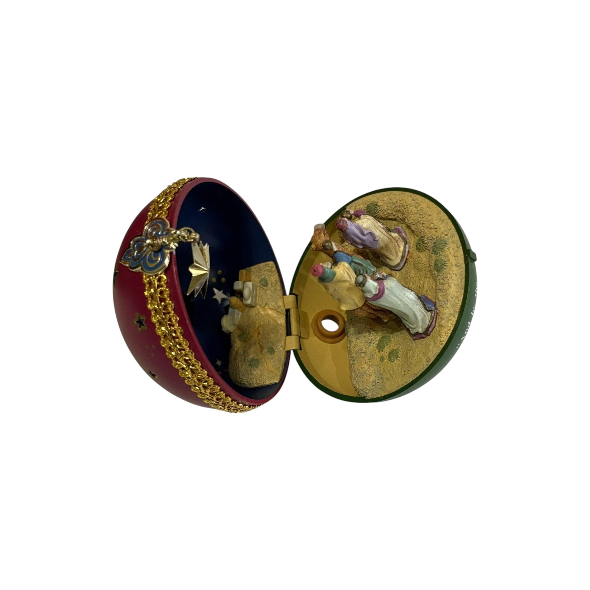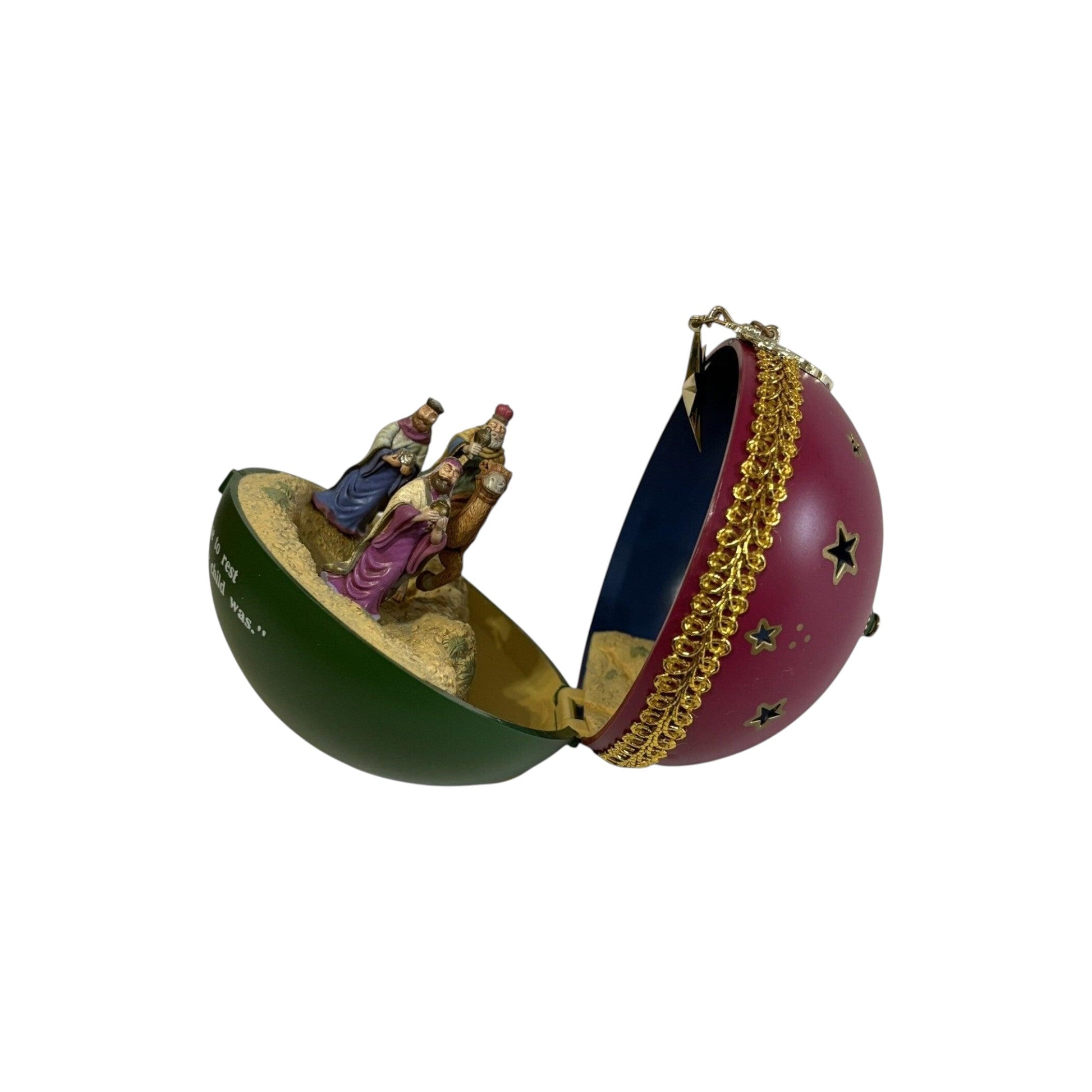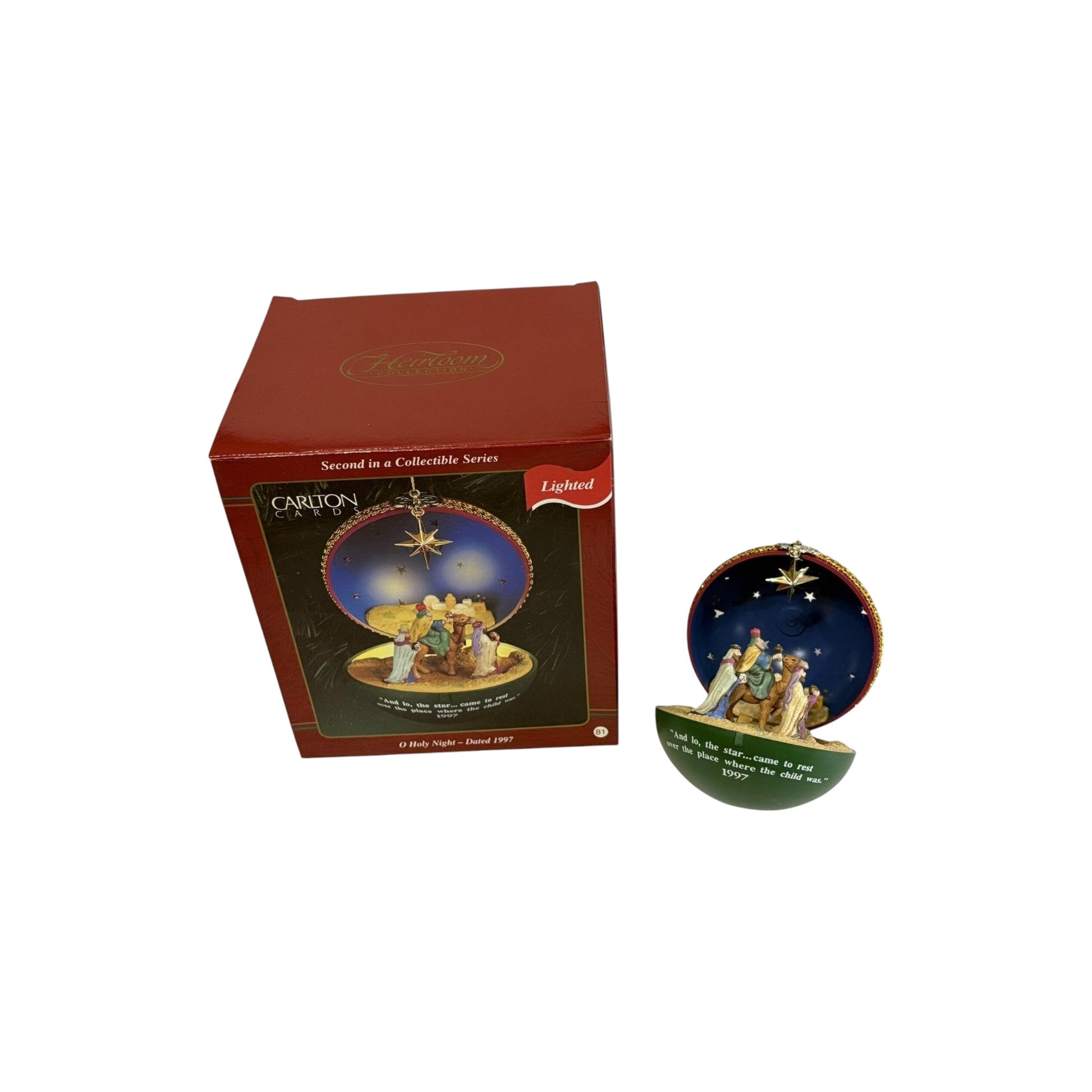 This illuminating ornament from the 1997 Carlton Cards Heirloom “O Holy Night” collection presents a timeless nativity scene—Mary, Joseph and the Christ child set against a back-lit manger motif, designed to light when a tree‐bulb is inserted. The finely molded figure is crafted in mixed materials with a painted finish that highlights the silhouettes and brings a sacred holiday moment to your tree. Because it’s part of a dedicated religious themed line, this piece appeals to both faith-oriented decorators and heirloom ornament collectors. Its date-specific year and light-up function elevate it beyond standard décor to a meaningful collectible.