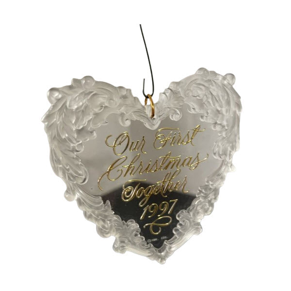 This sentimental keepsake ornament is shaped like a stylized heart (or acrylic heart-style), engraved or printed with the phrase “Our First Christmas Together” and dated 1997. It is designed to commemorate a couple’s first Christmas together, making it an ideal gift for newly-weds or couples celebrating their first holiday season. According to Hallmark’s official product listing, the ornament measures approximately 3.317″ H × 3.173″ W × 0.325″ D. The design is simple yet meaningful, appealing to collectors of “first Christmas” themed ornaments, romance/gift-oriented décor, and vintage Hallmark pieces.