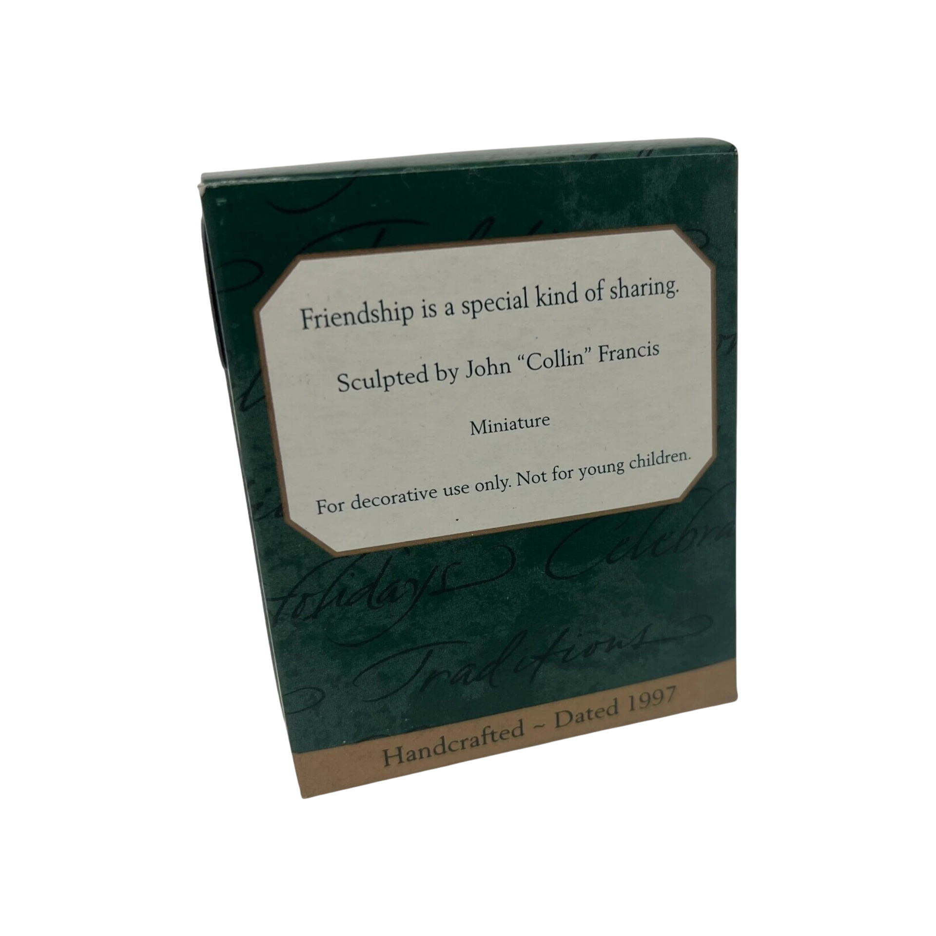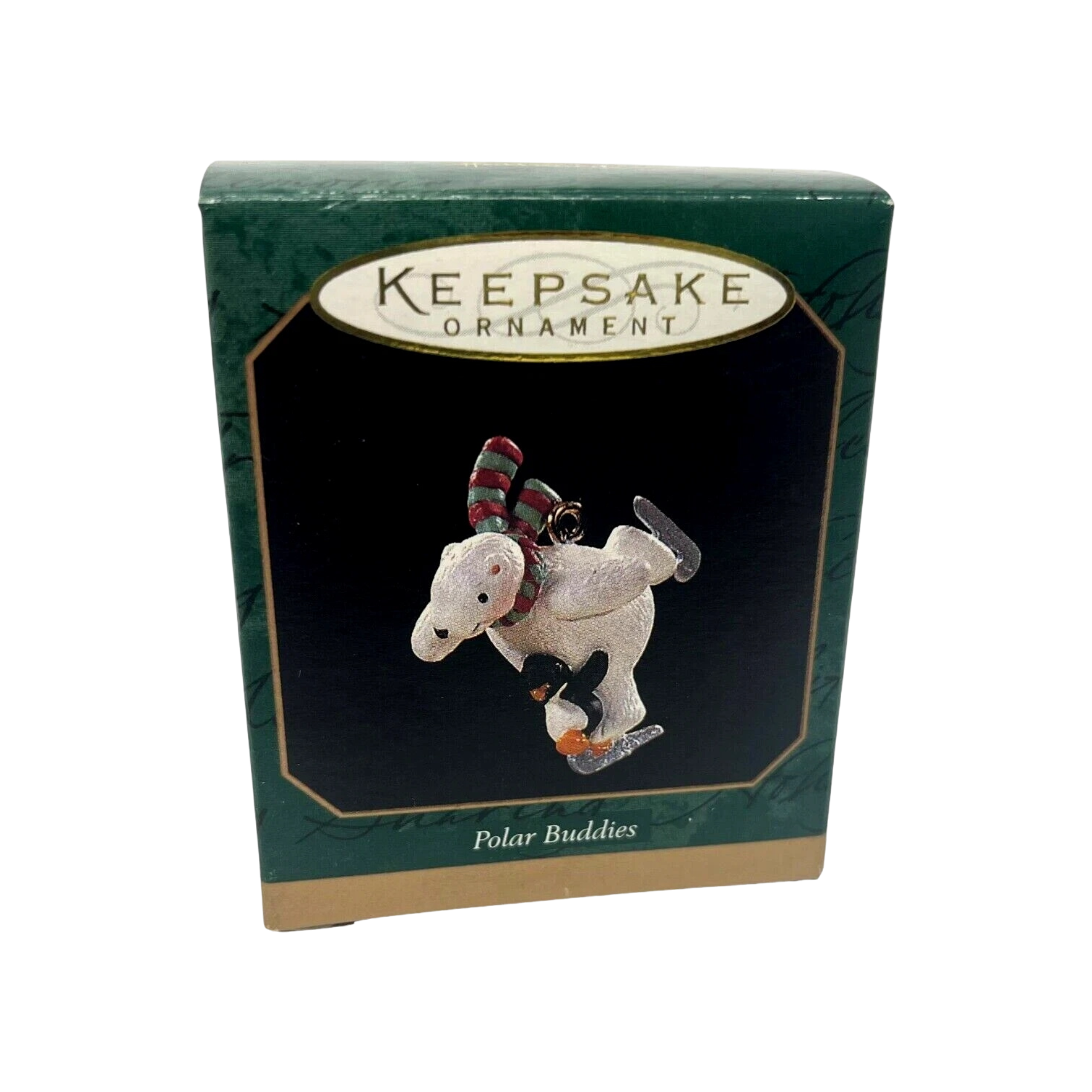 This 1997 miniature ornament — part of Hallmark’s Polar Buddies collection — features a playful polar bear and a penguin ice-skating together, capturing a wintry, friendship-themed holiday moment that’s both whimsical and heartwarming. The ornament is designed for smaller or tabletop Christmas trees, or as part of a miniature ornaments collection. When in “mint in box” condition, the piece comes with its original box and hanging loop/tag — ideal for collectors, gifting, or display. The ornament is purely decorative: no lights, sound, motion, batteries, cords, or power strings required