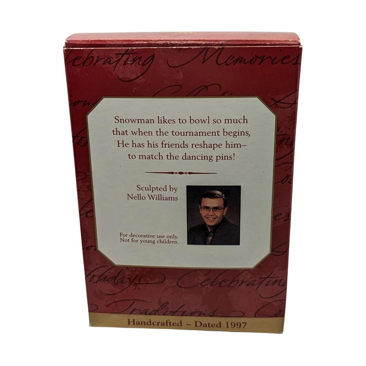 This fun and whimsical 1997 Hallmark Keepsake ornament (SKU QX6395) titled “Snow Bowling” features a snowman cleverly designed in the shape of a bowling pin, complete with stick-arms, a carrot nose, red Santa hat and festive red & green scarf. The unique bowling theme (perfect for sports or bowling fans) paired with wintry charm makes it a standout piece for holiday décor or collector displays. The sculptor credited is Nello Williams.