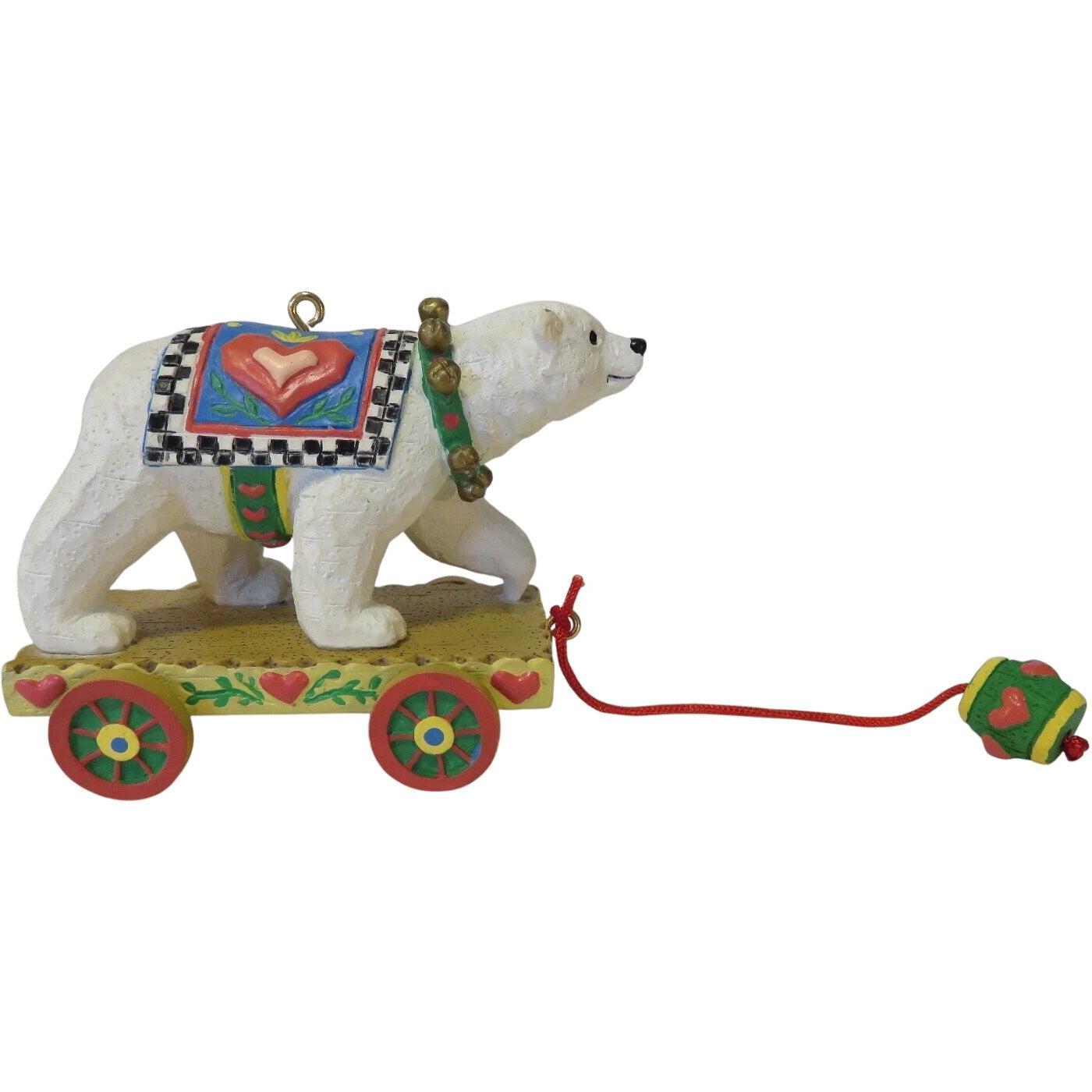 Delight in holiday nostalgia with the 1997 Toymaker’s Treasure ornament by Carlton Cards. This playful piece features a white polar bear-themed pull-toy on wheels, complete with a red saddle and festive green-and-gold embellishments that evoke toy-shop charm. Display it in its original Carlton Cards Heirloom Collection box—complete with protective plastic window and collector’s tag. Hang it effortlessly—no batteries, cords, or lights needed for this whimsical keepsake.