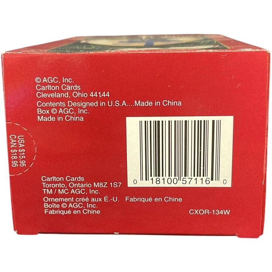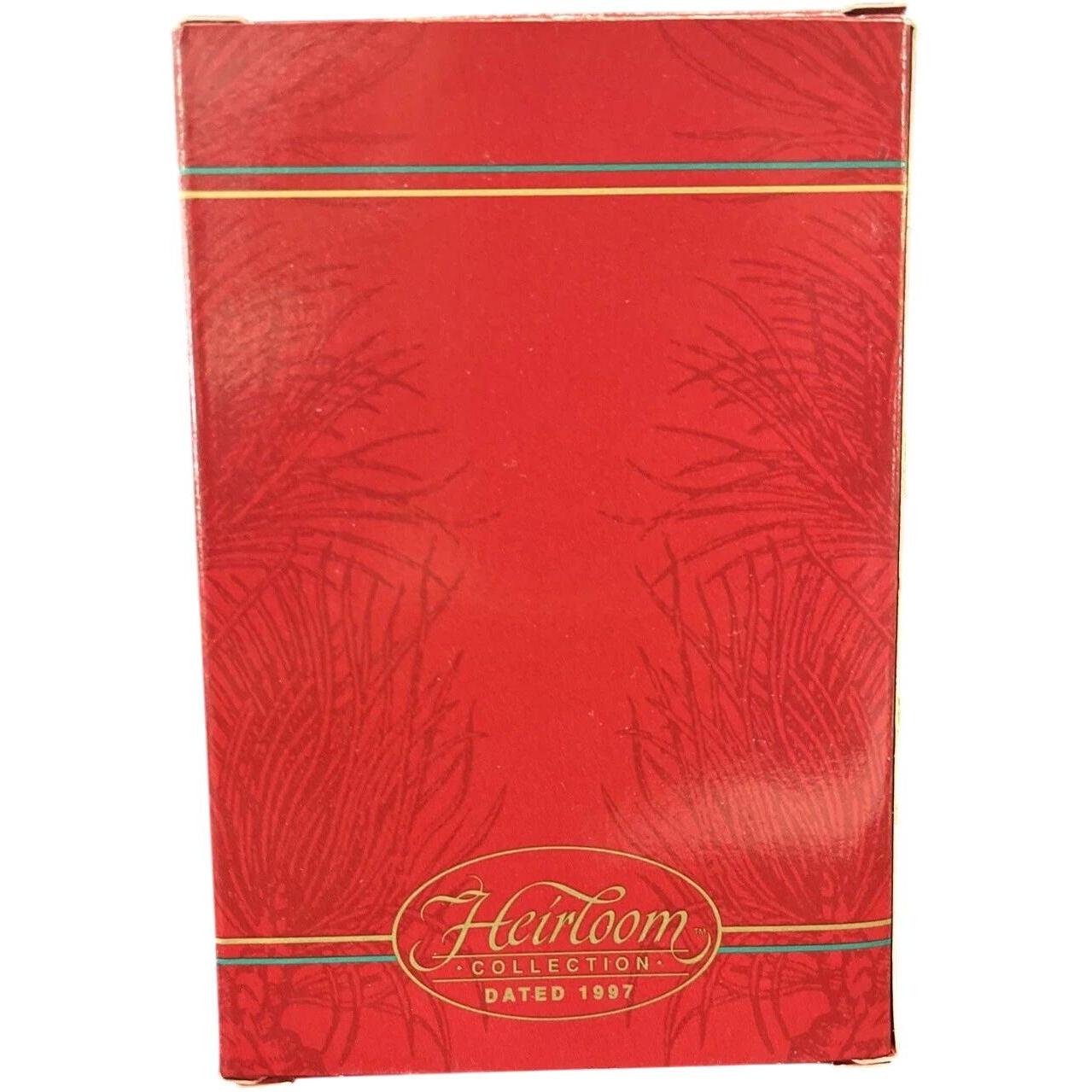 This elegant ornament from the 1997 Carlton Cards Heirloom collection features a heart-shaped locket design with a gold-tone finish and ribbon hanger, opening to reveal the verse “Love is the gift of Christmas.” The piece blends romantic sentiment with holiday elegance, making it a meaningful keepsake or gift for a loved one. With its dated release and heirloom branding, it holds collectibility appeal for ornament enthusiasts and memory-keepers alike.