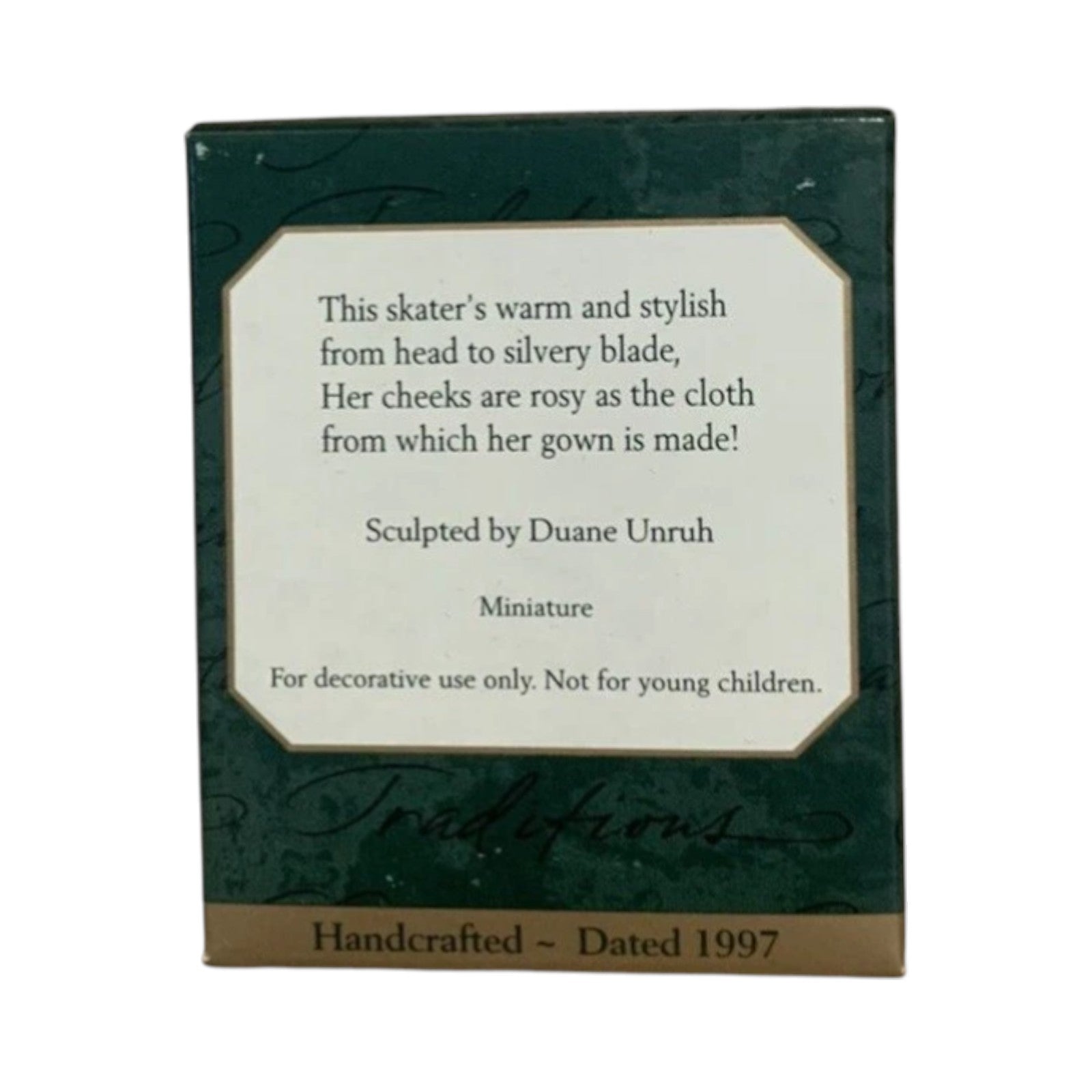 Celebrate the elegance of a bygone era with the 1997 Hallmark Keepsake Miniature ornament titled Victorian Skater (SKU QXM4305). This tiny keepsake features a graceful figure skater dressed in Victorian–era attire, gliding over a delicate icy surface. Sculpted with fine detail by artist Duane Unruh, the ornament evokes vintage charm and holiday sophistication—in miniature form. Its compact scale and dated release make it especially appealing to 1990s Hallmark collectors, figure-skating enthusiasts, or anyone decorating a tree with a Victorian or vintage theme.
