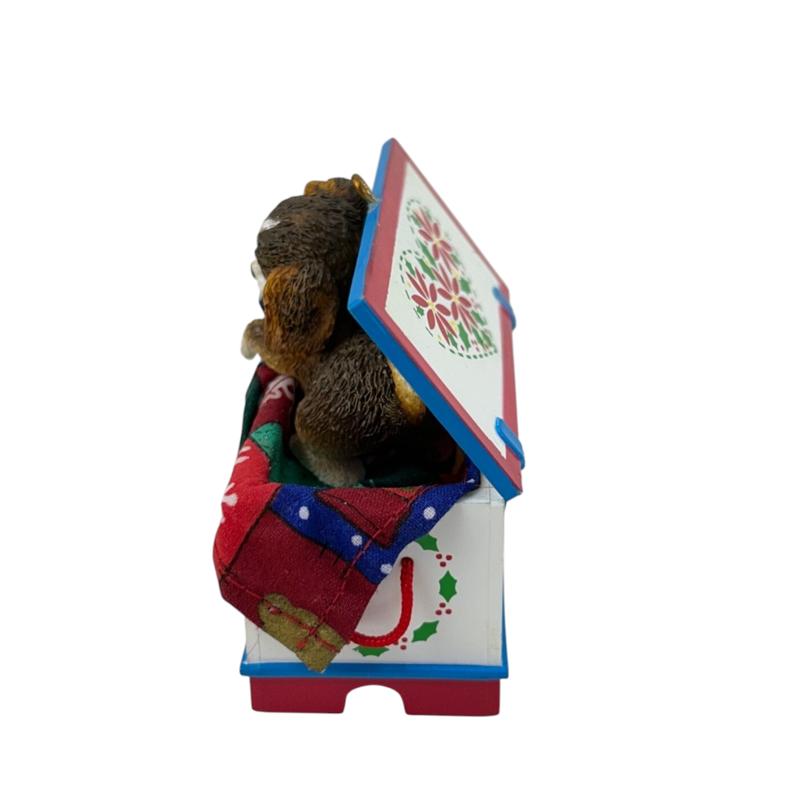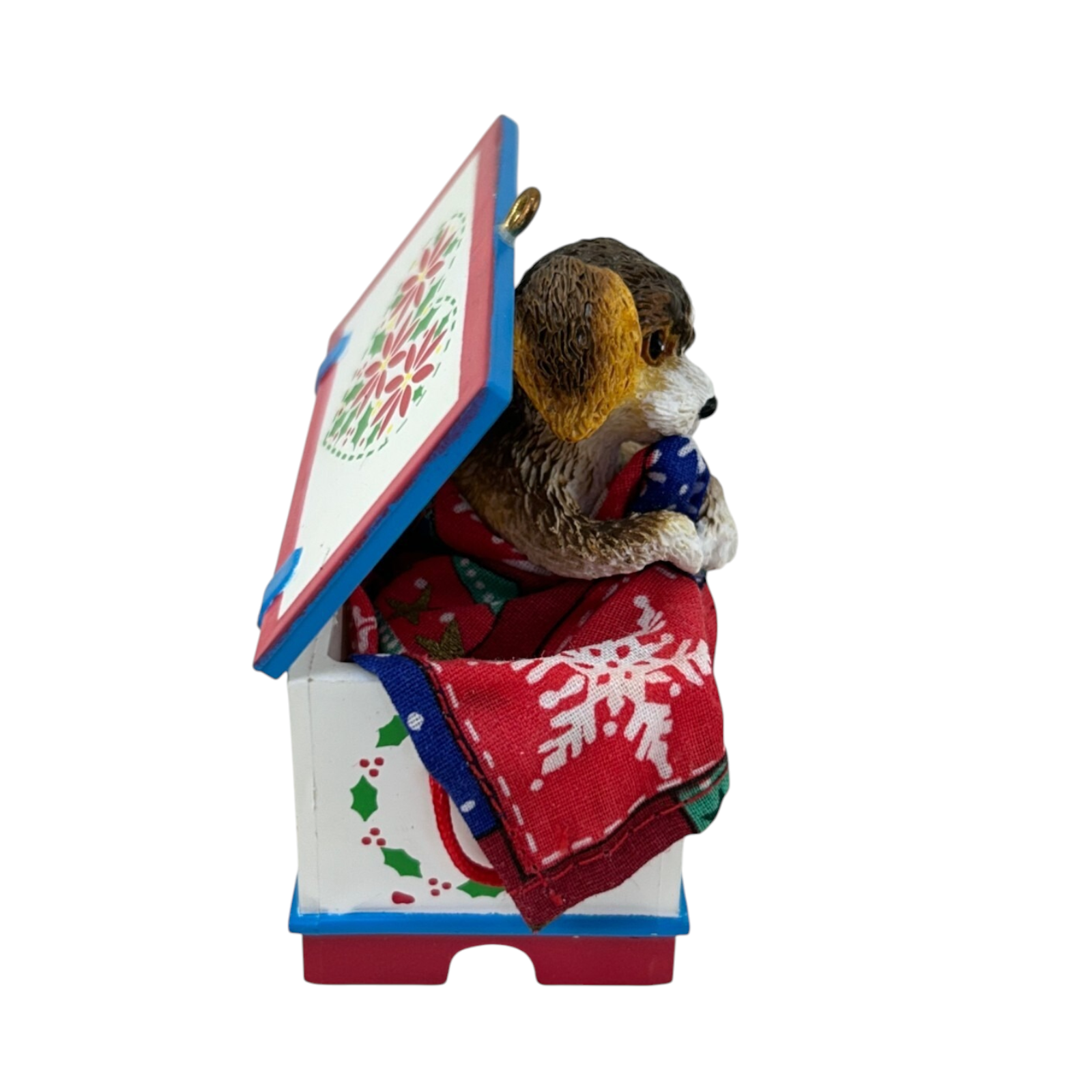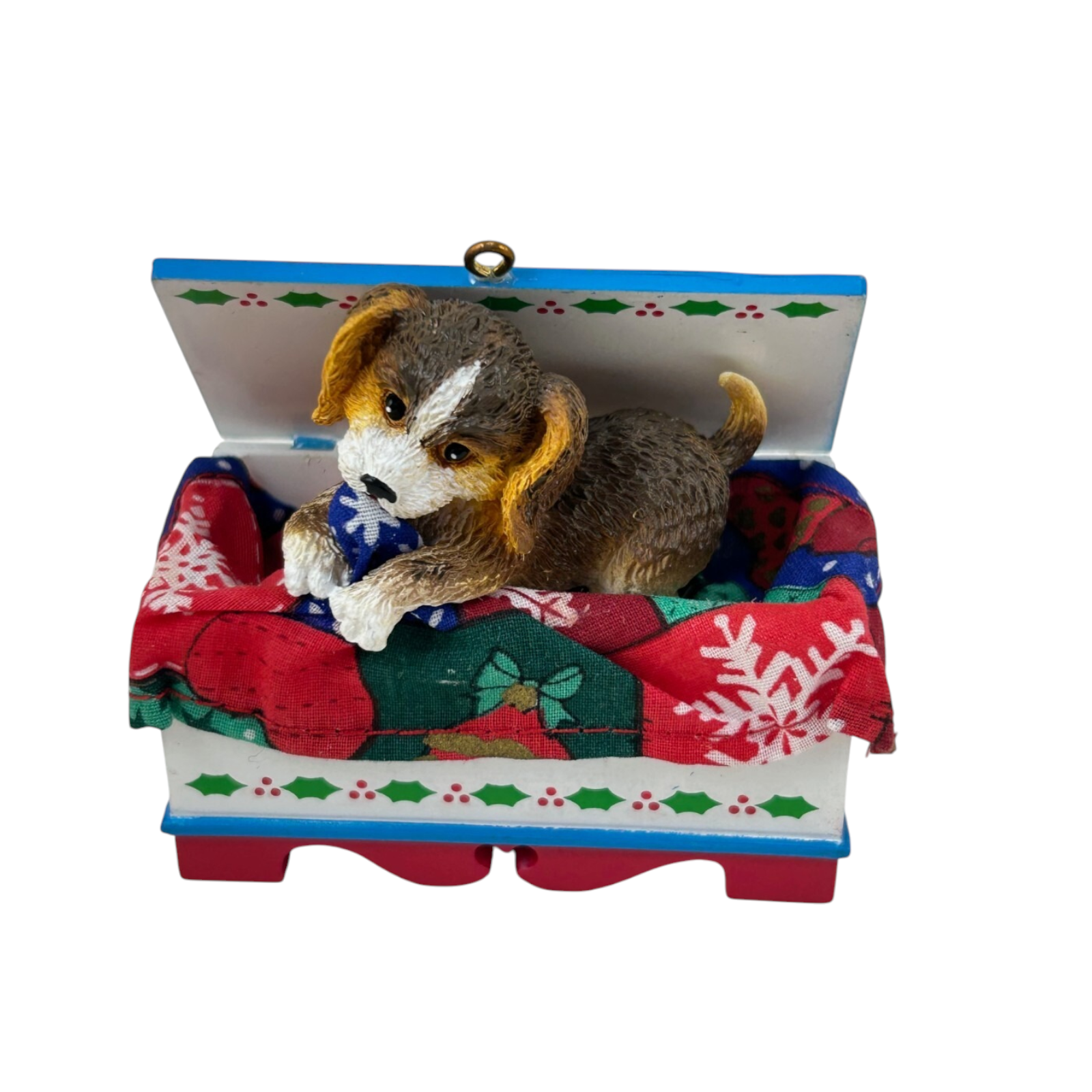This charming keepsake ornament from the Carlton Cards Heirloom collection depicts an adorable beagle puppy poking into a vintage quilt-covered trunk filled with holiday fluff and mischief. With molded resin or plastic construction, hand-painted detailing and a festive holiday scene that evokes warmth and playful chaos, it appeals both to animal-theme and vintage-ornament collectors alike. The thematic idea of “trouble” in a trunk adds storytelling appeal, making it a delightful decorative accent and collectible. Its date-specific release and series branding enhance its status as a meaningful holiday keepsake.